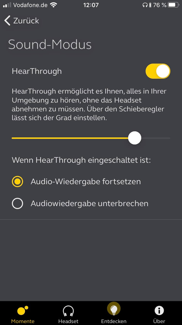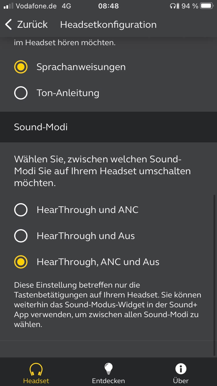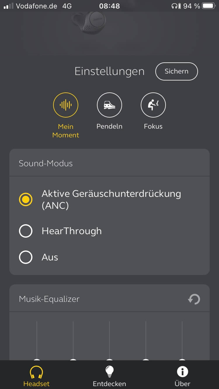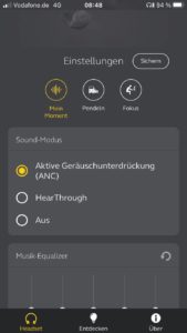 Nach etwa 15 Minuten Download und Übertragung auf die Hardware steht das neue „Standard-ANC“ zur Verfügung. In der App gibt es eine neue Karte, in welcher man den Soundmodus wählen kann: „ANC“, „HearThrough“ oder Nichts von beidem. Beim Punkt „HearTrough“ kann man direkt nach dem Aktivieren die Durchlässigkeit per Schieberegler justieren. Wie immer gilt: je weiter geöffnet wird, desto mehr rauscht es über die Außenmikrofone in den Ohren – vor allem wenn dann noch Wind im Spiel ist.