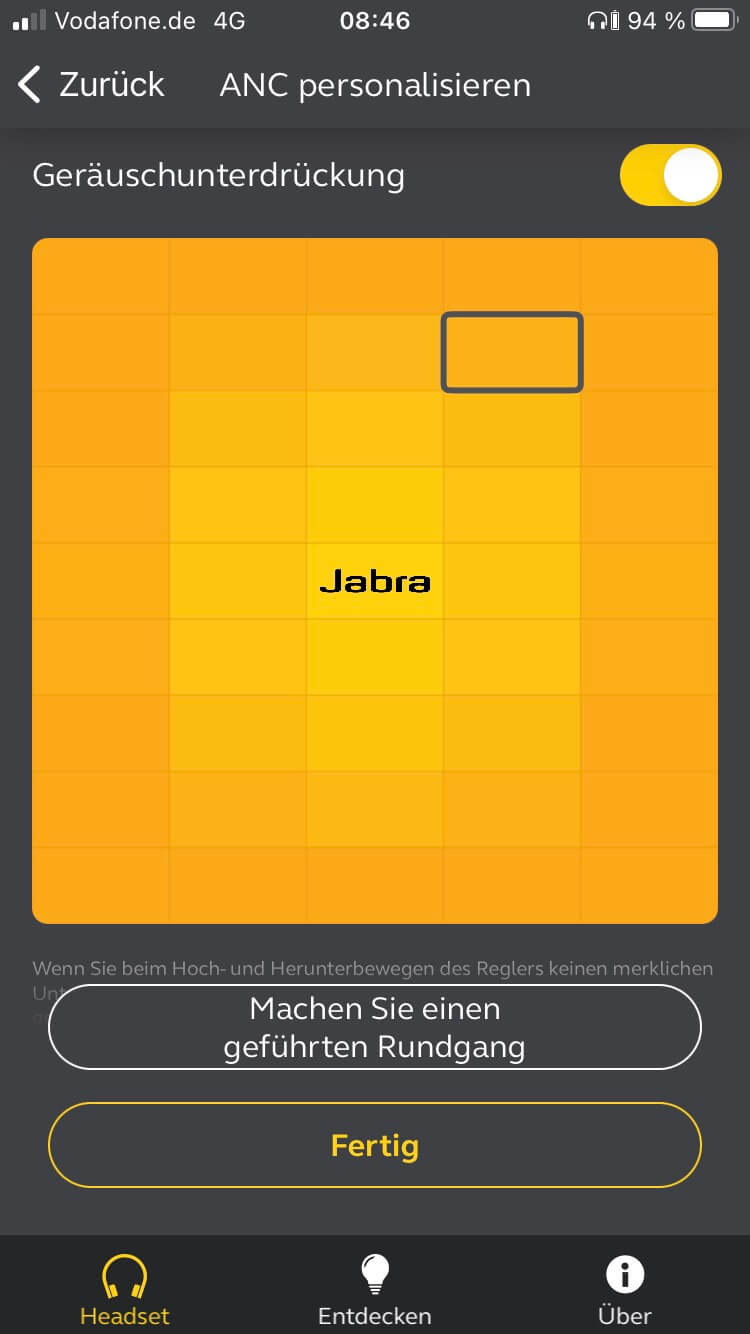 Das Feintuning des ANC erfolgt etwas tiefer in den Einstellungen. Auf einer quadratischen Matrix wird der Punkt angesteuert, an welchem einem die Auslöschung der Umgebung am angenehmsten oder vollkommensten oder eine Mischung aus beidem erscheint. Man kann sehr gut verfolgen, in welchem Bereich des Quadrats welche Frequenzen wie stark bearbeitet werden, damit sie genügend gedämpft werden können. Dabei bekommt man auch ganz gut mit, dass tendenziell nur die tiefen Frequenzen eine Auslöschung erfahren und es nicht so effektiv eliminiert wird, auch wenn ein deutlicher Taucherglockeneffekt auftritt. Das ANC der 75t ist mild. Es reduziert die tiefen Anteile des Rumpelns der einfahrenden Straßenbahn und auch die Baustelle vor dem Büro bekommt das Fundament entzogen, der Rest dringt aber immer noch deutlich zu den Ohren durch. Die reduzierende Wirkung hält sich also in Grenzen und bleibt weit hinter der Leistung von z.B. den aktuellen Bose QuietComfort Earbuds (zum Test) zurück. Aber: für eben mal so ist das ANC in den Elite 75t brauchbar, zumal sich klanglich beim Zuschalten wenig verändert und der Rauschpegel kaum ansteigt. Die Laufzeit der 75t reduziert sich bei dauerhaft geschaltetem ANC um etwas mehr als zwei Stunden auf knapp fünf Stunden. Was soll‘s? Dafür bekommt man etwas mehr Ruhe.
