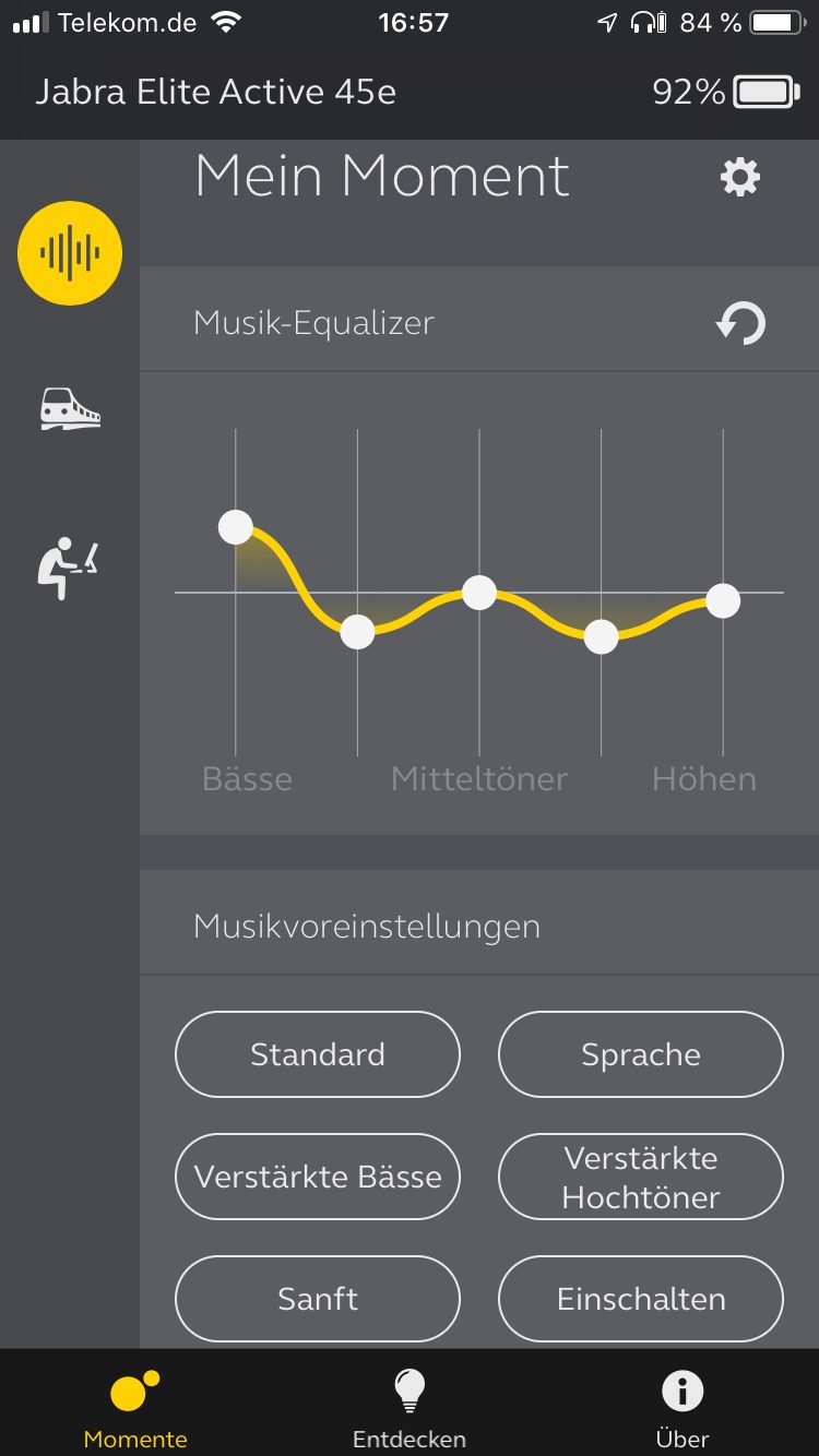 Über die optional für iOS- und Android-Systeme angebotene Jabra Sound+ App sind die Hörer einerseits updatefähig. Zugleich besteht die Möglichkeit, persönliche Präferenzen wie das Verhalten bei eingehenden Anrufen festzulegen. Auch die in verschiedenen Sprachen zur Verfügung stehende Sprachführung der Ear-Buds ist per App jederzeit ein- und ausschaltbar. In sogenannten Situationsprofilen wie „Mein Moment“ oder „Pendeln“ können darüber hinaus Klanganpassungen durch vorkonfigurierte Settings (z.B. mit verstärkten Bässen) oder per 5-Band-Equalizer vorgenommen werden. Ergänzend bietet das Situationsprofil „Fokus“ die Option Umgebungsgeräusche mithilfe von abspielbaren Soundscapes wie Wellen- oder Wasserfallgeräusche auszublenden.
