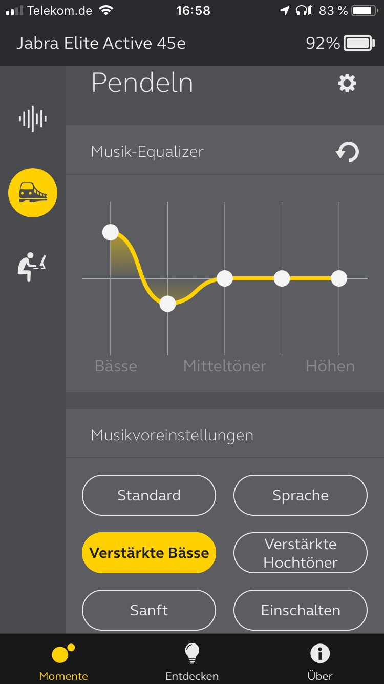 Die Elite Active 45e besitzen ein klares, helles Klangbild mit trockenen Bässen, die in den oberen Bassfrequenzen Präsenz zeigen. Druckvolle Mitten stellen Vocals gekonnt in den Vordergrund, während die Höhen ein wenig überrepräsentiert erscheinen und bei höherem Pegel zur Überzeichnung von Zischlauten neigen. Der Klang ist zwar durchsetzungsfähig, lässt aber den Tiefgang in den Bässen vermissen, wenn beim Sport eine kraftvolle Unterstützung gewünscht ist. Dieses Manko kann jedoch per App beseitigt werden, indem der Tiefbassbereich entsprechend angehoben wird. Wem die Höhen darüber hinaus zu dominant sind, kann diese leicht abschwächen, was in der Kombination mit dem erstarkten Bassfundament wahre Wunder bewirkt. Somit sind auf Wunsch auch treibende Beats realisierbar, zumal die Ear.