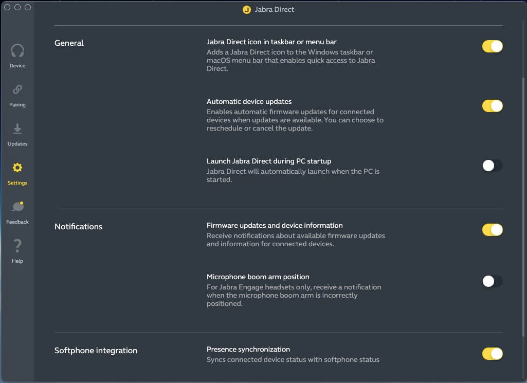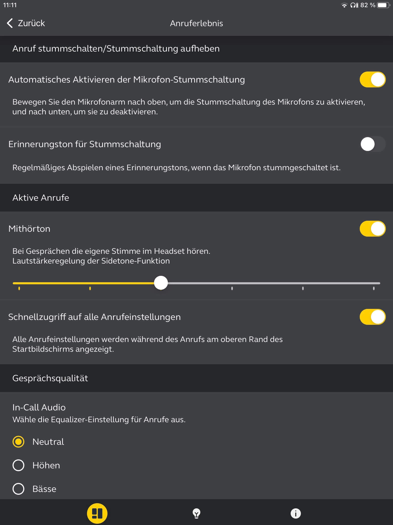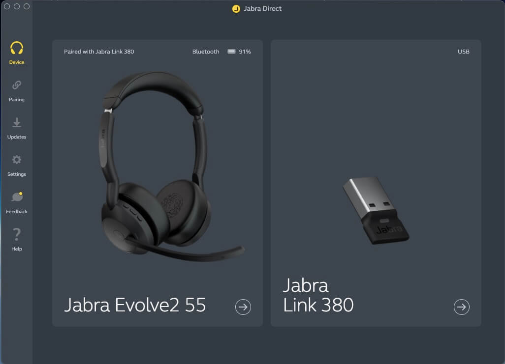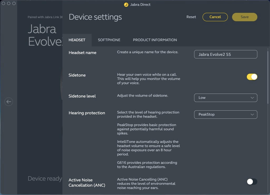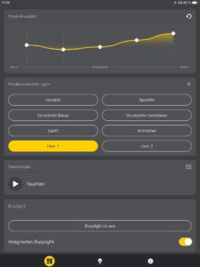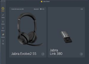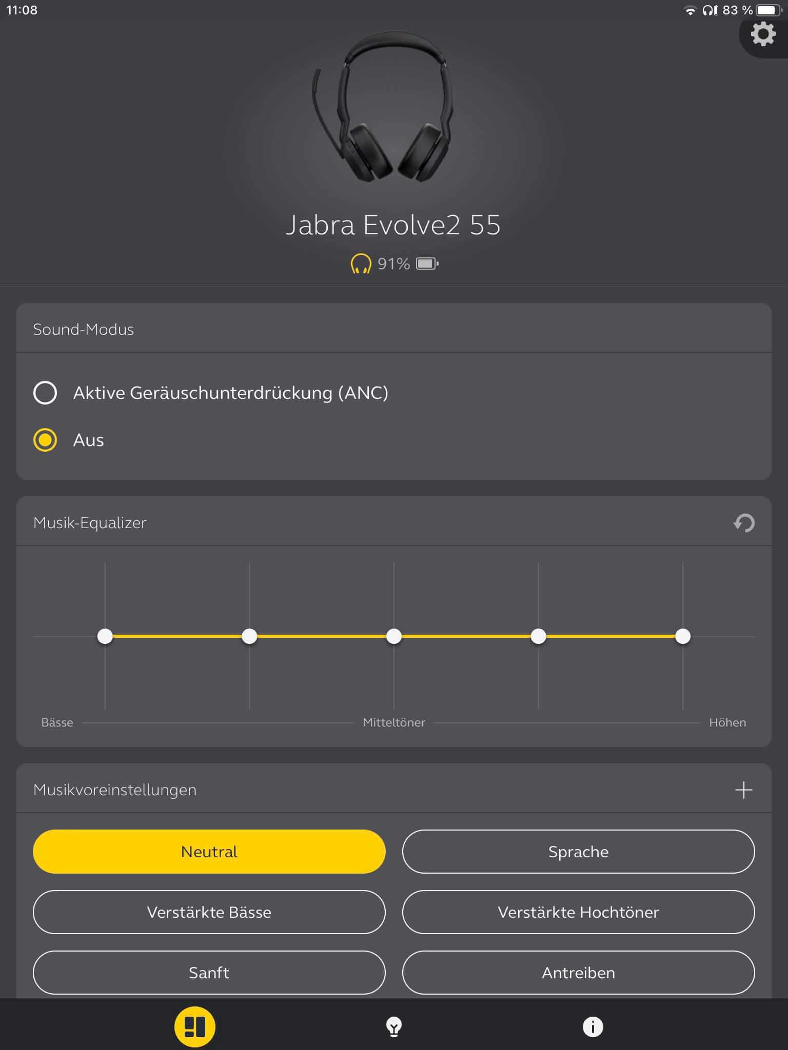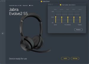 Über die Software-Anbindung für Windows- oder Mac-Systeme und die App für Android- sowie iOS-Geräte stehen zahlreiche Telefonie- und Klangeinstellungen zur Verfügung, um das Jabra Evolve2 55 den persönlichen Bedürfnissen entsprechend einrichten zu können. Dies beginnt beim Gehörschutz oder dem Konfigurieren von Mikrofonarm, Sprachansagen und Feedback-Tönen. Des Weiteren kann der Klang über eine gelungene EQ-Sektion angepasst werden, wobei sich per App wie bereits beim Jabra Evolve2 75 zusätzlich ein MySound-Hörprofil generieren lässt, das beispielsweise einer altersbedingten Abnahme des Hörvermögens entgegenwirkt. Auch verschiedene Soundscapes und eine Tracking-Funktion, die das Orten des Headsets ermöglichen soll, sind im mobilen Betrieb nutzbar. Darüber hinaus können über die Software und App Firmware-Updates vorgenommen werden.
