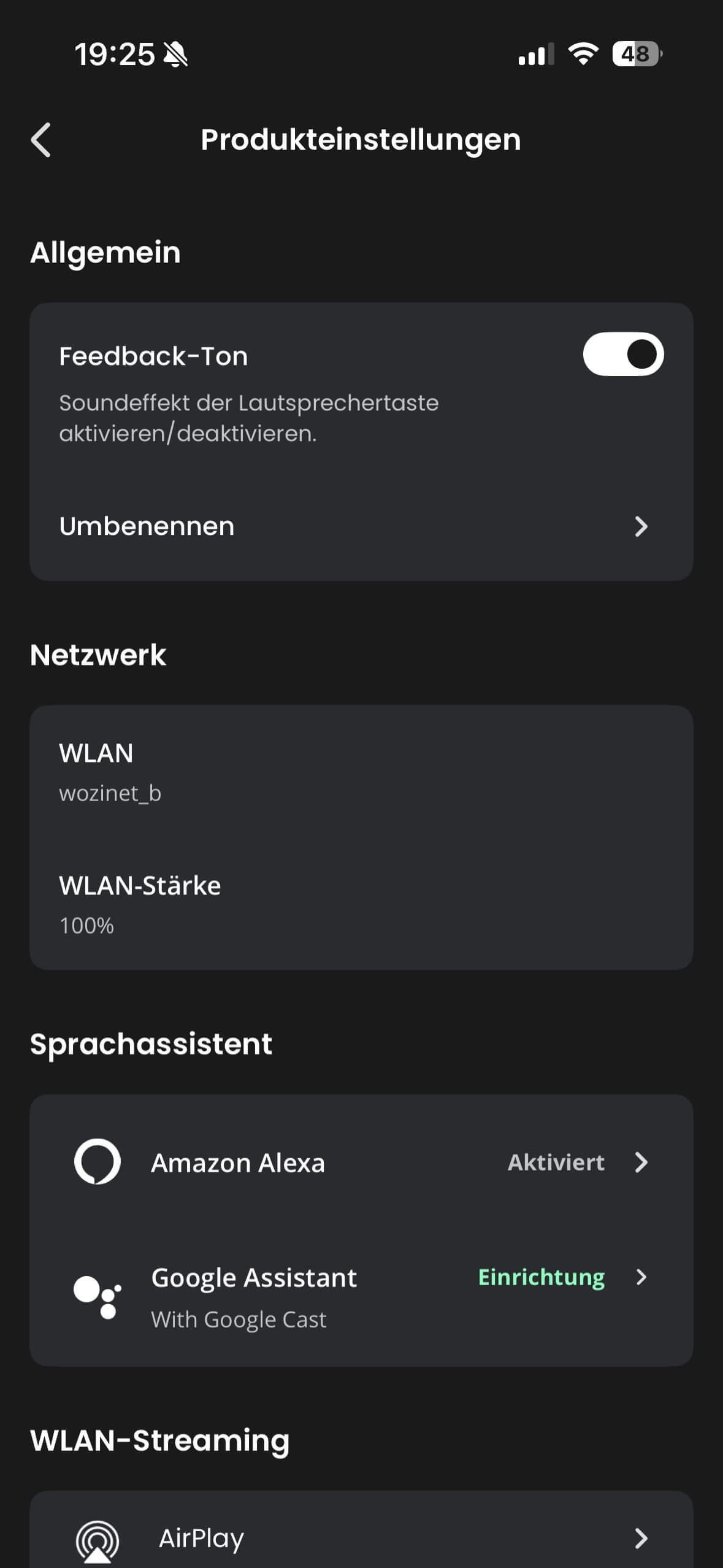 Allerdings erfordern beide Assistenten eine Installation der jeweiligen App auf einem Device und dann eine Zuordnung zur Box. was sich bei mir – der ich diese Assistenten nicht nutze – als etwas kompliziert zu machen und unbefriedigend im Ergebnis erwiesen hat. Alexa sagte die Außentemperatur stoisch in Fahrenheit an und konnte (oder wollte) nur auf die integrierten Musikdienste zugreifen – mein primär genutztes Apple Music war nicht dabei und bei Prime Music wollte mir die freundliche Stimme immer ein kostenpflichtiges Upgrade andrehen.