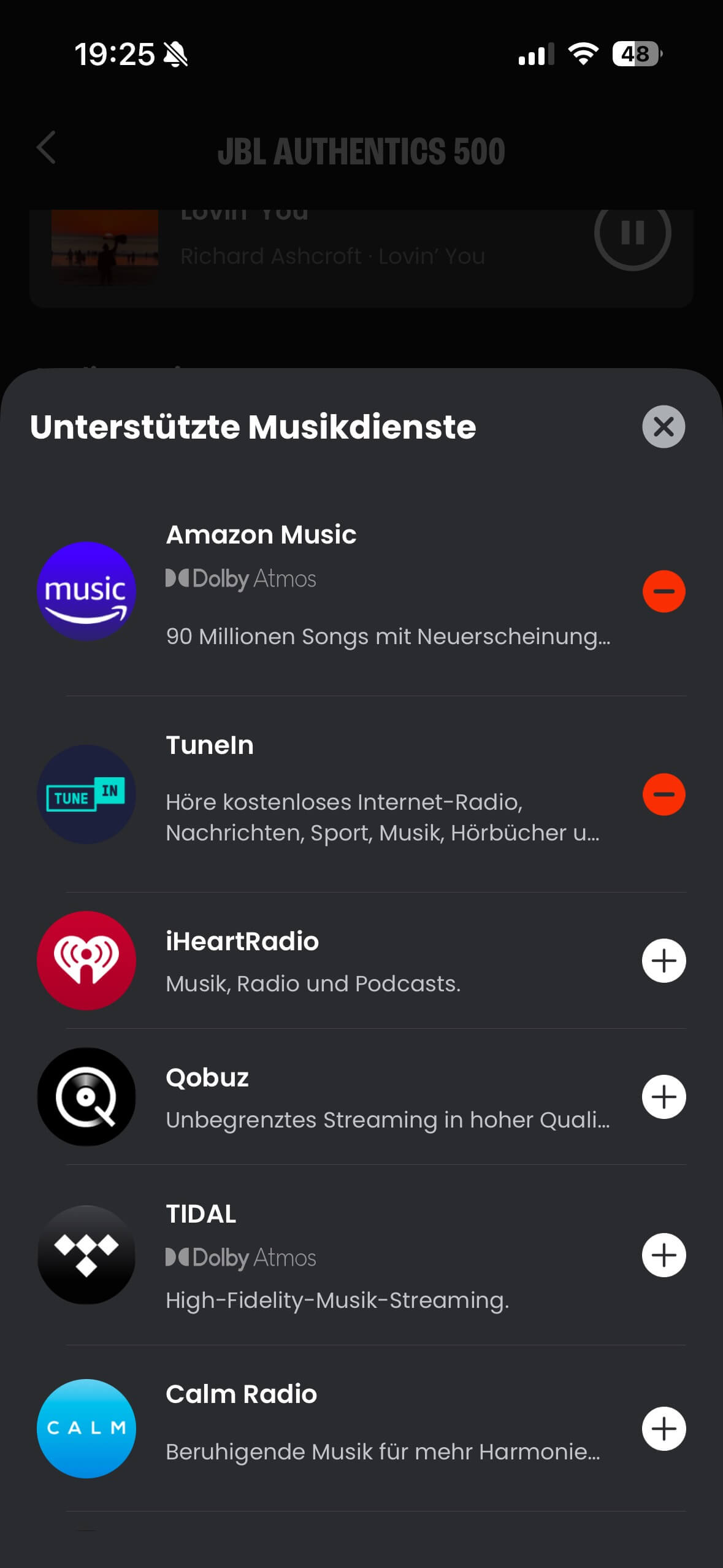 In der Sektion Musik können folgende Streamingdienste ausgewählt werden mit denen sich die Box direkt verbinden kann: Amazon Music, TuneIn, iHeart Radio, Qobuz, Tidal, Calm Radio, Napster. Andere Anbieter wie Apple Music können dann nur via Airplay abgespielt werden und sind auch nicht über Alexa oder Google Assistant ansprechbar. Die Dolby Atmos-Funktion kann übrigens nicht geschaltet werden – sie aktiviert sich selbstständig, sobald ein entsprechender Mix vorliegt.