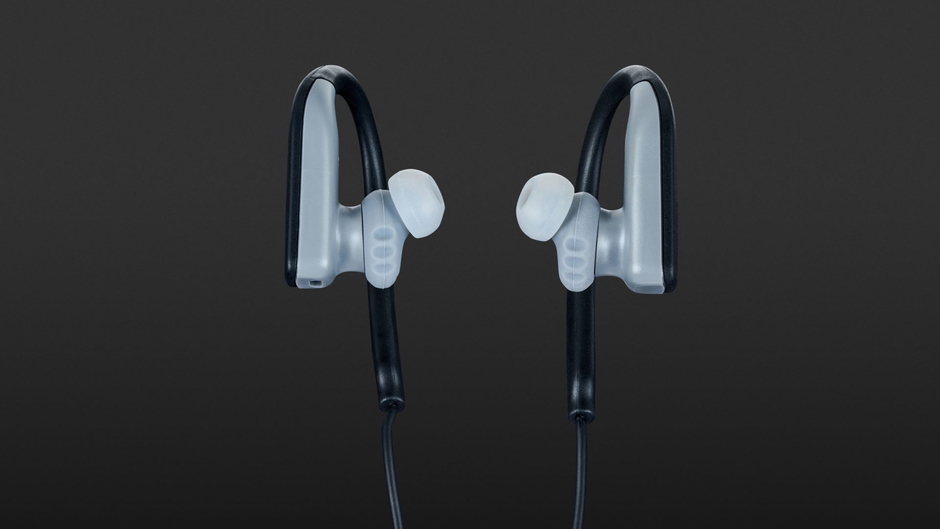 Das Treibergehäuse der Bluetooth-Sportkopfhörer, auf dem die Ohrstöpsel sitzen, ist oval geformt sowie abgewinkelt, um einen guten Sitz zu erzielen. Darüber hinaus werden die Ohrstöpsel nicht ausschließlich im Gehörgang, sondern zusätzlich in der Ohrmuschel getragen, was den Tragekomfort, die Abschirmung und die Stabilität weiter erhöht. Da die Konstruktion zusätzlich über anpassungsfähige Ohrbügel verfügt, die hinter den Ohren geführt werden, ist ein Herausfallen der Kopfhörer auch bei schnellen, ruckartigen Bewegungen quasi ausgeschlossen. Das Anlegen der Sport-In-Ears erfordert zwar ein wenig Geduld und Übung, da die ergonomisch geformten Ohrstöpsel mit dem Ohrmuschelelement durch eine Vierteldrehung im Ohr in die richtige Trageposition gebracht werden müssen. Ist dies erfolgt, bieten die Sportkopfhörer jedoch viel Bewegungsfreiheit und trotz ihrer Größe und eines Gewichts von 27g einen guten Tragekomfort.