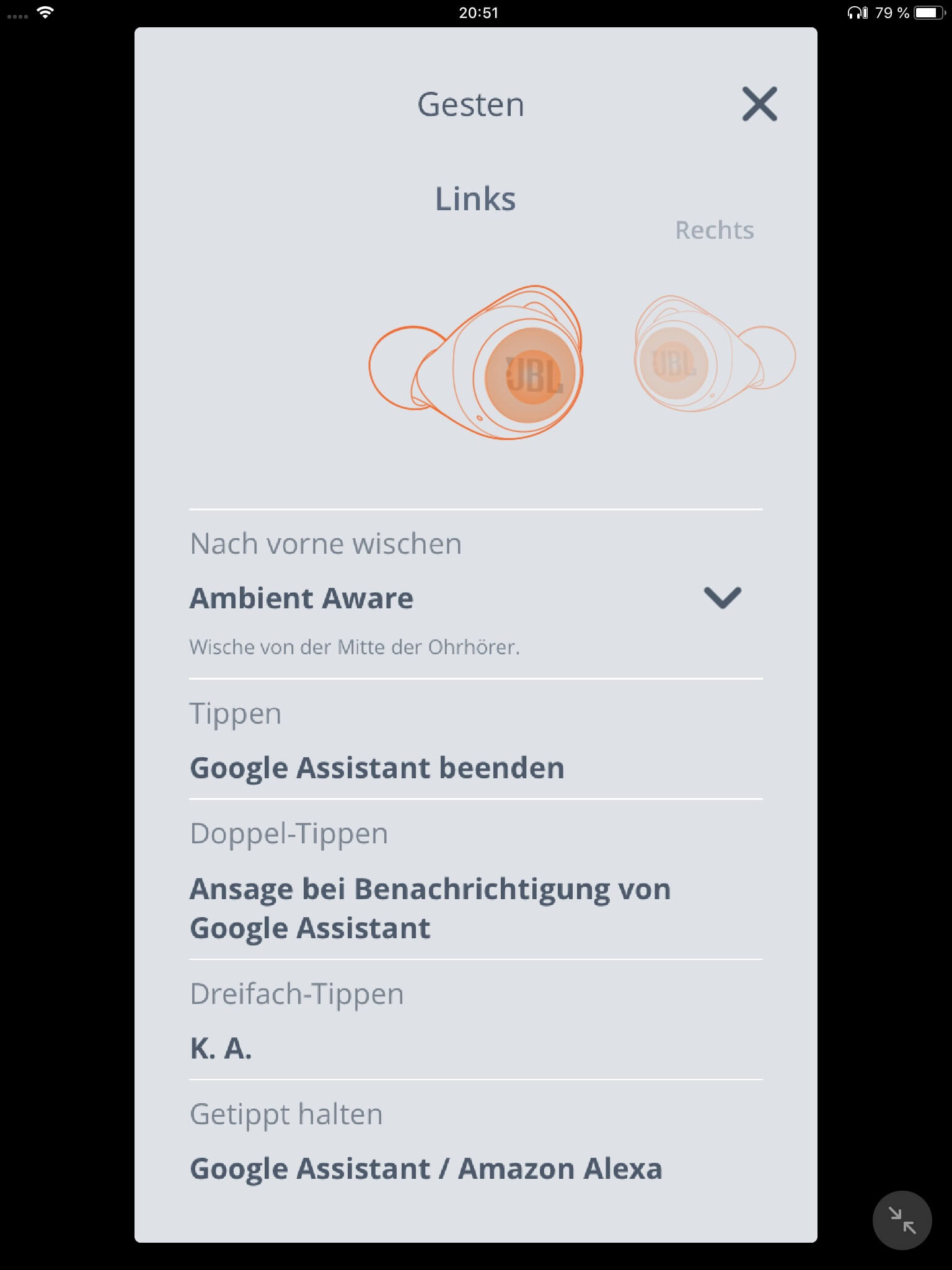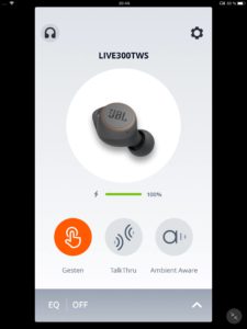 Über die kostenlose JBL Headphones App bestehen umfangreiche Personalisierungsmöglichkeiten wie beispielsweise eine Klanganpassung per EQ. Dieser bietet einerseits vorgefertigten Presets wie „Jazz“, „Vocals“ oder „Bass“. Zudem können jedoch auch eigene Einstellungen vorgenommen und gespeichert werden. Nicht nachvollziehbar erscheint mir zwar, dass lediglich die TalkThru- oder Ambient-Aware-Technologie einer Gestensteuerung zugewiesen werden kann und nicht beide. Gut gelöst ist hingegen, dass Funktionen wie die „Ohrerkennung“ der Hörer, die ein automatisches Pausieren der Wiedergabe beim Herausnehmen bewirkt, per App frei (de-)aktivierbar sind. Von Vorteil ist auch, dass Firmware-Aktualisierungen vorgenommen werden können.