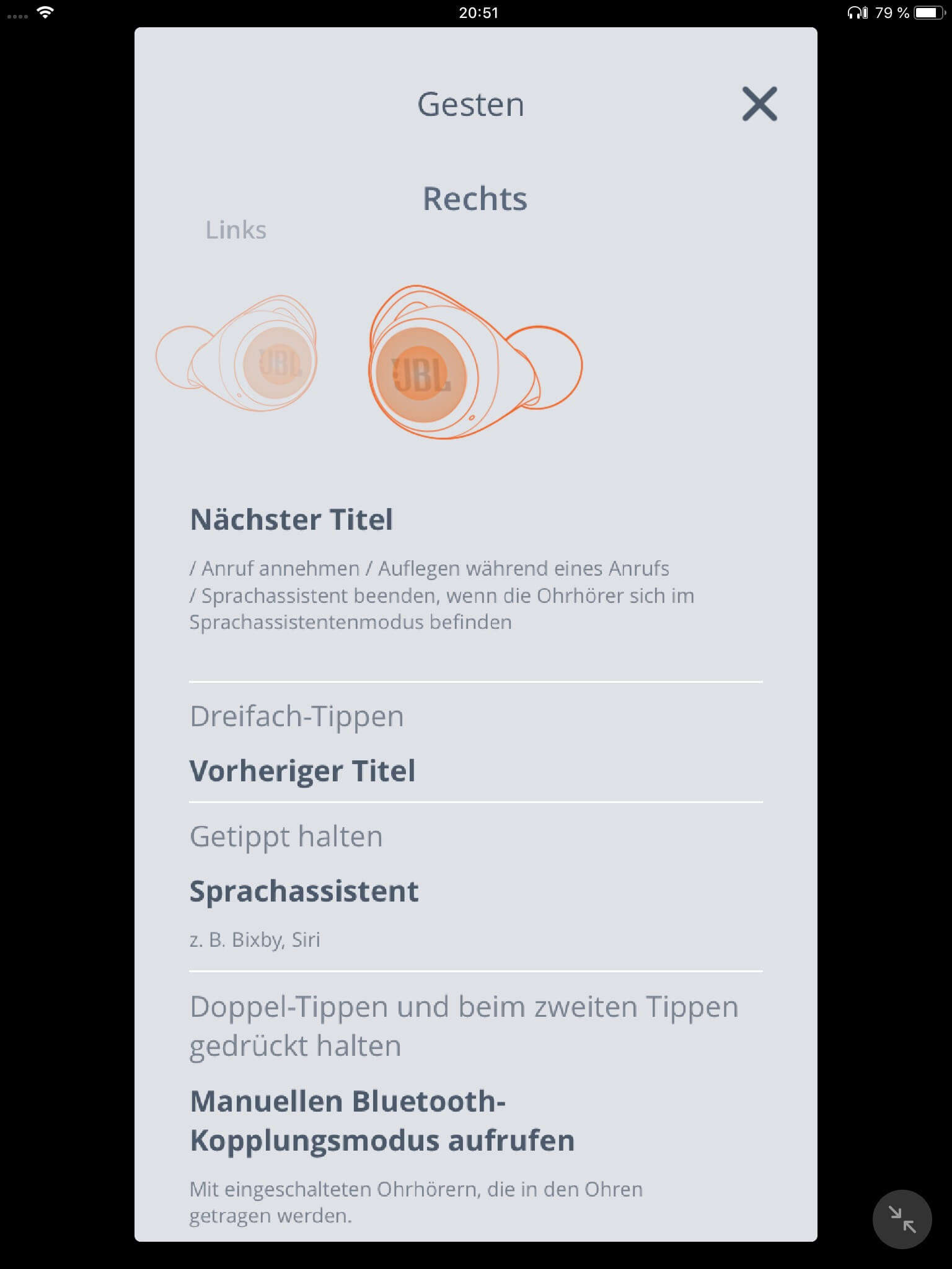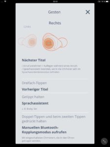 Das Koppeln der Wireless-Hörer, die im Verbund mit verschiedenen iOS- und Android-Geräten überdurchschnittlich hohe Reichweiten von bis zu zwölf Metern boten, kann direkt mit dem Öffnen des Cases erfolgen. Hierdurch wird das System eingeschaltet und automatisch in den Pairing-Modus versetzt, während das Zurücklegen in die Ladevorrichtung das Ausschalten bewirkt. Alternativ kann der rechte Hörer, welcher als Master fungiert, auch einzeln im Single-Betrieb genutzt werden. Besteht eine Funkverbindung, dient ein Antippen der rechten Höreroberfläche zum Starten und Stoppen der Wiedergabe, während durch doppeltes Tippen Telefonate angenommen sowie beendet und zum nächsten Titel vorgesprungen werden kann. Ein Zurückspringen ist hingegen durch dreifaches Antippen möglich. Siri oder Bixby können ebenfalls genutzt werden, indem die Fläche zunächst kurz und anschließend länger berührt wird. Wer möchte, kann darüber hinaus über die JBL Headphones App eine Lautstärkeregelung aktivieren, die durch horizontales Wischen steuerbar ist. Linksseitig dient die Geste wahlweise zum Ein- und Ausschalten der Ambient-Aware- oder TalkThru-Funktion sofern dies zuvor per App eingerichtet wurde. Allerdings muss das Wischen ziemlich ruckartig und schnell erfolgen, da die Geste ansonsten als Antippen interpretiert wird, was aus meiner Sicht ein gewisses Manko darstellt. Ansonsten reagiert die Touch-Steuerung jedoch exakt sowie zuverlässig und auch die Sprachverständlichkeit beim Telefonieren ist ausgesprochen gut.