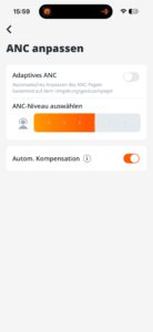 Die Wirkung des ANC ist gut, aber nicht so gut wie bei den Platzhirschen von Bose, Apple oder Sony. Tiefe Frequenzen werden wirksam gedimmt, sie verstummen aber nicht und höhere Frequenzen gelangen immer noch zum Ohr. Zum Transparenzmodus gesellt sich dann ein durchaus bemerkbares Rauschen, je nachdem, wie hoch du die Wirkung stellst. Dieses Rauschen wird noch mal etwas kräftiger beim Talk Thru.