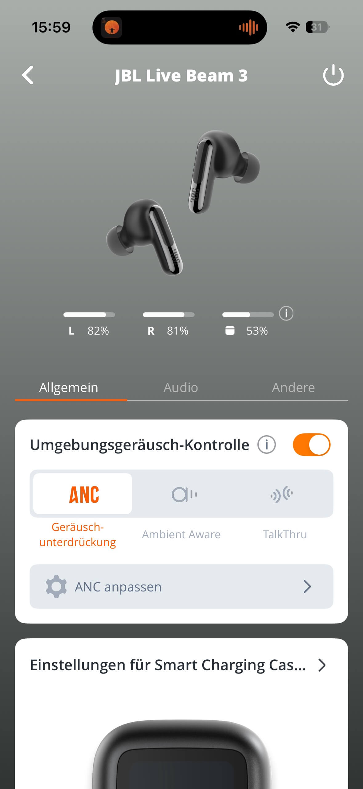 Da die JBL Live Beam 3 aber schon gut – mit den passenden Eartips – mechanisch (passiv) abschotten und sich das auch mit einem Passformtest überprüfen und korrigieren lässt, ist die ANC/Transparenz-Wirkung auf jeden Fall solide.