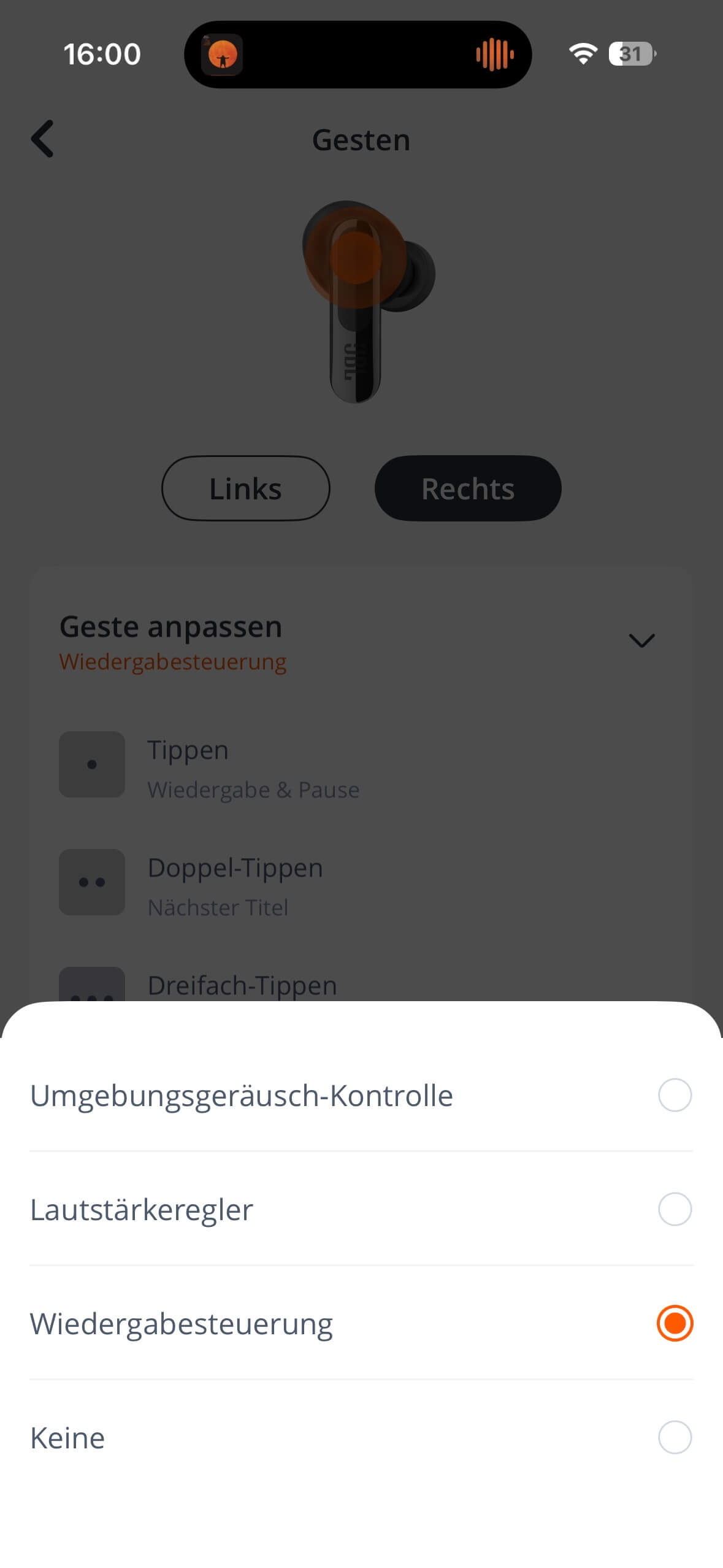 Die Wirkung des ANC ist gut, aber nicht so gut wie bei den Platzhirschen von Bose, Apple oder Sony. Tiefe Frequenzen werden wirksam gedimmt, sie verstummen aber nicht und höhere Frequenzen gelangen immer noch zum Ohr. Zum Transparenzmodus gesellt sich dann ein durchaus bemerkbares Rauschen, je nachdem, wie hoch du die Wirkung stellst. Dieses Rauschen wird noch mal etwas kräftiger beim Talk Thru.