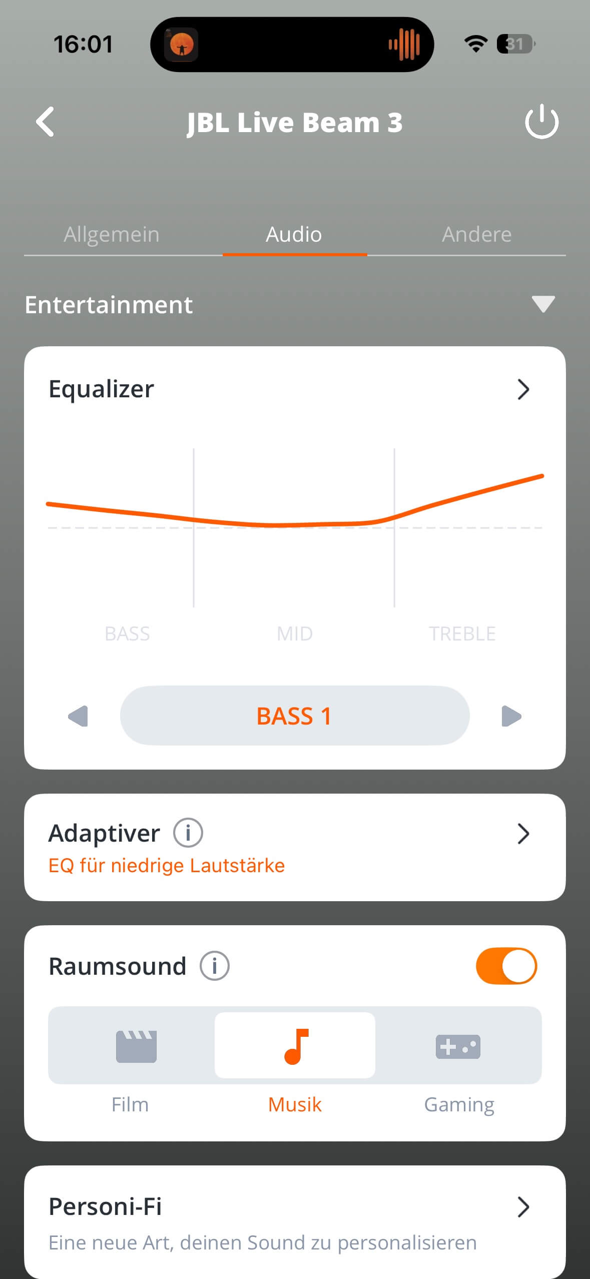 Die etwas unterentwickelte Basssektion kann umgehend über ein Preset oder im EQ-Setup hervorgeholt und gestärkt werden, damit auch die Drum- und Beat-Sektion oder die Bassgitarre zu ihrem Recht kommen. Insgesamt wirken die JBL Live Beam 3 angenehm neutral und bemühen sich grundsätzlich nicht so sehr um ein Charakteristikum.