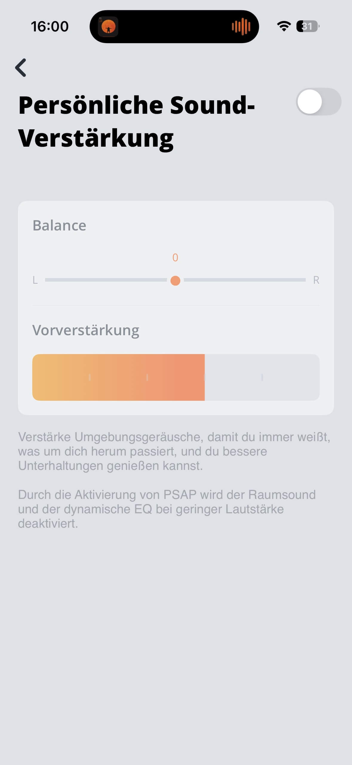 - Persönliche Sound-Verstärkung – hebt Umgebungsgeräusche an