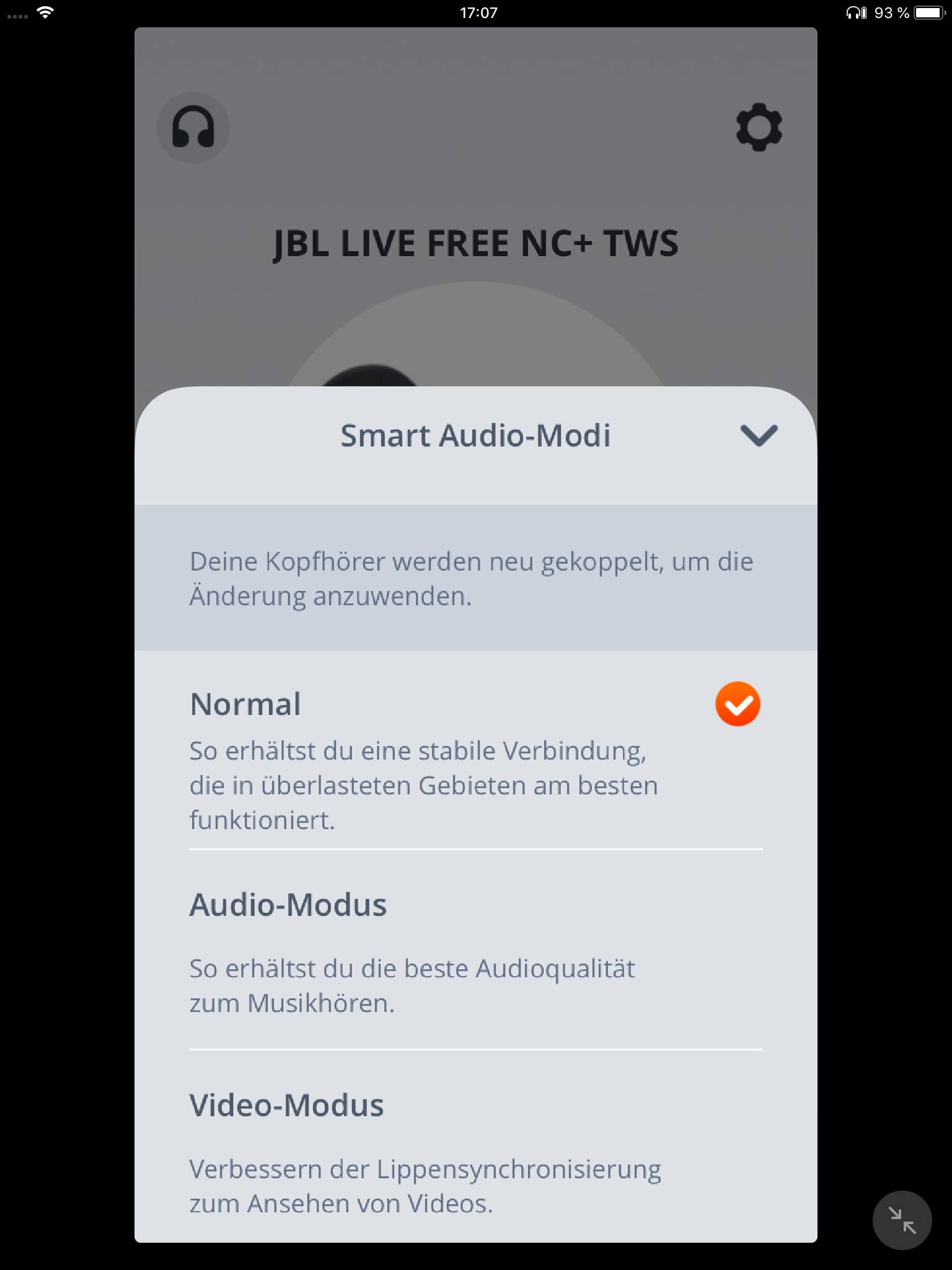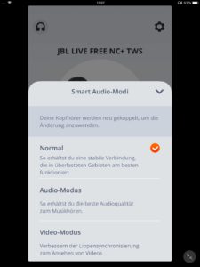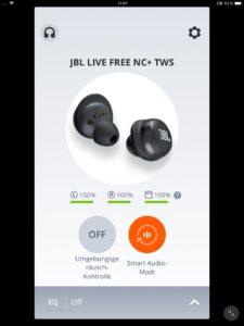 Die kostenlose App-Anbindung der In-Ears ist übersichtlich strukturiert und bietet neben einer exakten Akkustandsanzeige für Hörer und Case verschiedene Personalisierungsmöglichkeiten. Zur Klanganpassung steht ein EQ zur Verfügung, der zwar nicht viele vorgefertigte Presets zur Auswahl stellt, aber mehrere eigene Einstellungen speichert, so dass die Hörer bei Bedarf flexibel ausgerichtet werden können. Zudem sind drei sogenannte „Smart Audio-Modi“ vorhanden, die dem Hersteller zufolge entweder die Stabilität der Funkverbindung, die Audioqualität oder die Synchronität bei Filmen optimieren sollen. Ergänzend zu den bereits genannten Optionen wie der Belegung der Touch-Steuerung oder Einbindung von Sprachdiensten, ist beispielsweise auch eine Suchfunktion nutzbar, die per Piepton eine Ortung der Hörer ermöglicht. Firmware-Aktualisierungen können über die App ebenfalls erfolgen.