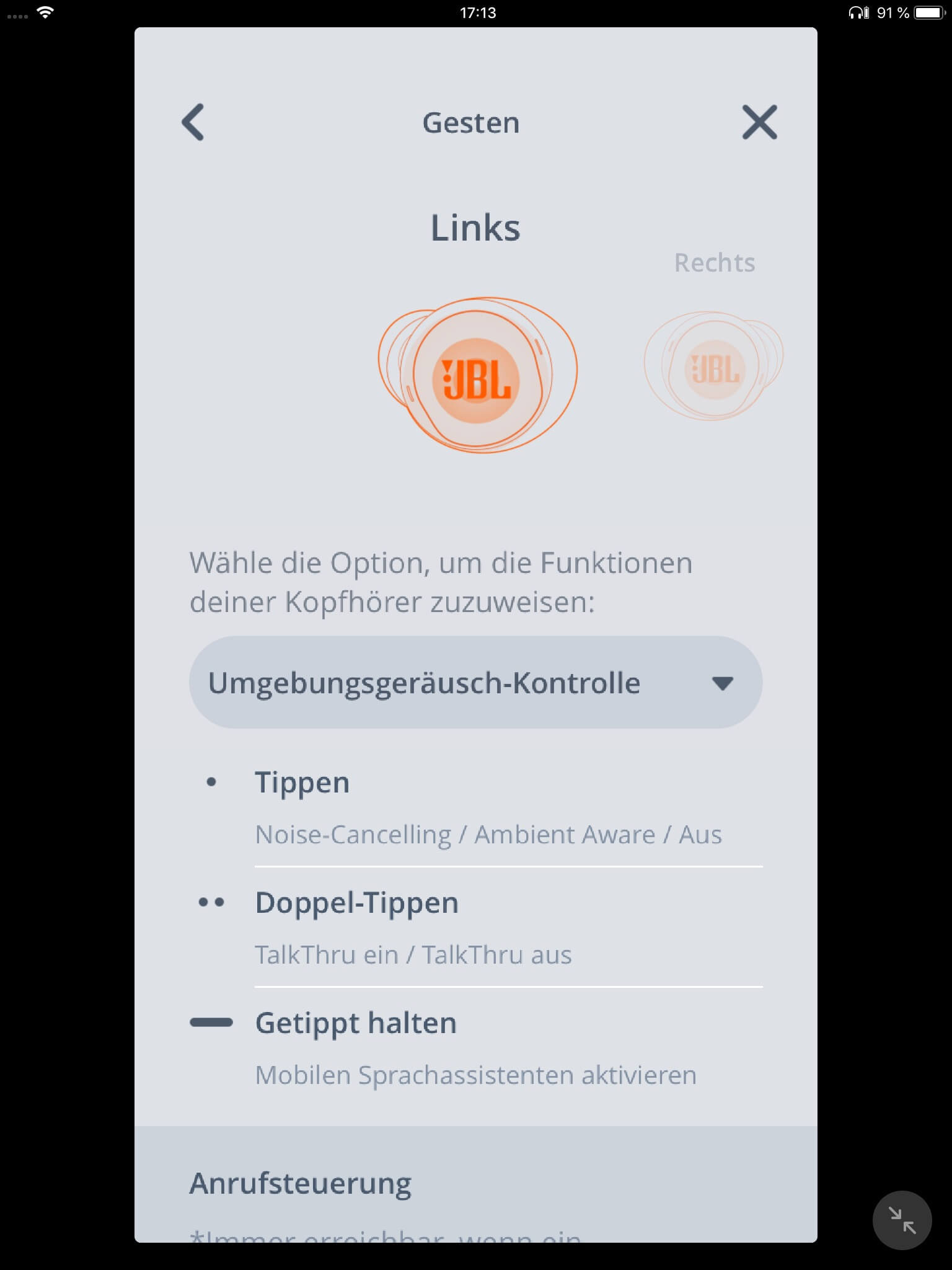 In der Werkseinstellung schaltet ein einfaches Antippen des linken Hörers zwischen ANC-, Umgebungsmodus und Grundklang um, während die Talkthru-Funktion durch zweifaches Tippen ein- und ausgeschaltet wird. Die rechte Seite steuert hingegen die Wiedergabe, wobei doppeltes Tippen zum Vor- und dreimaliges Antippen zum Zurückspringen dient. Telefonate können darüber hinaus beidseitig durch zweifaches Tippen angenommen und beendet werden. Ein Halten der linken oder rechten Seite aktiviert zudem Sprachassistenten. Allerdings erwies sich die Sprachverständlichkeit beim Telefonieren als etwas eingeschränkt, da die eigene Stimme recht verwaschen und leise dargestellt wird. Das Gegenüber ist zwar gut zu verstehen, klingt jedoch ein wenig dumpf. Einen positiven Eindruck konnte hingegen die Stabilität der Bluetooth-Verbindung vermitteln, die auch durch mehrere Räume hindurch nicht abbrach und innerhalb einer städtischen Bebauung eine Reichweite von bis zu elf Metern bot.