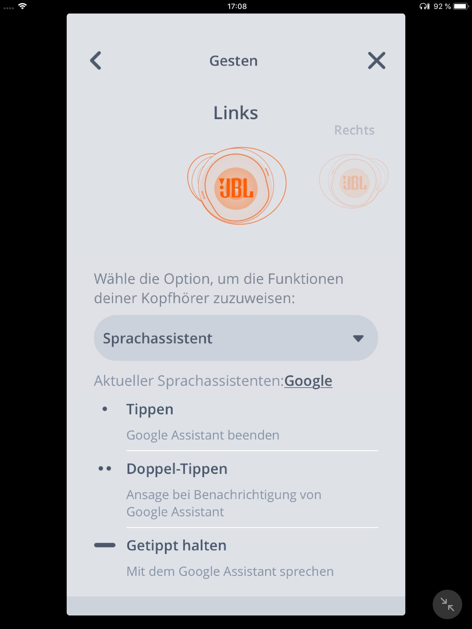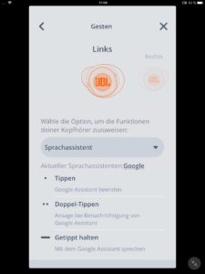 Bei der Nutzung von Google Assistant zeigten sich jedoch Konnektivitätsprobleme, was von vorherigen JBL-Hörergenerationen mit Sprachdienst-Integration nicht bekannt ist. Besteht eine Verbindung, funktioniert die Einbindung gut, indem durch das Halten der per App zugewiesenen Höreroberfläche jederzeit mit dem Assistenten kommuniziert werden kann. Hierbei lassen sich neben dem Abfragen von Informationen auch Nachrichten vorlesen und beantworten. In Kauf genommen werden muss allerdings, dass sich der Funktionsumfang der Gerätesteuerung deutlich reduziert, da die Sprachsteuerung eine Hörerseite vereinnahmt.