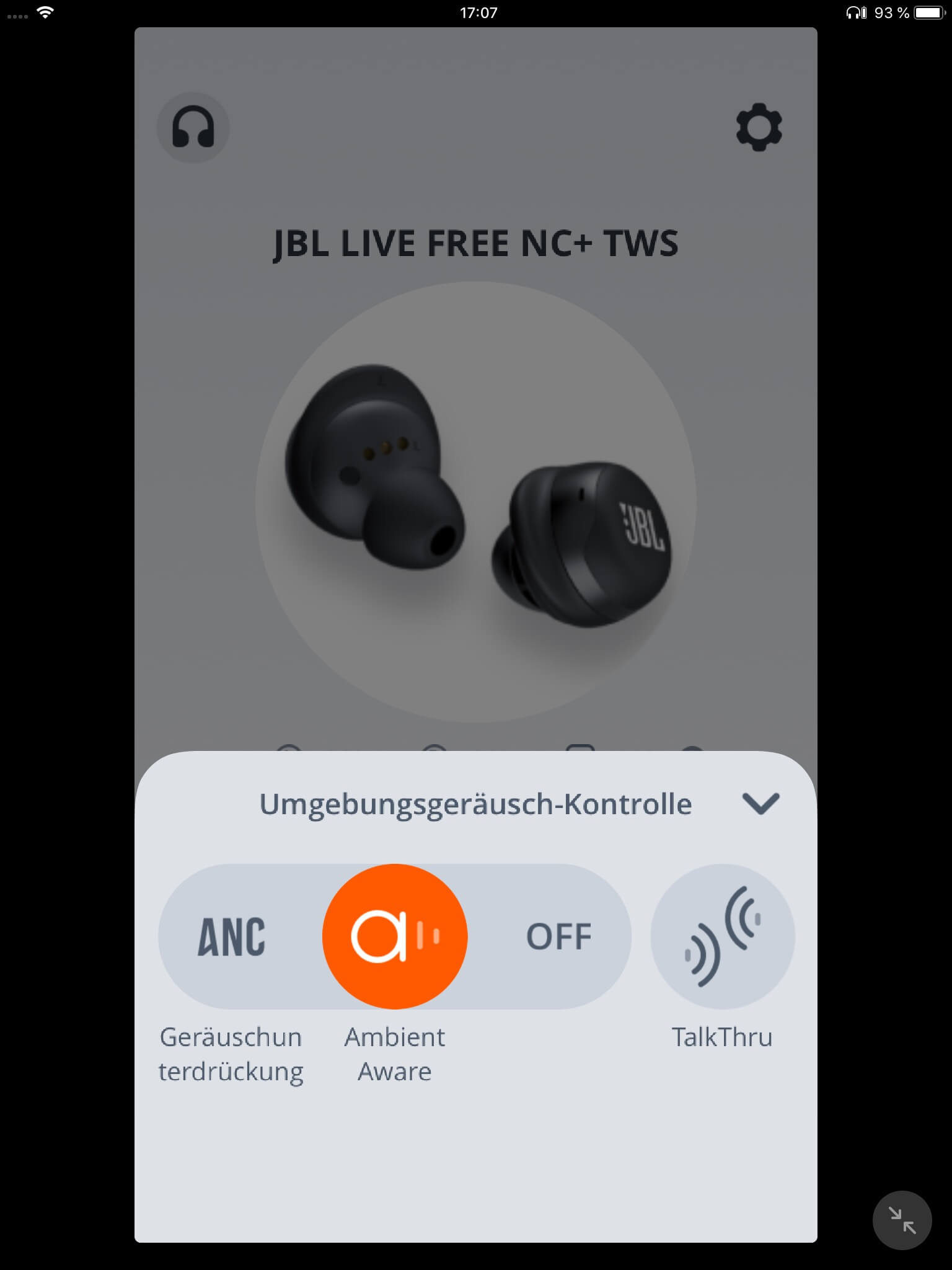 Was die Handhabung betrifft, erscheint die Umgebungsgeräuschkontrolle noch verbesserungswürdig, da ausschließlich über die App ersichtlich ist, ob der Grundklang, die Geräuschunterdrückung, der Umgebungsmodus oder die Talkthru-Funktion aktiv ist. Beim Umschalten erfolgt weder eine Sprachansage noch eine visuelle Rückmeldung. Auch der ANC-Modus zeigt Schwächen, indem hochfrequente Anteile kaum abgesenkt werden und die Filterung im unteren und mittleren Frequenzbereich zwar effektiver, aber immer noch eher subtil ausfällt. Ein gänzlich anderes Bild zeigt sich dagegen bei der Verstärkung von Außengeräuschen, auch wenn beide Modi ein wahrnehmbares Grundrauschen besitzen. Trotzdem werden im Umgebungsmodus vor allem mittlere und hohe Anteile sauber über die Mikrofone verstärkt, so dass Stimmen im direkten Umfeld noch bis zu einer mittleren Lautstärke verständlich bleiben und eine Orientierung selbst bei höheren Pegeln möglich ist. Die Talkthru-Funktion drosselt die Wiedergabelautstärke zudem deutlich, wodurch problemlos eine Unterhaltung geführt werden kann. Auch Lautsprecherdurchsagen sind in diesem Modus einwandfrei zu verstehen.