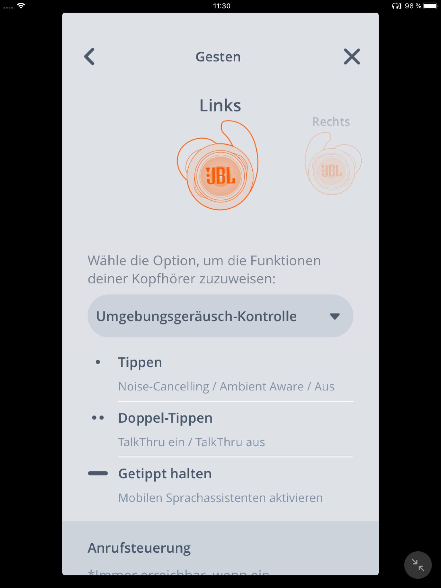 Während die In-Ears über eine recht hohe passive Abschirmung verfügen, zeigt die aktive Geräuschunterdrückung in der Standardeinstellung vor allem bei hochfrequenten und komplexen Störquellen Schwächen, da Straßenlärm oder ein Küchenradio im Hintergrund kaum merklich abgeschwächt wird. Dies ist jedoch vermutlich dem Umstand geschuldet, dass die ANC-Einstellung der App, die eine flexible Anpassung der Geräuschunterdrückung ermöglichen soll, zum aktuellen Zeitpunkt noch nicht einsatzbereit ist, was durch ein Update zu beheben wäre. Auswirkungen auf die Ambient-Aware- und Talkthru-Funktion bestehen hingegen nicht, die beide ihren Zweck erfüllen und Außengeräusche sauber über die integrierten Mikrofone verstärken ohne ein wahrnehmbares Grundrauschen zu erzeugen. Dabei behält der Umgebungsmodus die eingestellte Lautstärke bei und dient dazu die Außenwahrnehmung insgesamt zu steigern, während die Talkthru-Funktion eine Unterhaltung ermöglicht, indem der Wiedergabepegel abgesenkt und gezielt eine Verstärkung von Stimmen erfolgt. Als Manko erscheint allerdings, dass unabhängig von der App nicht ersichtlich ist, welcher Modus genutzt wird, da die Hörer keinerlei akustische oder visuelle Rückmeldung geben, ob die Geräuschunterdrückung, der Umgebungsmodus oder die Talkthru-Funktion aktiv ist.