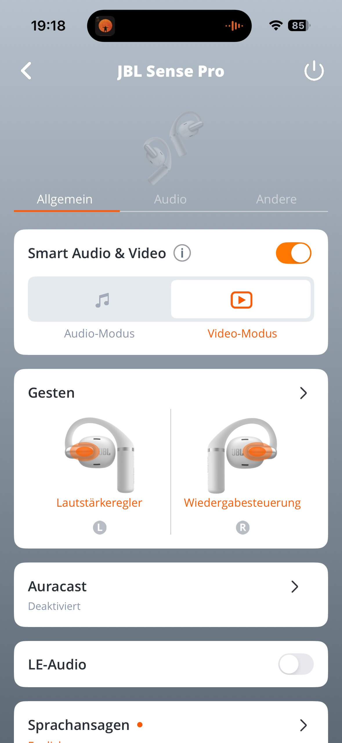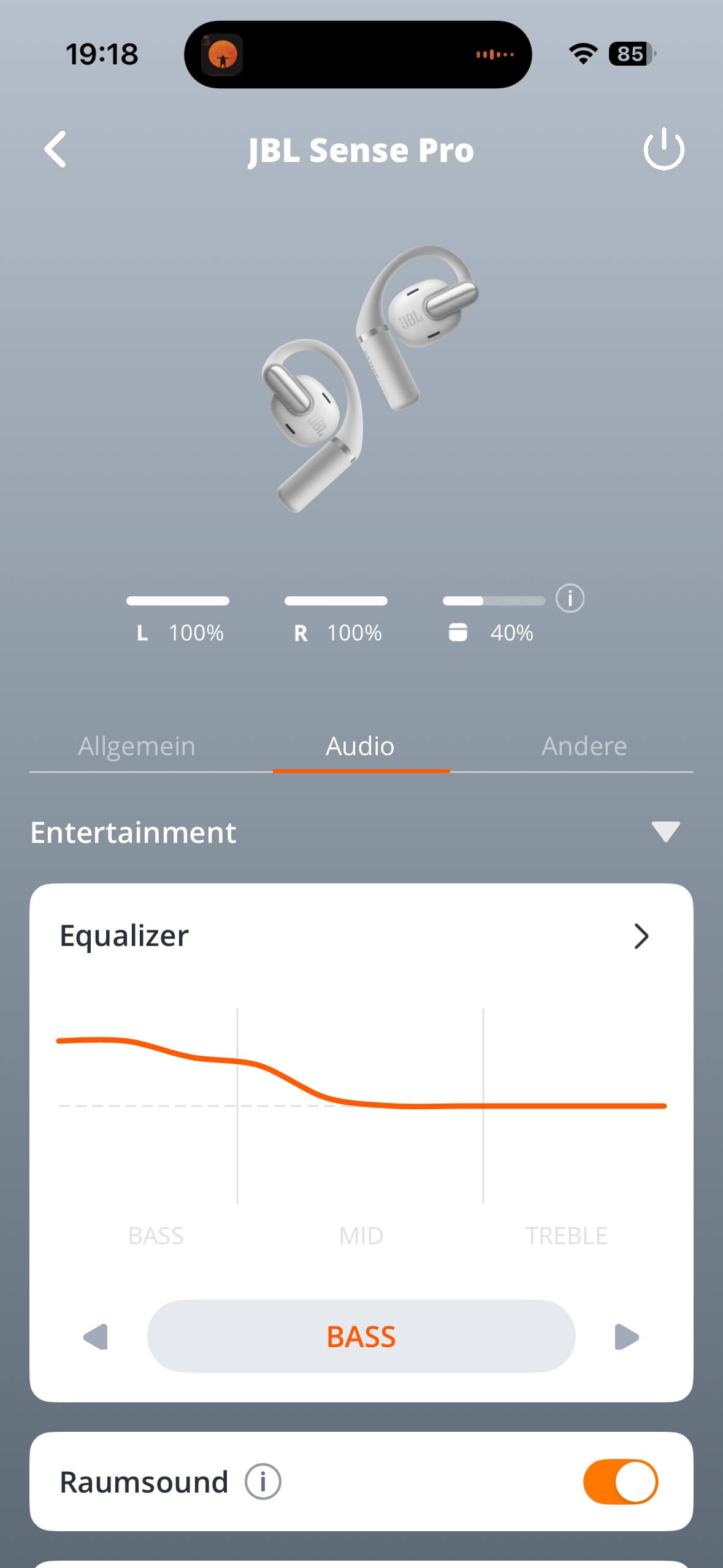 Zur Verringerung der Latenz, zum Beispiel fürs Gaming, kann man die JBL Sense Pro in einen Video-Modus umschalten. Und über den Reiter „Audio“ geht es zum Equalizer, der neben sechs Presets auch die Möglichkeit bereithält, eigene Settings über einen 10-Band-EQ zu erstellen und zu speichern. Das Spatial Audio – JBL nennt es schlicht Raumsound – lässt sich bei Bedarf zuschalten.