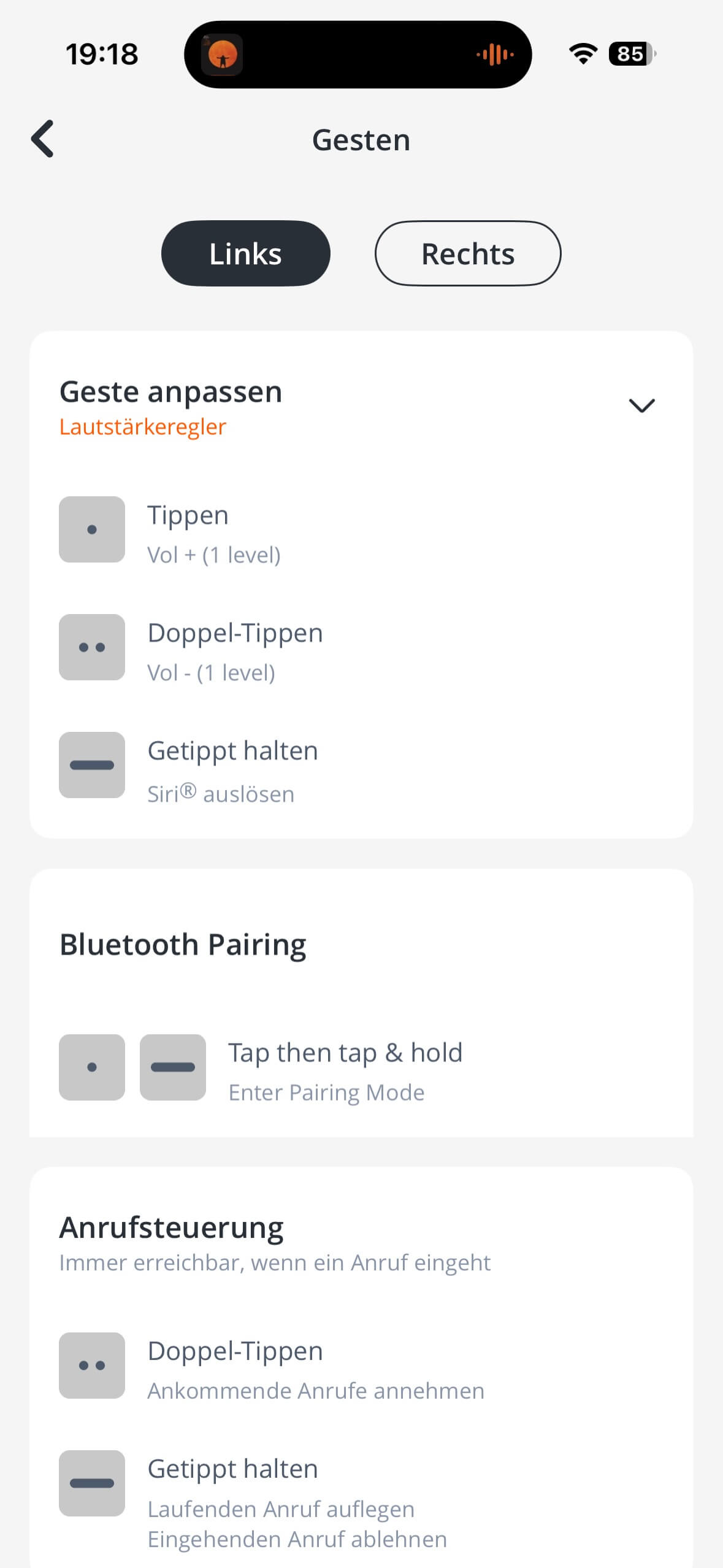 Zusammen mit der Headphones App lassen sich die zahlreichen Funktionen der JBL Sense Pro gut verwalten und den eigenen Bedürfnissen anpassen. Zunächst einmal lassen sich die Touchfunktionen aufteilen, wobei JBL allerdings nur Funktionsblöcke zulässt. Also alles zur Wiedergabe oder alles zur Lautstärke jeweils links oder rechts. Ich finde das etwas unpraktisch, da die Touchflächen, wie gesagt, sehr empfindlich regieren. Daher wäre es zum Beispiel sinnvoller, die Geste für einmal Tippen ganz zu deaktivieren, um Fehleingaben zu minimieren.