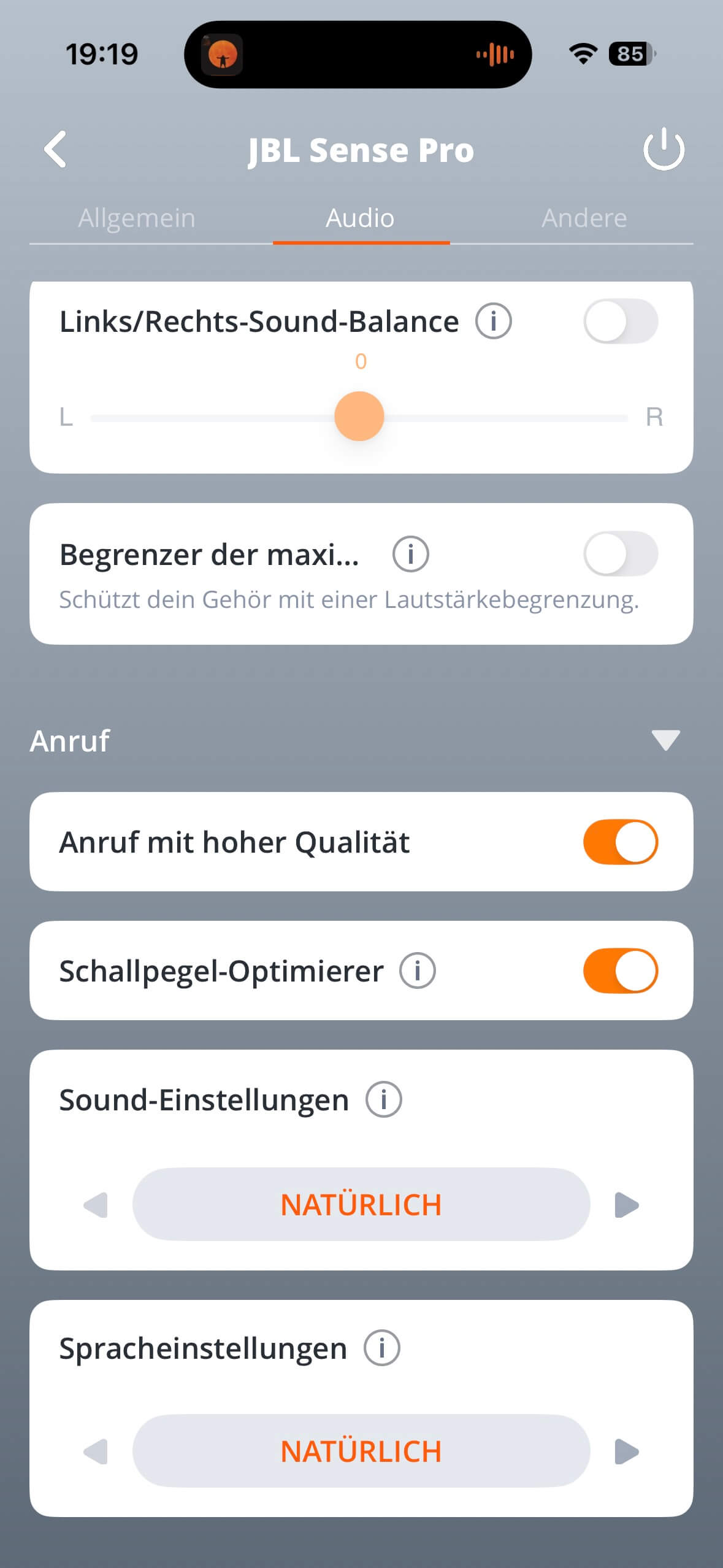 Mit der Option „Personi-Fi“ ermöglicht JBL ein Finetuning über einen Hörtest. Am Ende steht dann eine optimierte EQ-Kurve, die zum Hörvermögen passen soll. Dazu lässt sich noch der Stereo-Pan verstellen und für das Telefonieren gibt es auch einige Einstellmöglichkeiten, um zum Beispiel die eigene Stimme oder die des Angerufenen natürlicher, höher oder kräfiger wirken zu lassen.