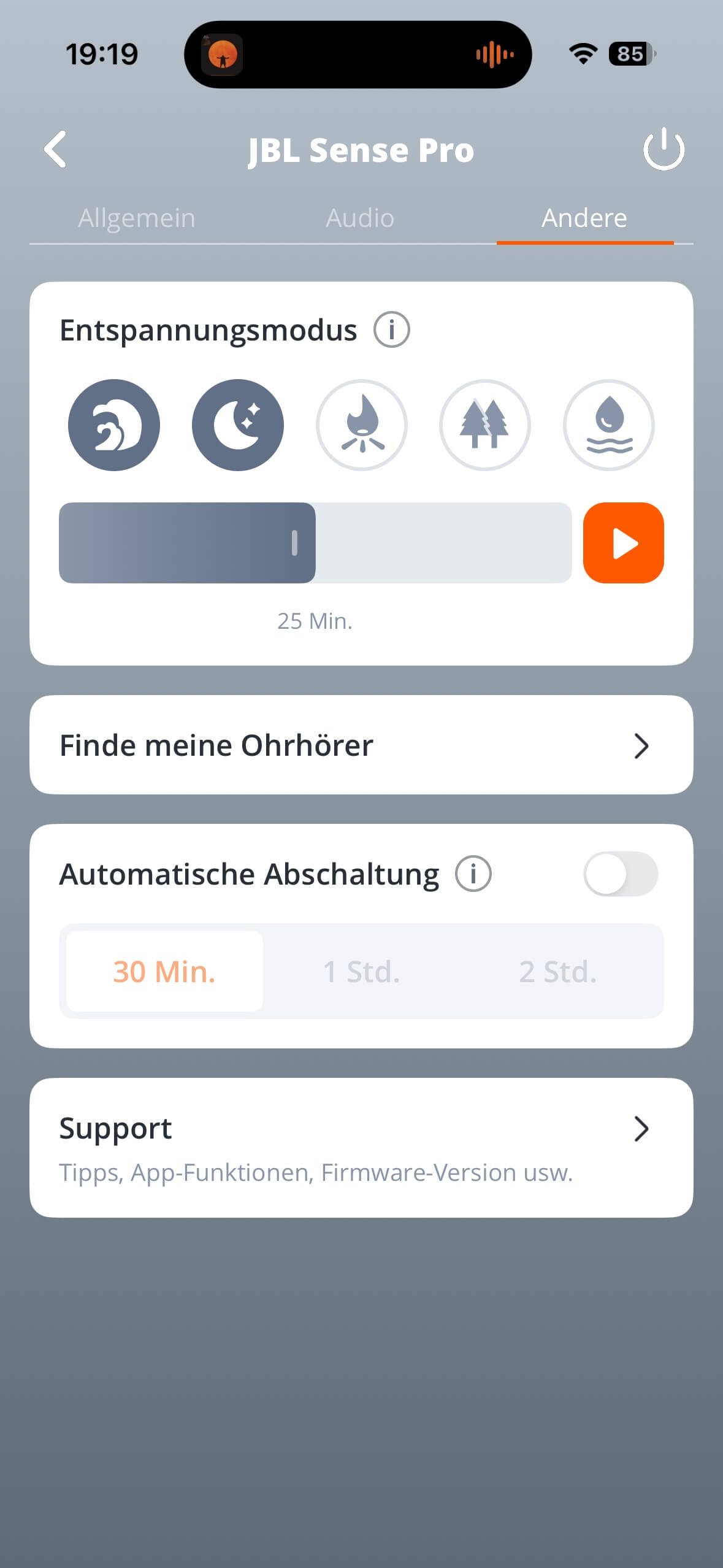 Ein Entspannungsmodus, über den aus fünf Naturklängen ein individueller Mix zusammengeklickt werden kann, ein Abschalttimer, eine Finden-Funktion und die Update-Verwaltung komplettieren den guten Eindruck, den die JBL Headphones App macht.