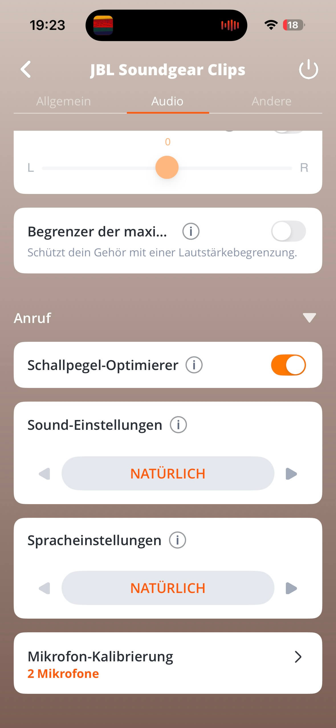 Zur Bearbeitung des Sounds bietet die App eine Equalizer-Sektion, in der über sechs Presets schnelle und mit einem 10-Band-EQ individuelle Anpassungen möglich sind. Zur Verringerung der Latenz, zum Beispiel fürs Gaming, könnt ihr die JBL Soundgear Clips in einen Video-Modus umschalten. Hinzu kommen einige Tweaking-Optionen für Anrufe, ein Entspannungsmodus mit fünf Naturklängen, Abschalttimer, Finde-Funktion und Update-Verwaltung – das rundet die App funktional ab.