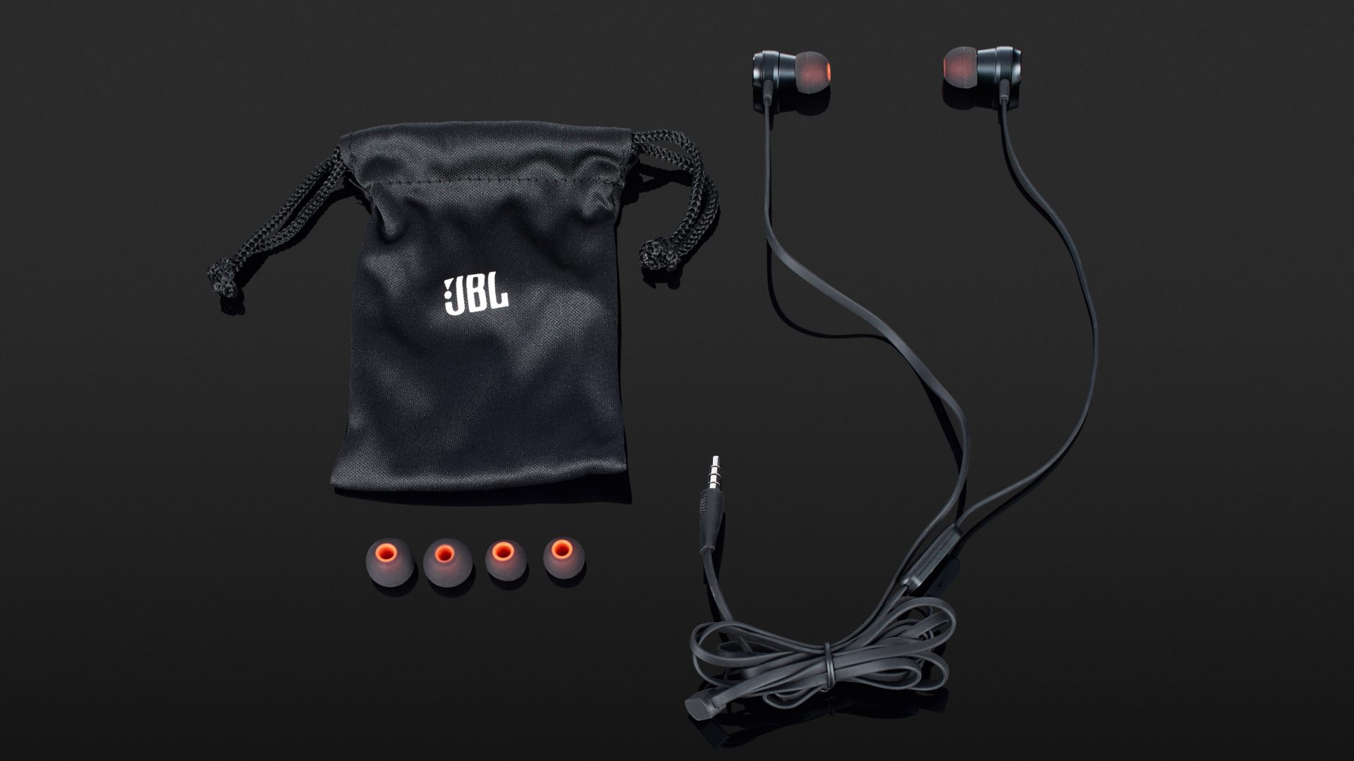 Wenn der T280 A von JBL aus den Windungen und Plastikösen der Verpackung befreit ist, entdeckt man auch das Zubehör: 3 verschieden große In-Ear-Aufsätze aus Silikon und ein kleiner Stoffbeutel für den Transport.