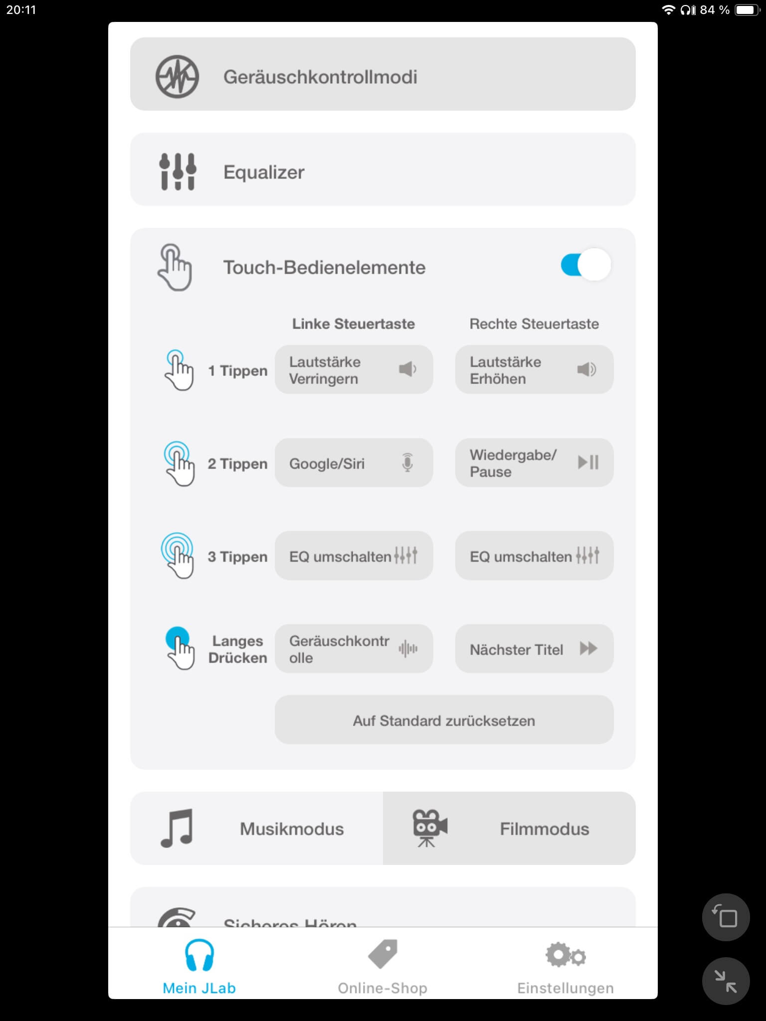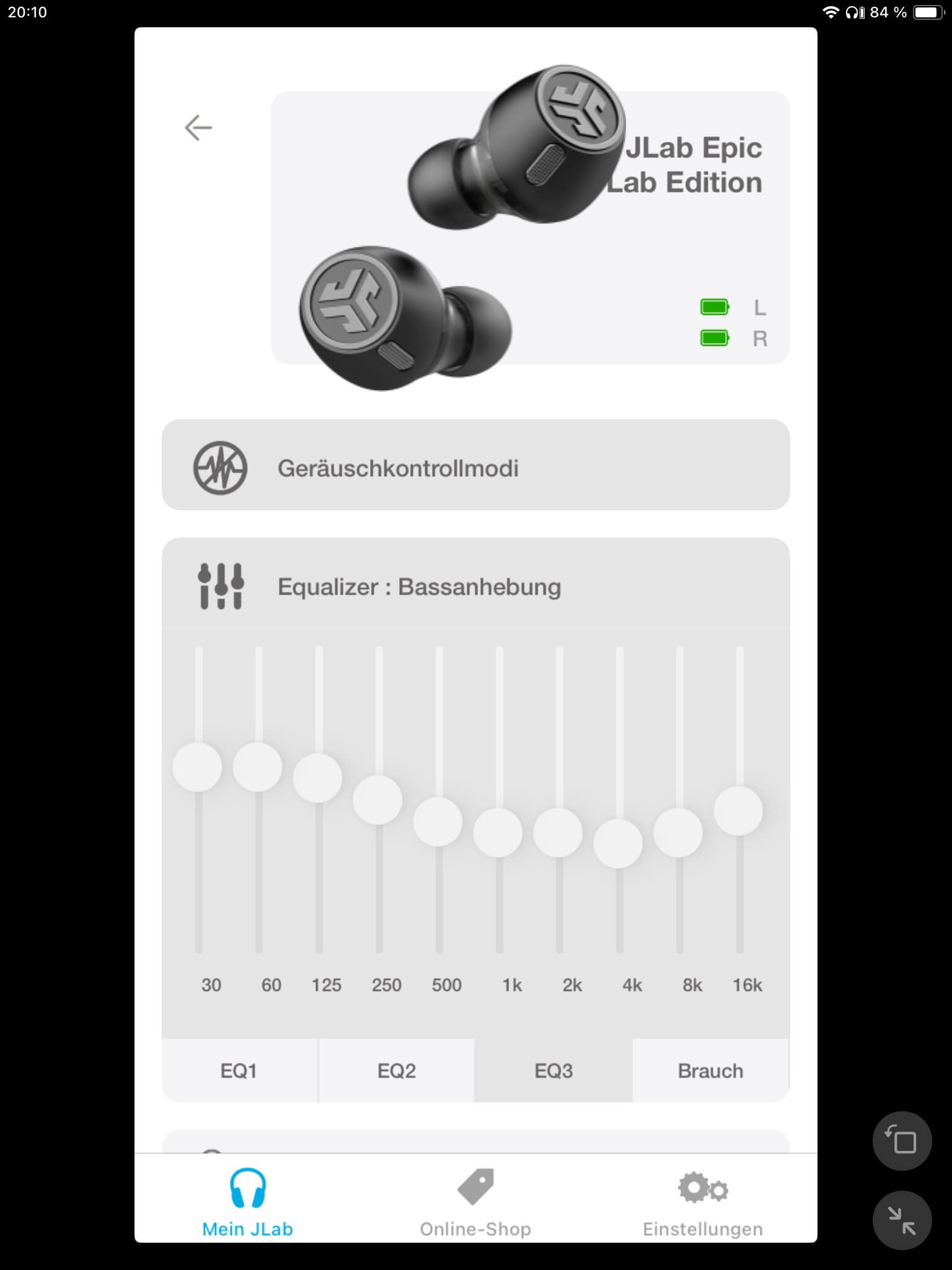 Zur Klanganpassung stehen mit „JLab Signature“, was der Standardeinstellung entspricht, „Knowles“ und „Bassanhebung“ drei vorkonfigurierte EQ-Modi zur Auswahl, die sich durch eine eigene Einstellung ergänzen lassen. Mehrere Klangkurven können mithilfe der zehn Bänder jedoch nicht angelegt werden, da diese nicht speicherbar sind.