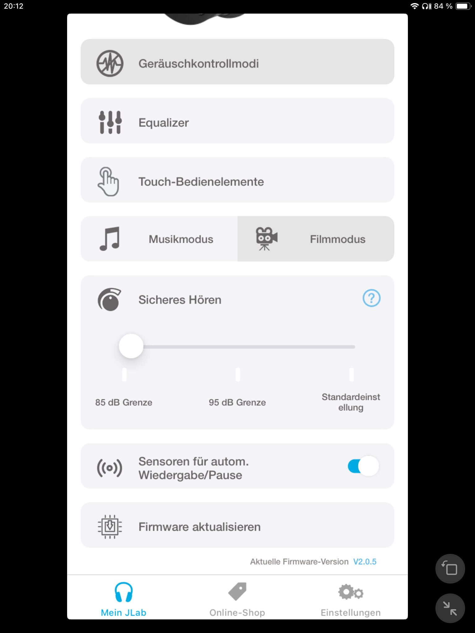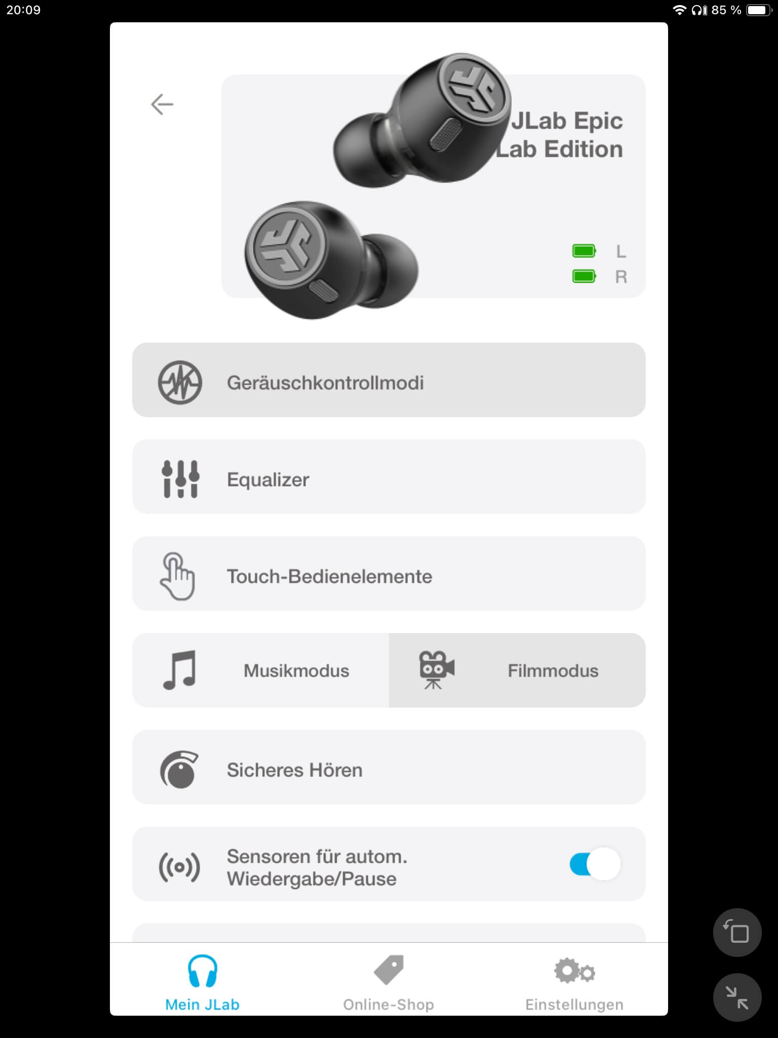 Begrüßenswert ist, dass ein Gehörschutz eingerichtet werden kann, indem sich der maximale Ausgabepegel auf 85 oder 95 Dezibel begrenzen lässt. Des Weiteren zählt neben der personalisierbaren Touch-Steuerung noch ein latenzreduzierter Filmmodus zu den App-Funktionen. Auch Firmware-Aktualisierungen sind durchführbar.