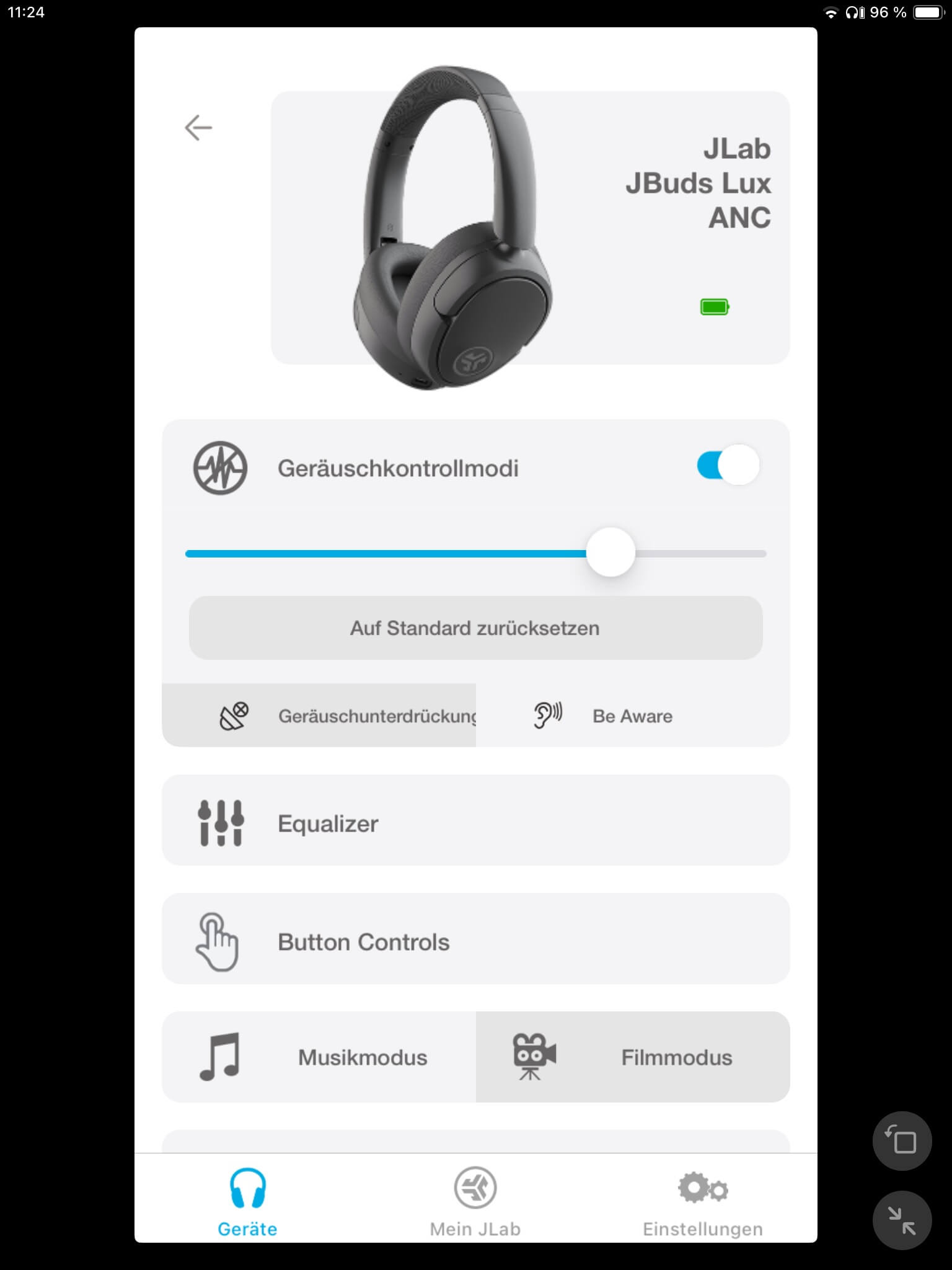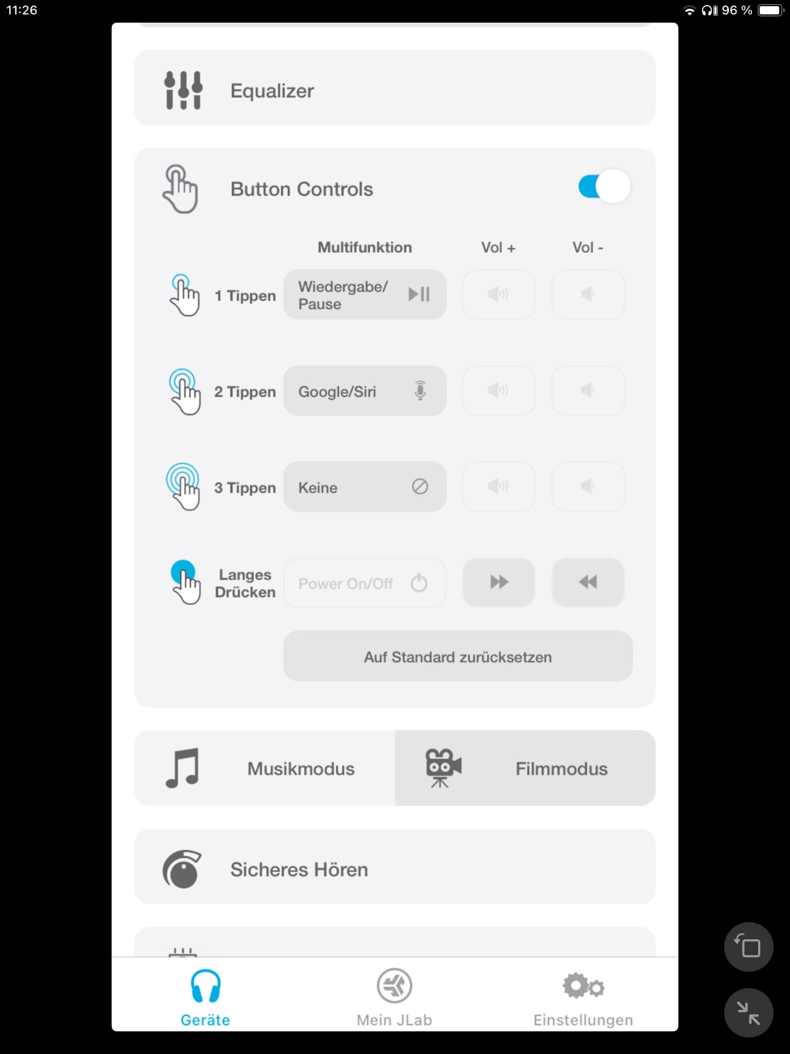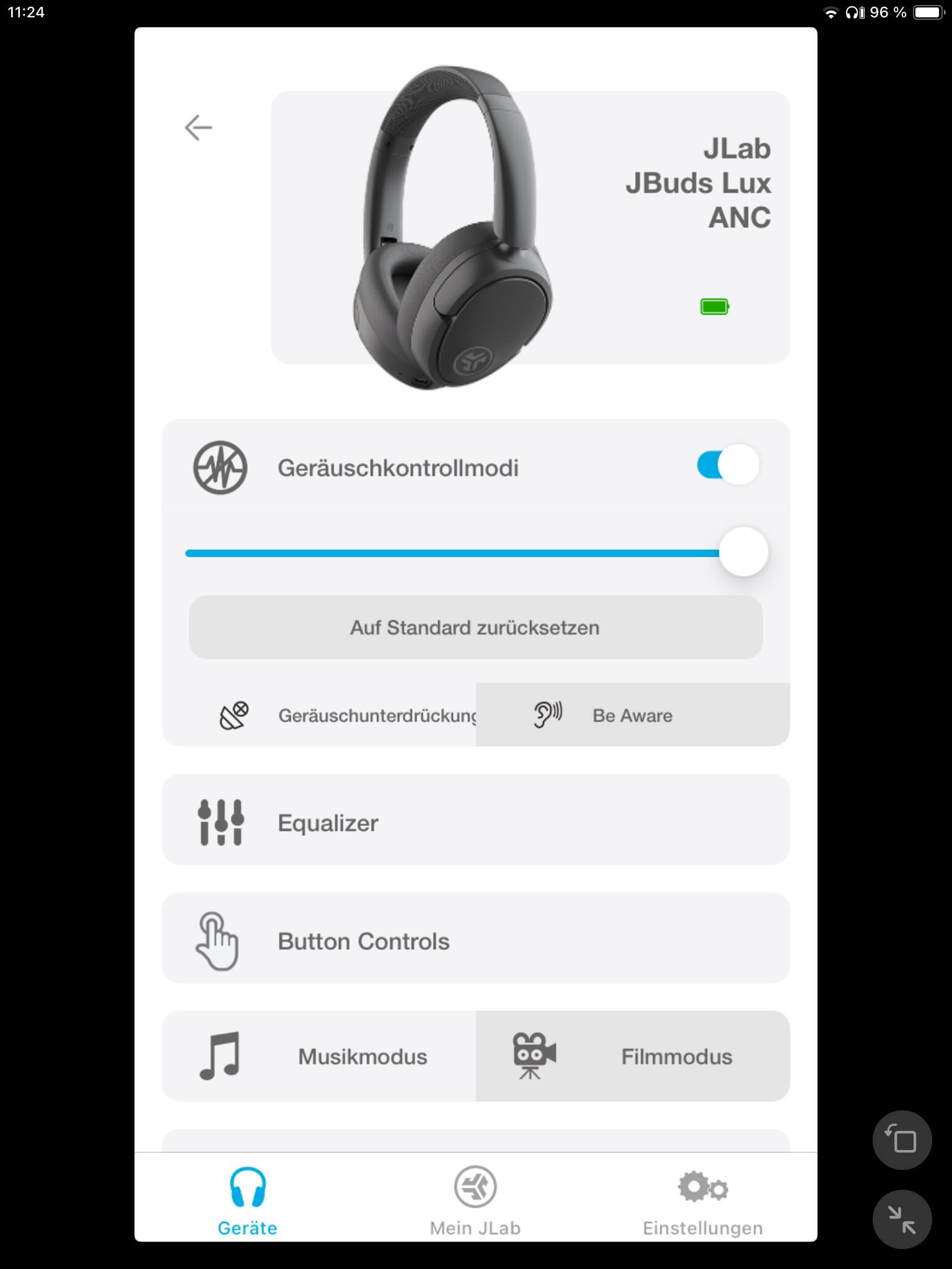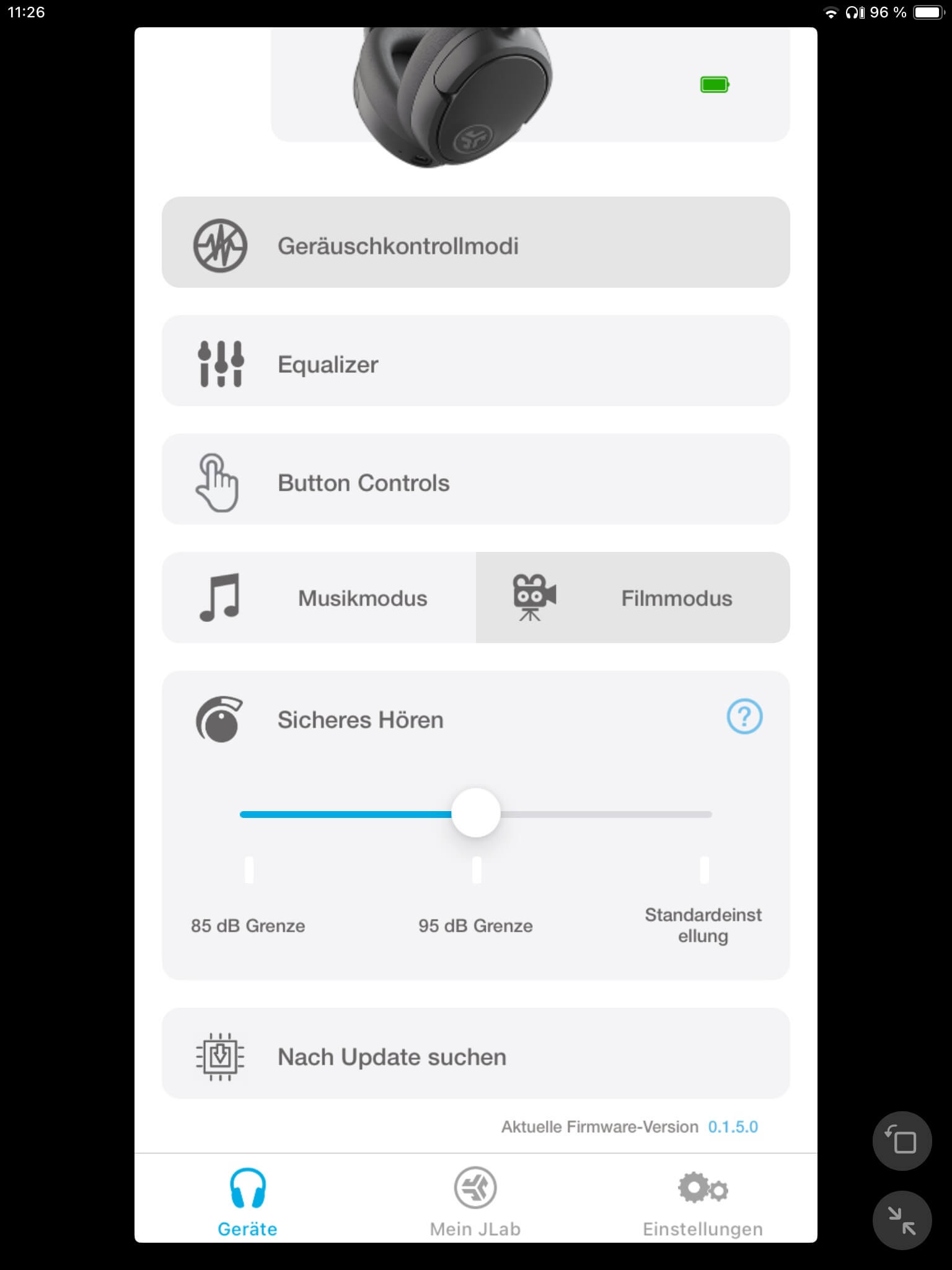 Vorbildlich ist, dass die JLab App eine Lautstärkebegrenzung ermöglicht, und zwar wahlweise auf 85 oder 95 Dezibel. Des Weiteren kann in den Filmmodus gewechselt werden und neben der Tasterkonfiguration lassen sich noch Firmware-Aktualisierungen vornehmen.
