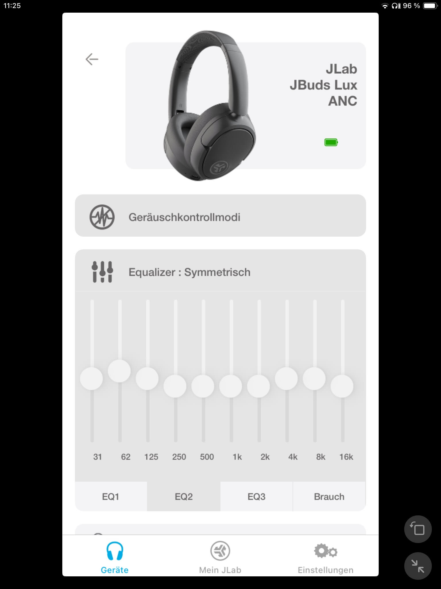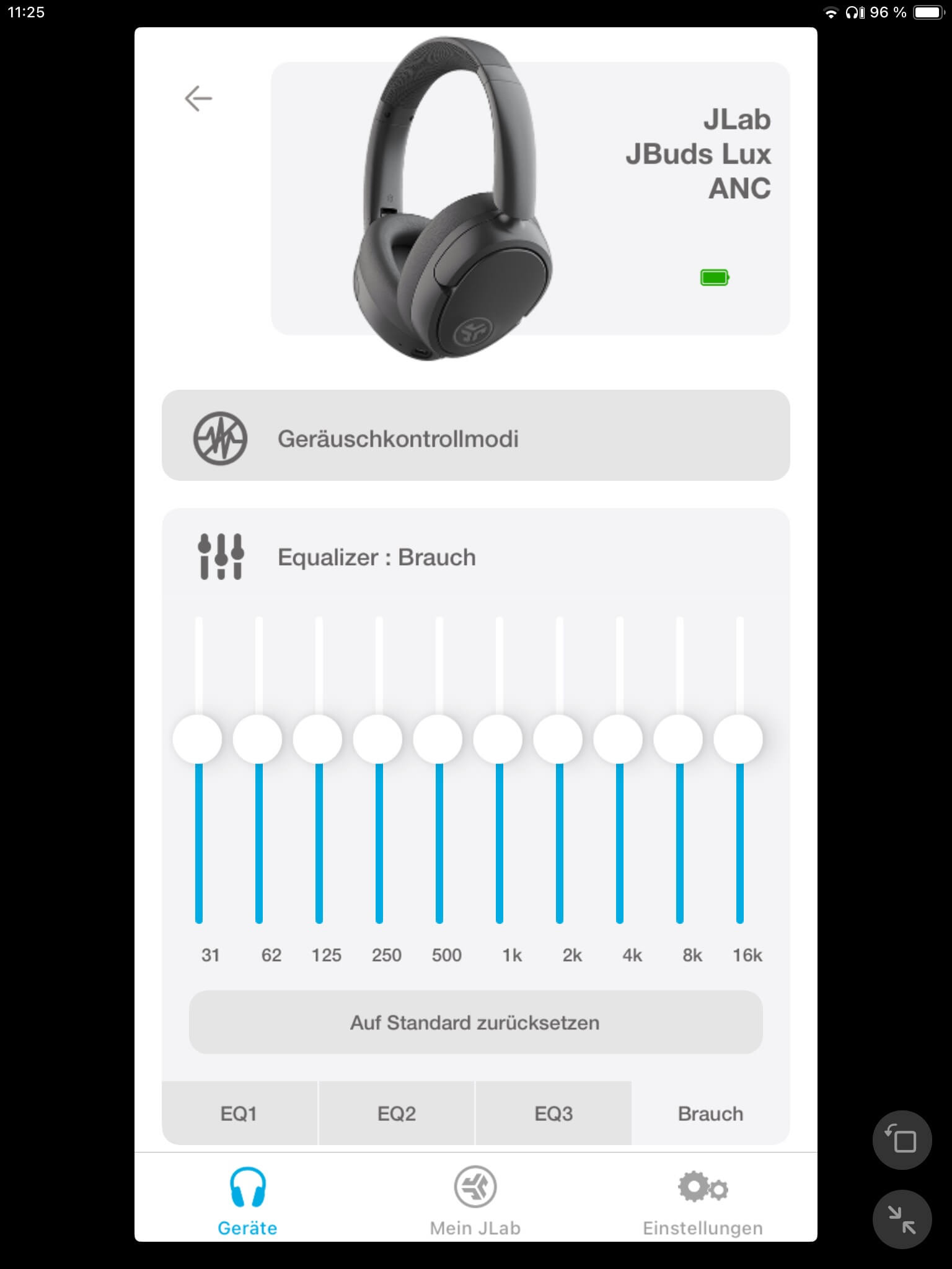 Die Geräuschkontrolle der App-Anbindung (Android und iOS) umfasst den ANC- sowie einen Be-Aware-Modus, die beide stufenlos regelbar sind und exakt an unterschiedliche Gegebenheiten angepasst werden können. Darüber hinaus stellt die EQ-Sektion mit „JLab Signature“, was der Standardeinstellung entspricht, „Balanced“ und „Bass Boost“ drei vorgefertigte Kurven zur Auswahl. Diese lassen sich durch eine eigene Einstellung ergänzen, wofür zehn Bänder bereitstehen. Die individuellen Anpassungen können jedoch nicht als Presets gespeichert werden.