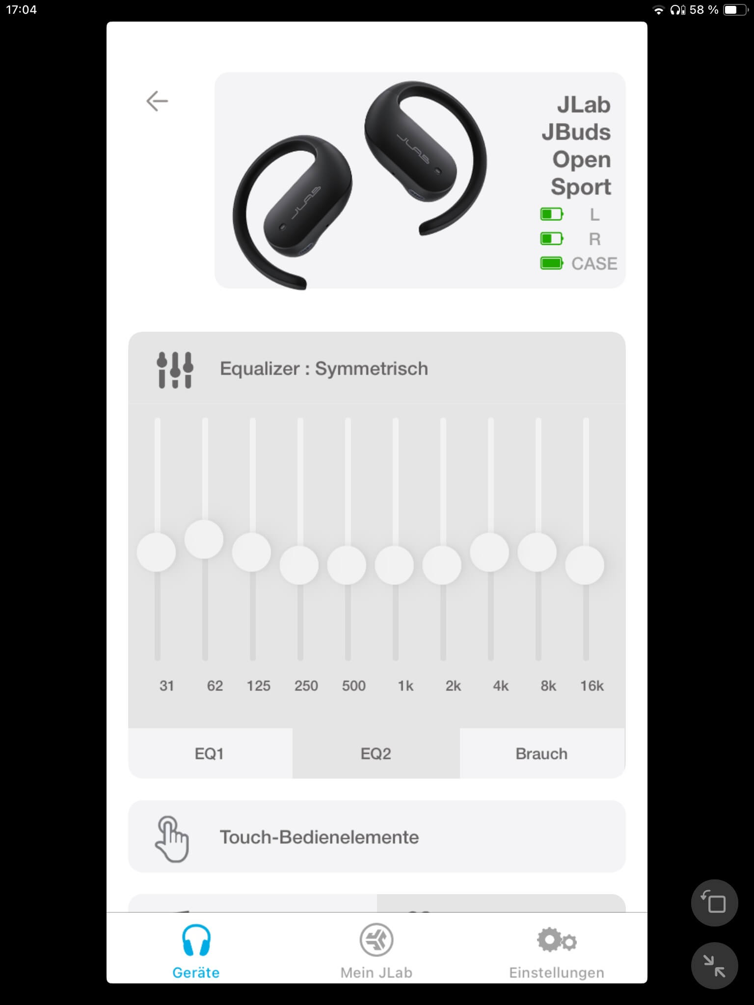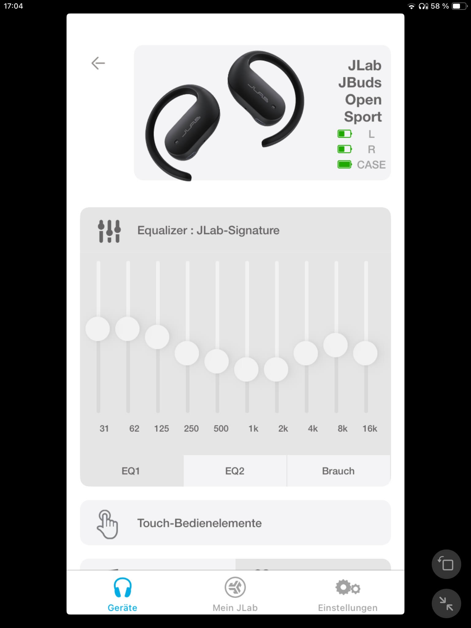 Über die App-Anbindung (Android und iOS) der JLab JBuds Open Sport besteht Zugriff auf eine EQ-Sektion, die mit „JLab Signature“, was der Standardeinstellung entspricht, und „Balanced“ zwei vorgefertigte Kurven zur Auswahl stellt. Als dritte Option können eigene Einstellungen vorgenommen werden, wofür zehn Bänder nutzbar sind. Mehrere Presets lassen sich jedoch nicht anlegen, da die EQ-Einstellungen nicht speicherbar sind.