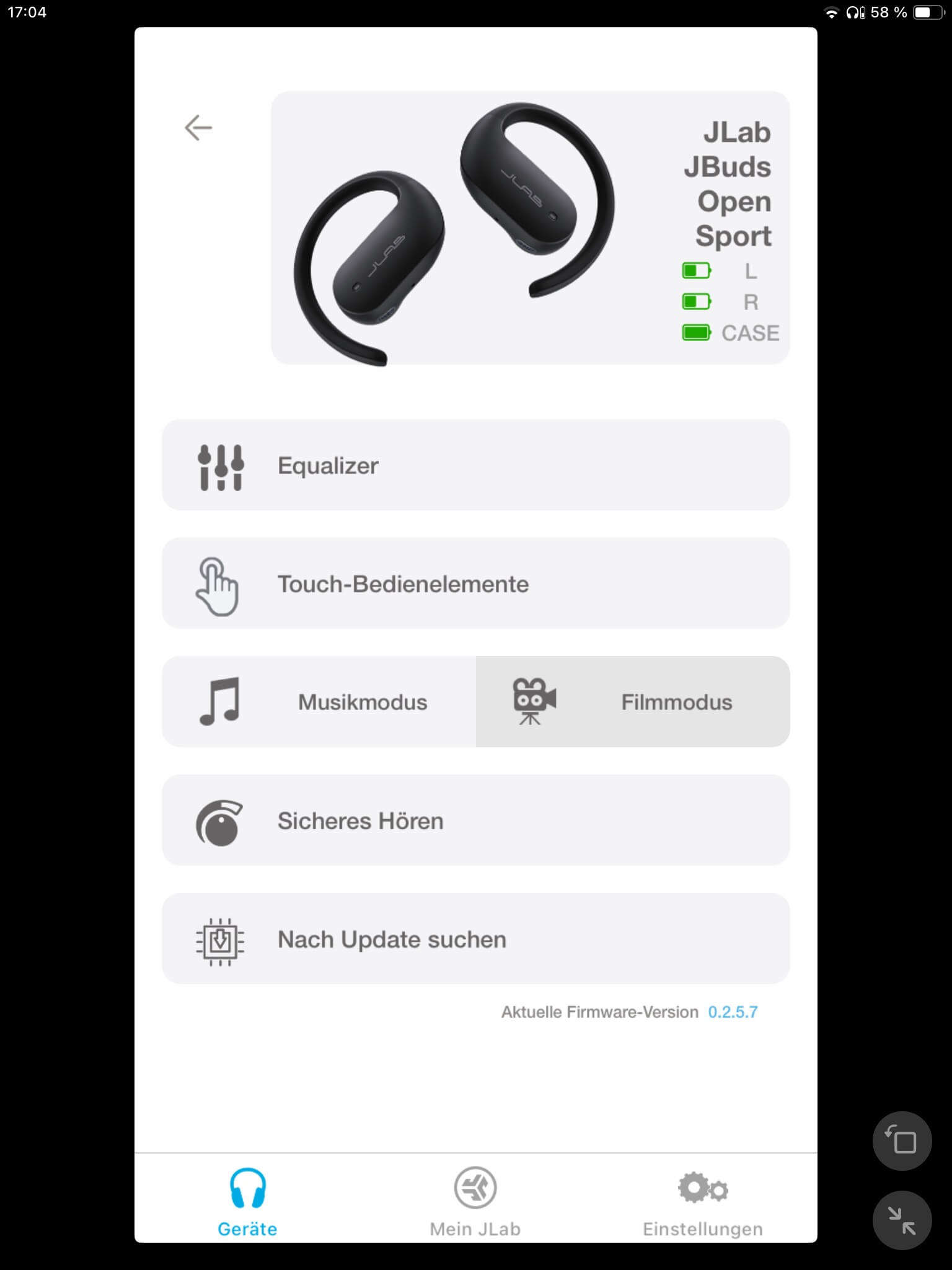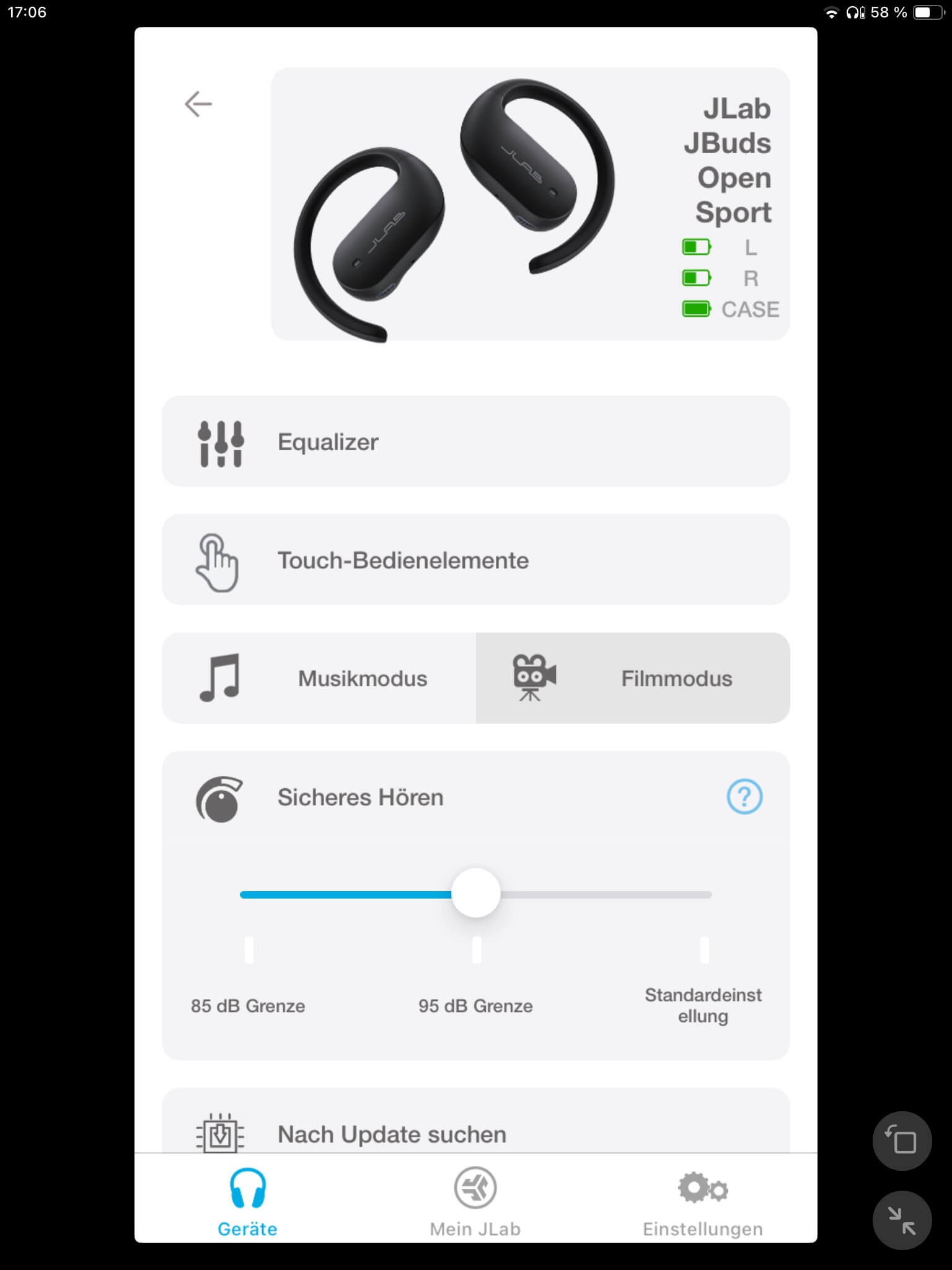 Darüber hinaus kann per App ein Gehörschutz eingerichtet werden, wodurch der Ausgabepegel der Sporthörer auf 85 oder 95 Dezibel begrenzt wird. Ergänzend zur Anpassung der Touch-Steuerung lassen sich noch Firmware-Aktualisierungen durchführen und es kann in den Filmmodus gewechselt werden.