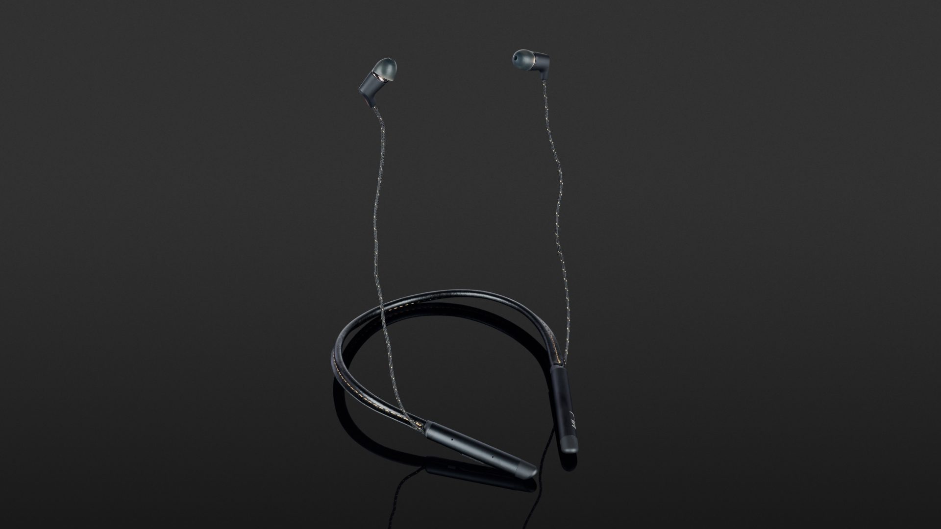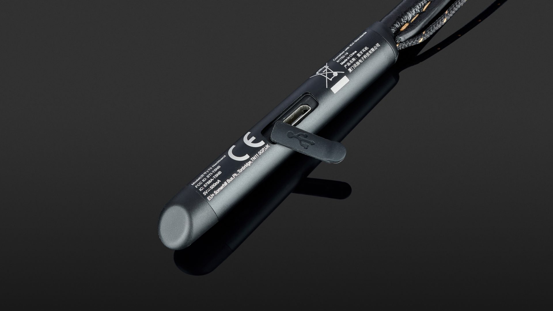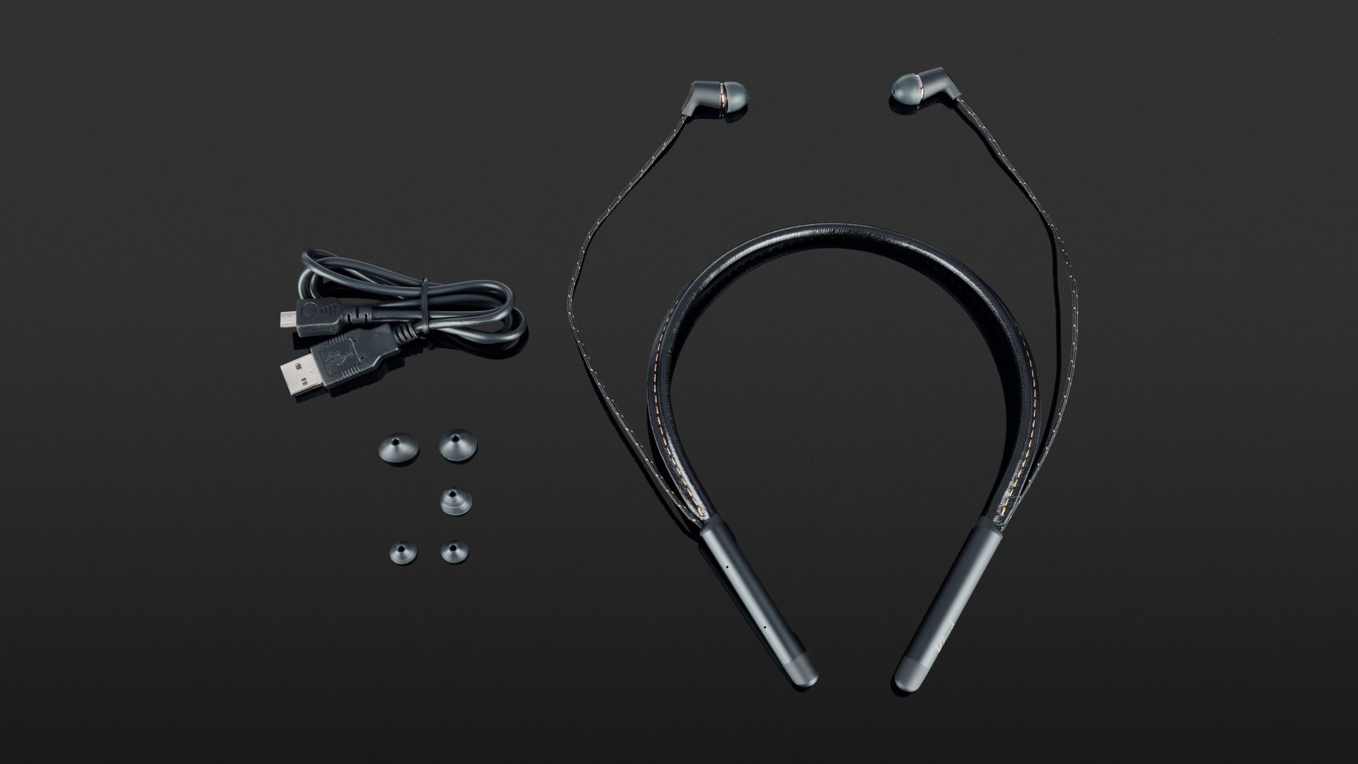 Der Klipsch kommt in einer Pappschachtel, die aufgrund der Halsbandform etwas größer ausfällt. Auszupacken gibt es nicht viel, der Lieferumfang beschränkt sich auf den Hörer, ein USB-Ladekabel und ein Satz Silikon-Ohrpolster. Das Halsband selbst besteht aus einem mit braunem Leder ummantelten Bügel, der in zwei schwarzen Plastikfingern endet (es gibt den T5 auch in der Farbversion braun/weiß). Im rechten Finger steckt die Elektronik, inklusive Micro-USB-Ladebuchse. Am Halsbügel baumeln kurze, stoffummantelte Kabel, die in zwei extrem kleinen und leichten Treibergehäuse enden. In den Ohrpassstücken werkelt jeweils ein dynamischer 5-mm-Treiber.