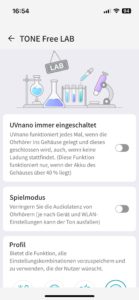 Neben der oben erwähnten Multipoint- und -Pairing-Verwaltung gibts unter „TONE Free LAB“ die Möglichkeit, UVnano immer eingeschaltet zu lassen und einen Gaming Modus für eine reduzierte Latenz zwischen Bild und Ton zu aktivieren. Hier könnt ihr auch bis zu drei eigene Profile anlegen, um schnell zwischen Gaming, Büroarbeit oder Outdoor-Aktivitäten die passenden EQ- und ANC-Einstellungen umzuschalten.