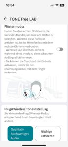 Die Steuerungsmöglichkeiten der etwas empfindlichen Touchpads können hier ebenso getuned werden (lauter, leiser, Track vor/zurück) wie eine vollständige Sperrung zum Schutz vor Fehleingaben. Die Empfindlichkeit der Touch-Oberflächen können allerdings nicht – wie bei den Edifier NeoBuds Pro 2 (Test) – eingestellt werden.