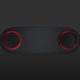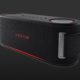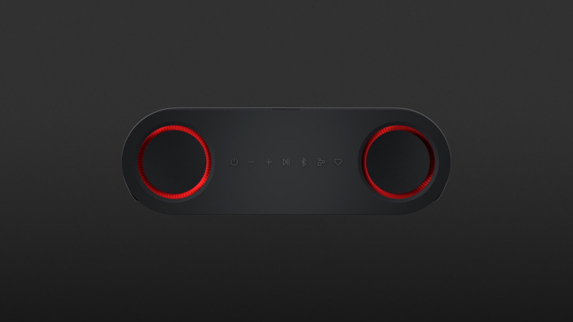 Auf der Oberseite befinden sich, neben den zwei markanten Passivradiatoren, alle Taster zur Steuerung der Box. Beleuchtet sind die Elemente nicht, was es in dunkler Umgebung schwer macht, sich zu orientieren. Unten an der Box, die auf zwei großen Füßen steht, wirbelt und wandert das LED-Lichtband herum. Auf der Rückseite befindet sich der USB-C-Port als Ladebuchse. Im Inneren werkeln zwei 20 Millimeter große Hochtöner der dänischen Marke Peerless und ein 9,3 x 5,3 Zentimeter großer Racetrack-Tieftöner, die zusammen eine Ausgangsleistung von 40 Watt (30 W + 5 W x 2) liefern.