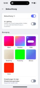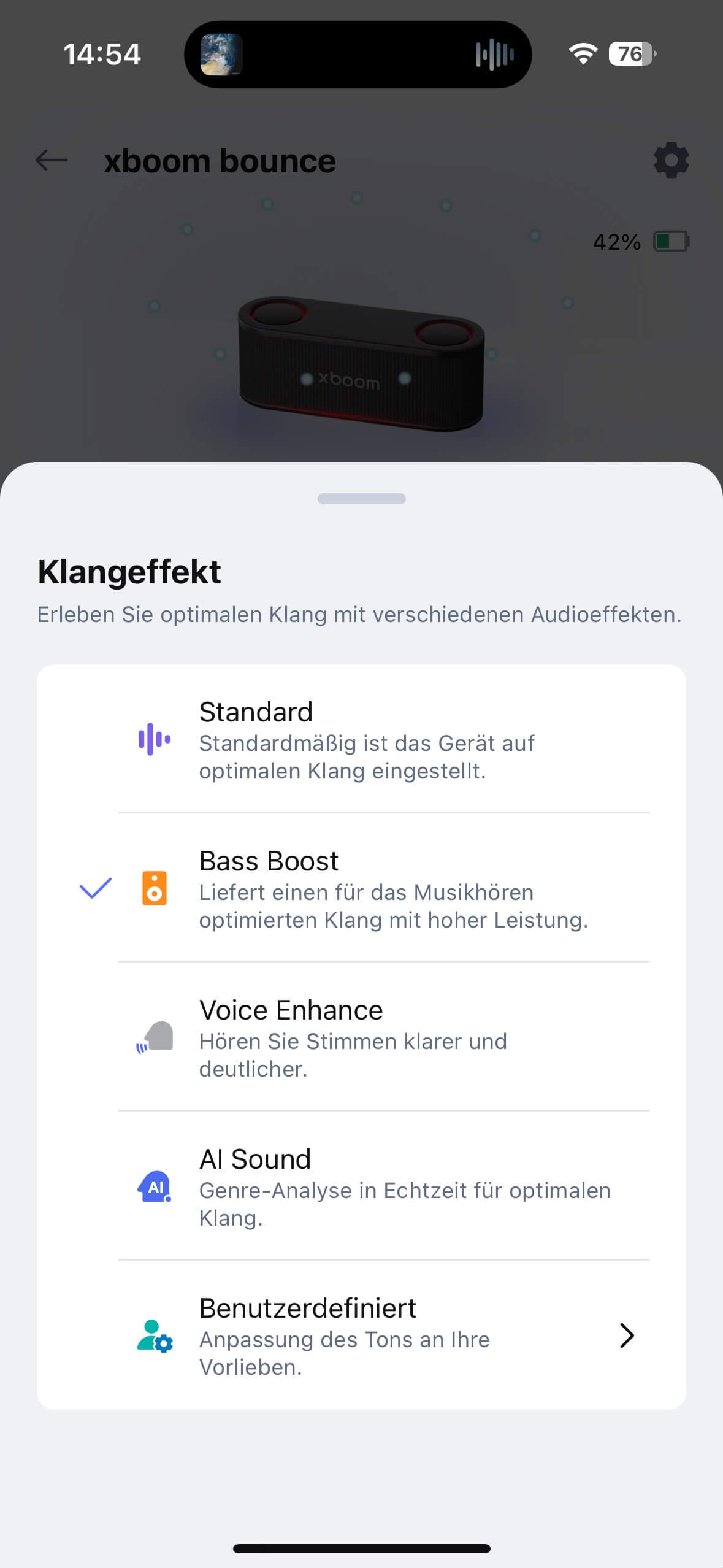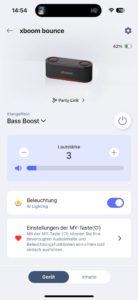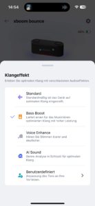 In der App kann man dann im Bereich „Klangeffekt“ aus vier Presets wählen und mit einem 6-Band-EQ den Sound nach eigenen Wünschen einstellen. Ein Preset verspricht, mithilfe von KI, den optimalen Klang basierend auf einer Genre-Analyse zu erzielen. Die zuschaltbaren Beleuchtungseffekte für den schmalen Lichtstreifen im unteren Bereich der Box lassen sich aus sechs Voreinstellungen mit individueller Farbgebung gestalten. Selbst hier bietet sich die KI für Analytisches an und will anhand des gewählten Songs eine treffende Auswahl an Lichteffekten anbieten. Für mich sieht es aber ein wenig wie ein wahlloses Aneinanderreihen von Presets aus. Insgesamt ist die Lightshow an dem Bounce aber ein nettes Gimmick.