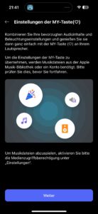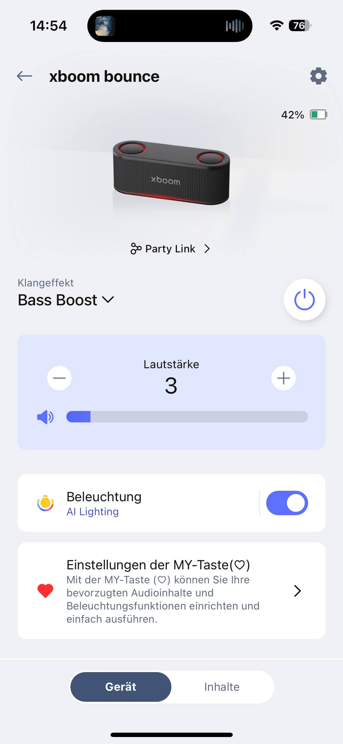 Die Herz-Taste auf der Box kann in der App im Bereich „MY-Taste“ mit einer Playlist, einem Beleuchtungseffekt und weiteren Einstellungen verknüpft werden. Nach einigen Versuchen gelang es mir, und beim Drücken der Taste startete meine ausgewählte Playlist mit der eingestellten Lautstärke, dem Sound Preset und einem Lichteffekt.