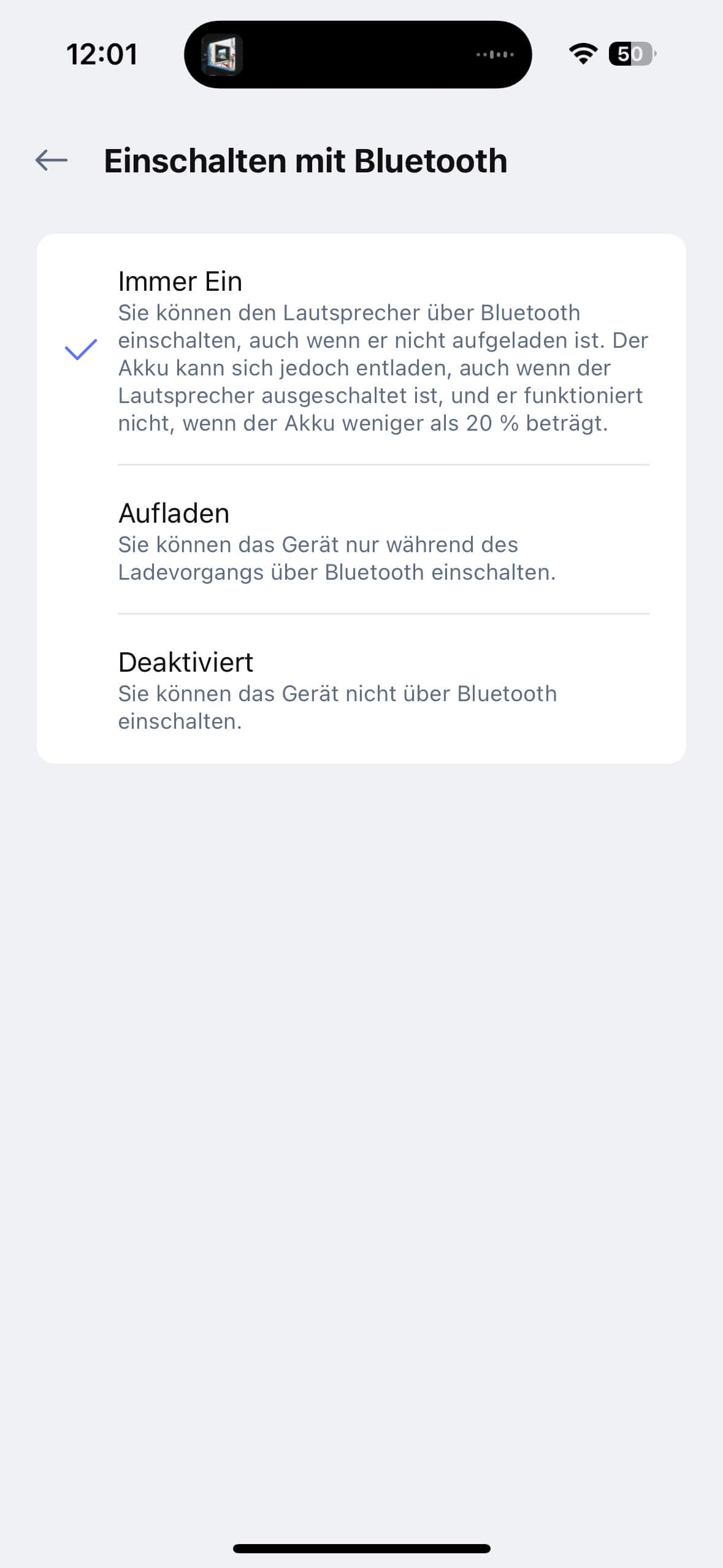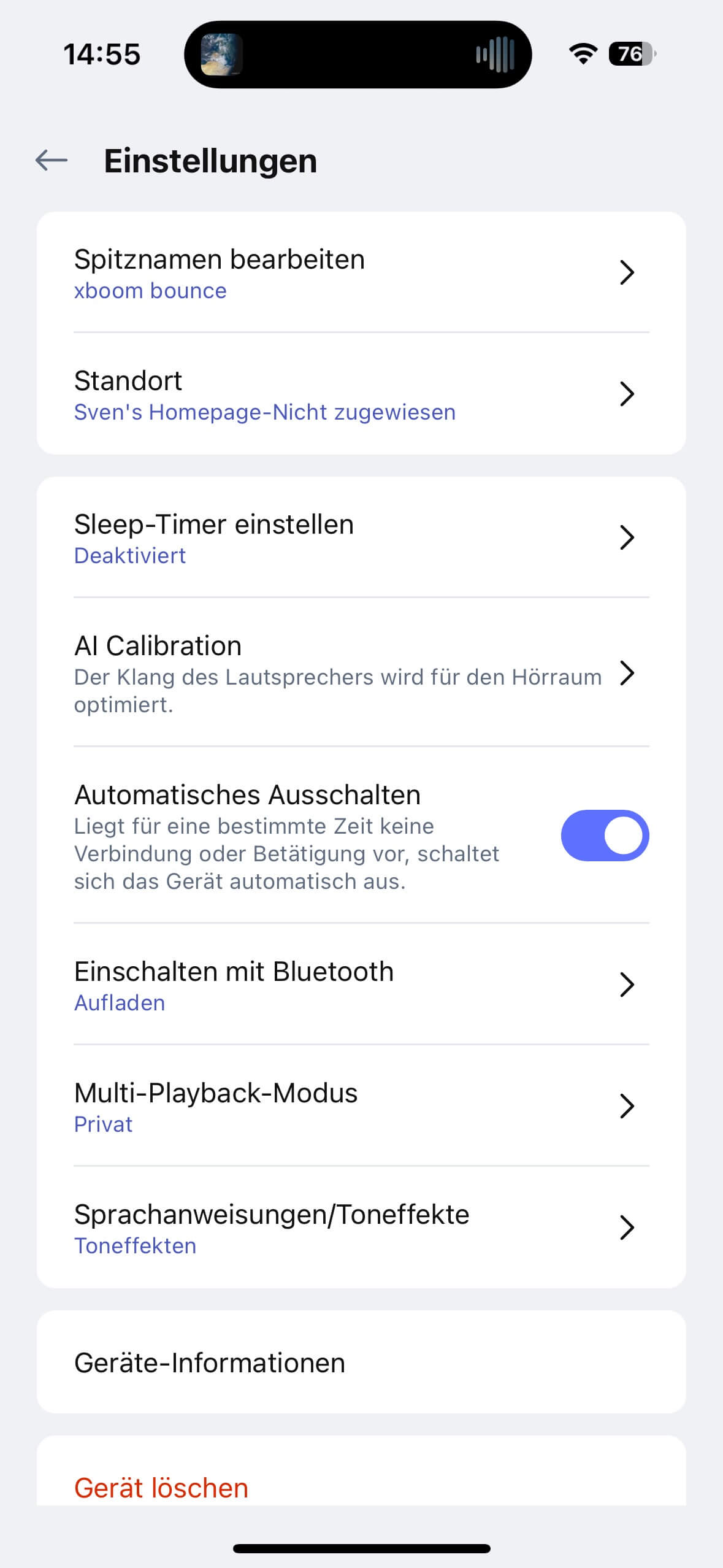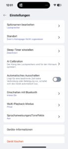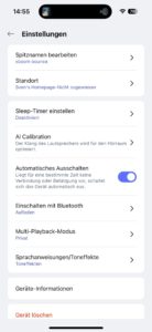 In den erweiterten Einstellungen könnt ihr eine Raumanalyse mit Kalibrierungstönen durchführen, damit die KI die optimalen Klangeinstellungen auswählen kann. Dort lässt sich auch festlegen, ob sich die Box über Bluetooth einschalten lässt, was praktisch ist, aber den Stromverbrauch erhöht. Außerdem funktioniert es nicht aus der App heraus, sondern nur, wenn ihr ins Bluetooth-Menü des Zuspielers geht und dort die Box aktiviert.