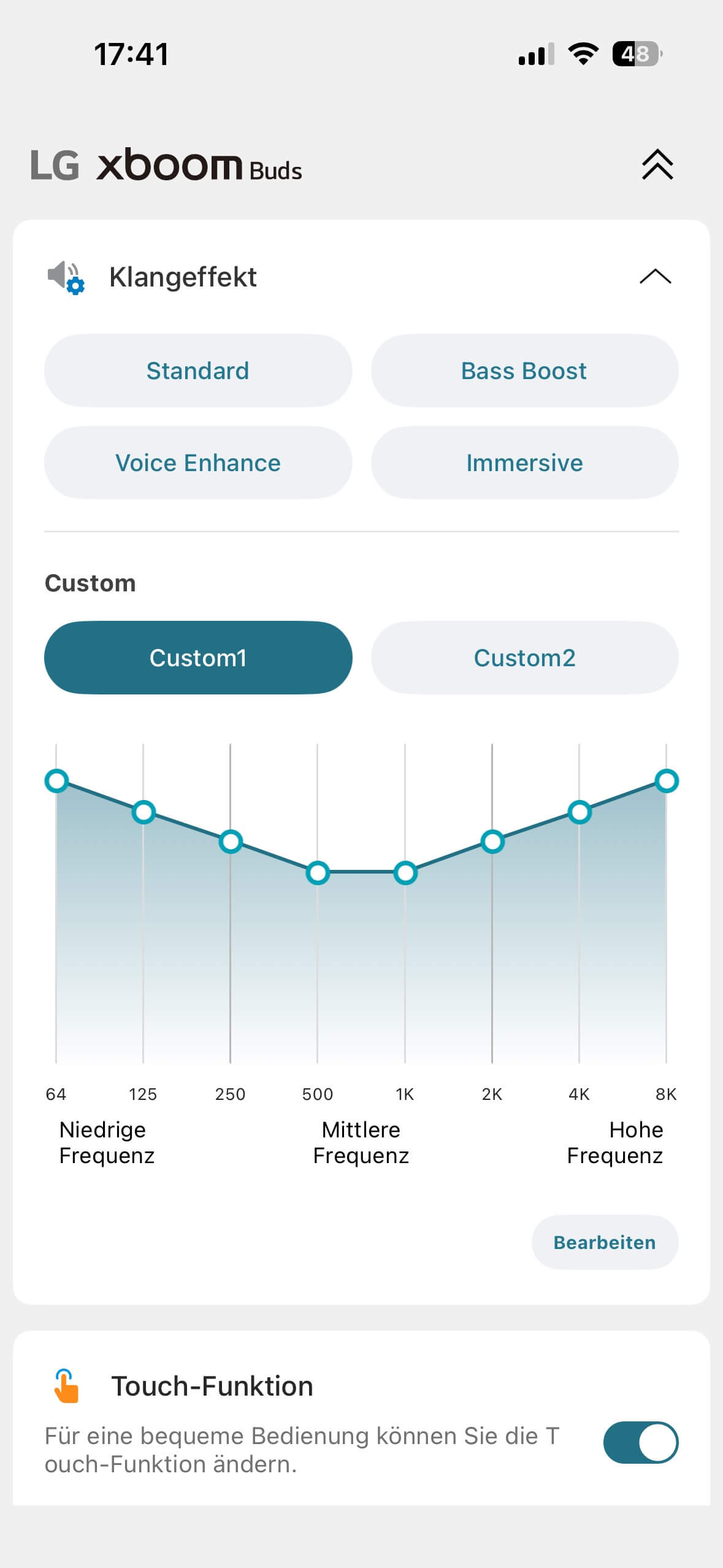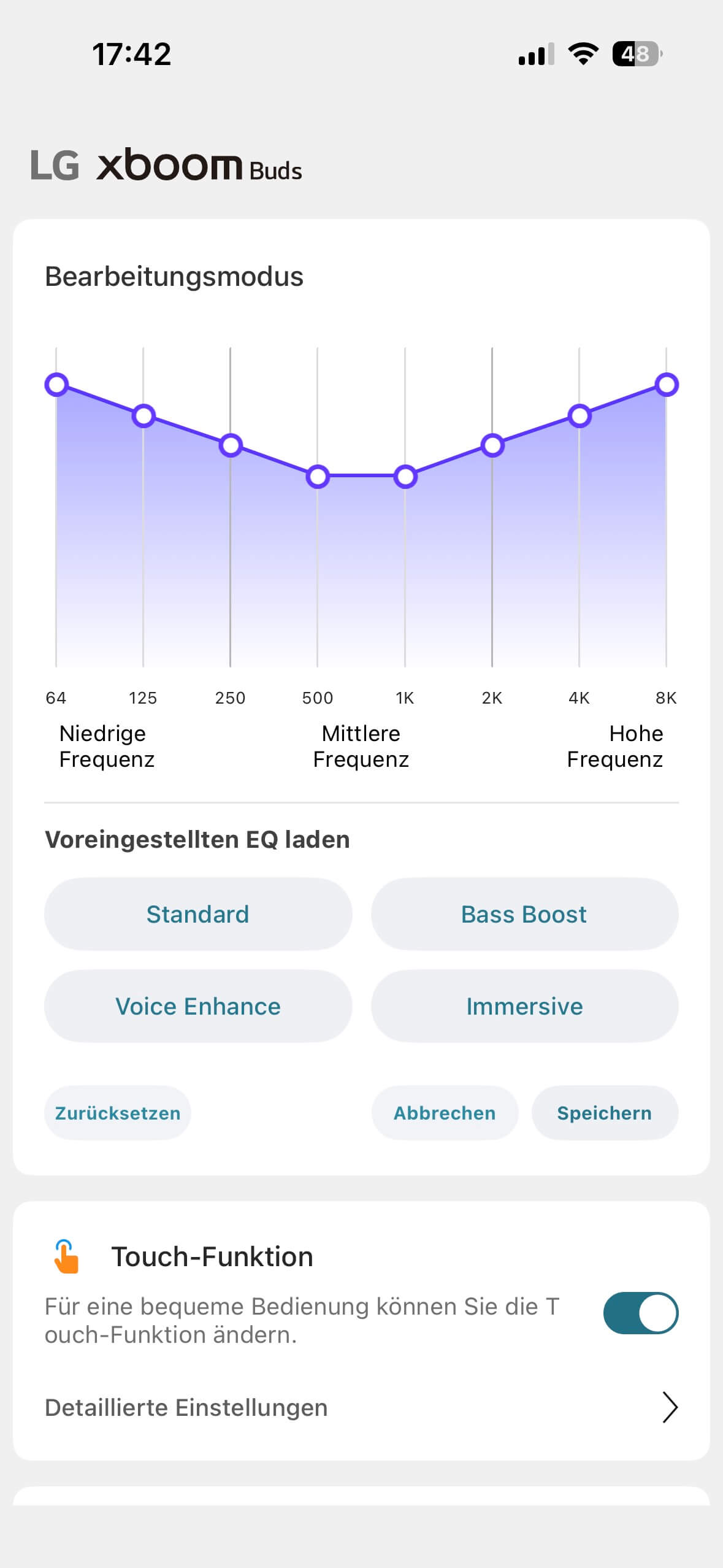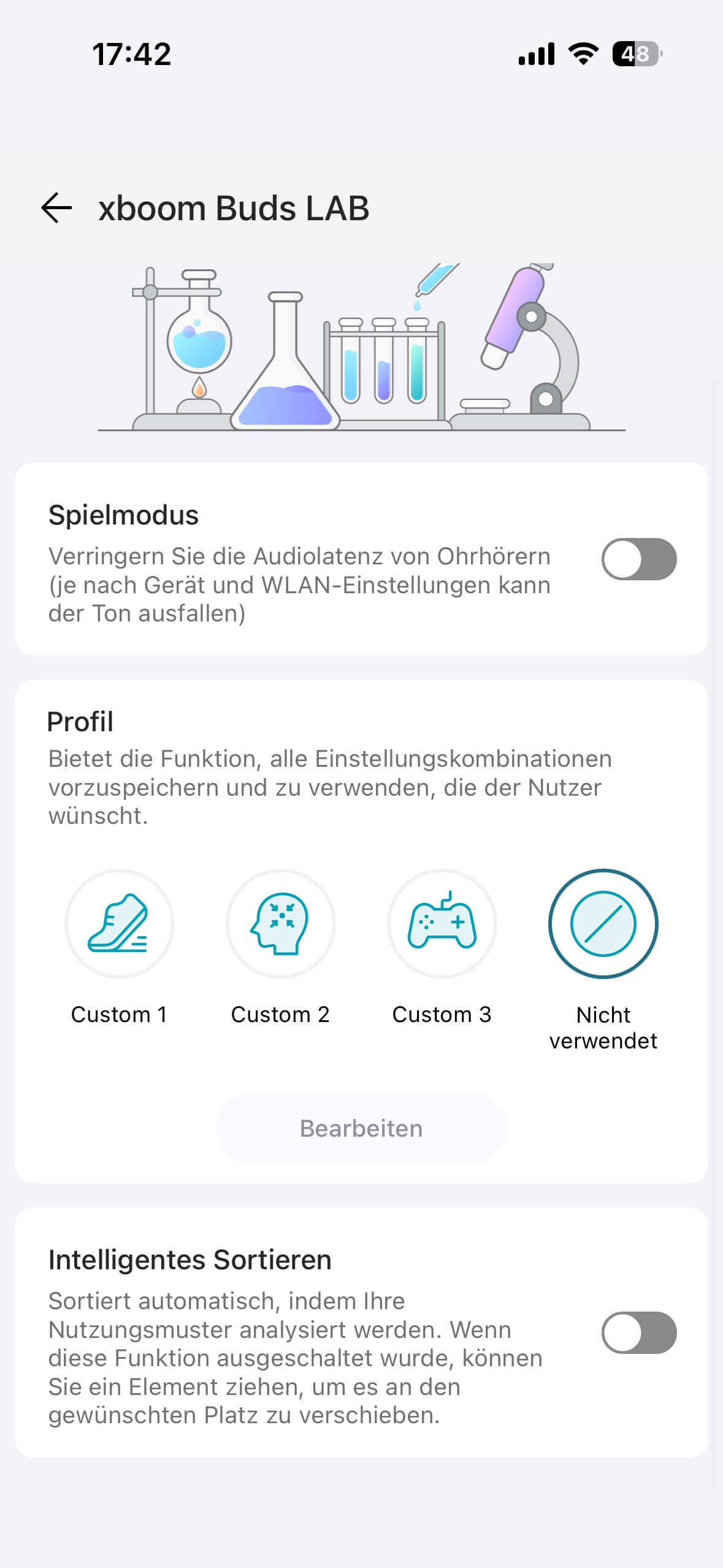 Das xboom Lab hält noch einen latenzarmen Spielmodus bereit und Profile, bei denen ihr gewisse Einstellungskombinationen der Parameter ANC, Latenz, Touch und Equalizer zusammen (de)aktivieren könnt. Ein Profil lässt sich allerdings nicht per rückseitigen Touch-Sensor, sondern nur in der App aktivieren.