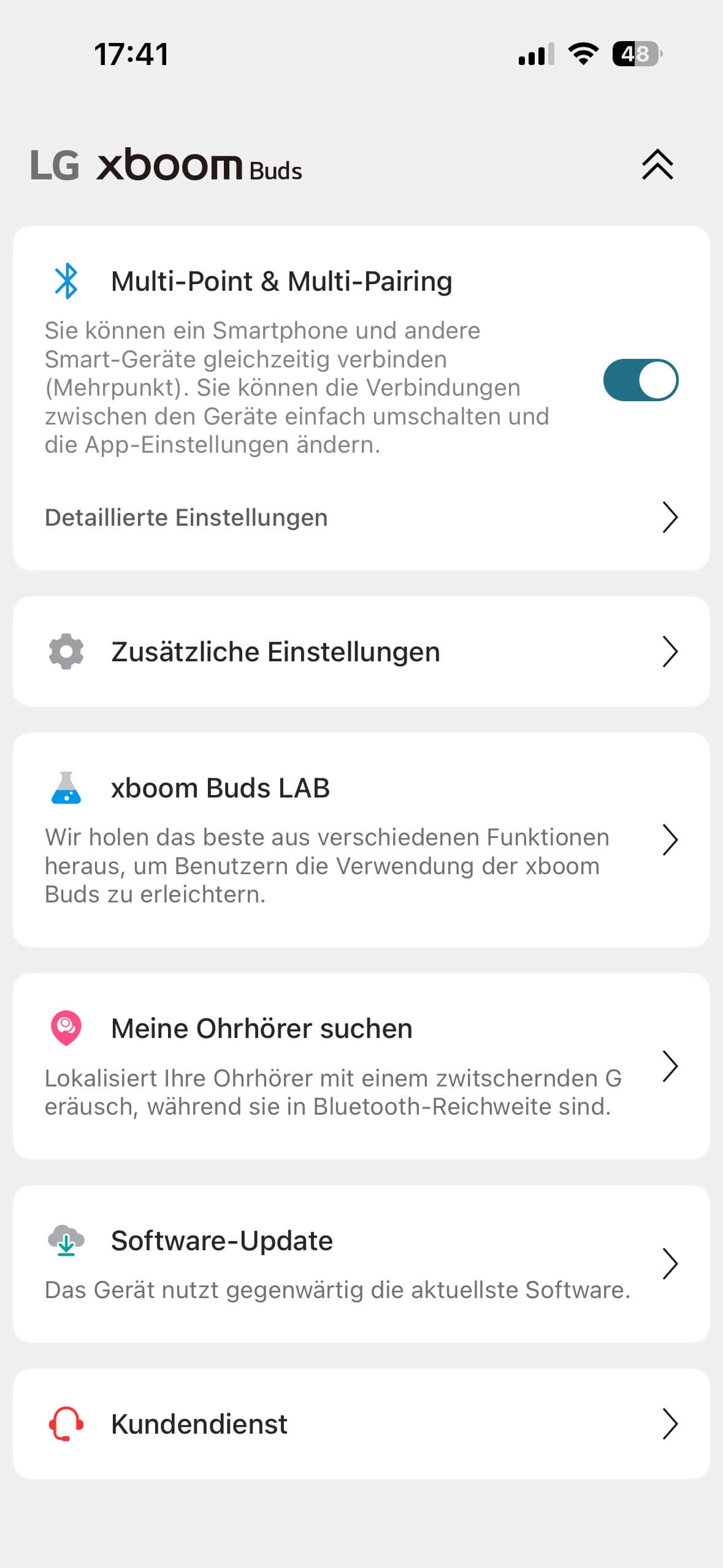 Mit Bluetooth 5.4 und den Codecs AAC und SBC sind die LG xboom Buds Lite angemessen ausgestattet. Über Google Fast Pair und Windows Swift Pair gelingt die Kopplung komfortabel, aber auch unter iOS verkoppelt sich alles problemlos und angenehm zügig. Multipoint ist on Board, muss aber in der App aktiviert werden, damit zwei Sender-Geräte simultan verkoppelt und abwechselnd genutzt werden können.