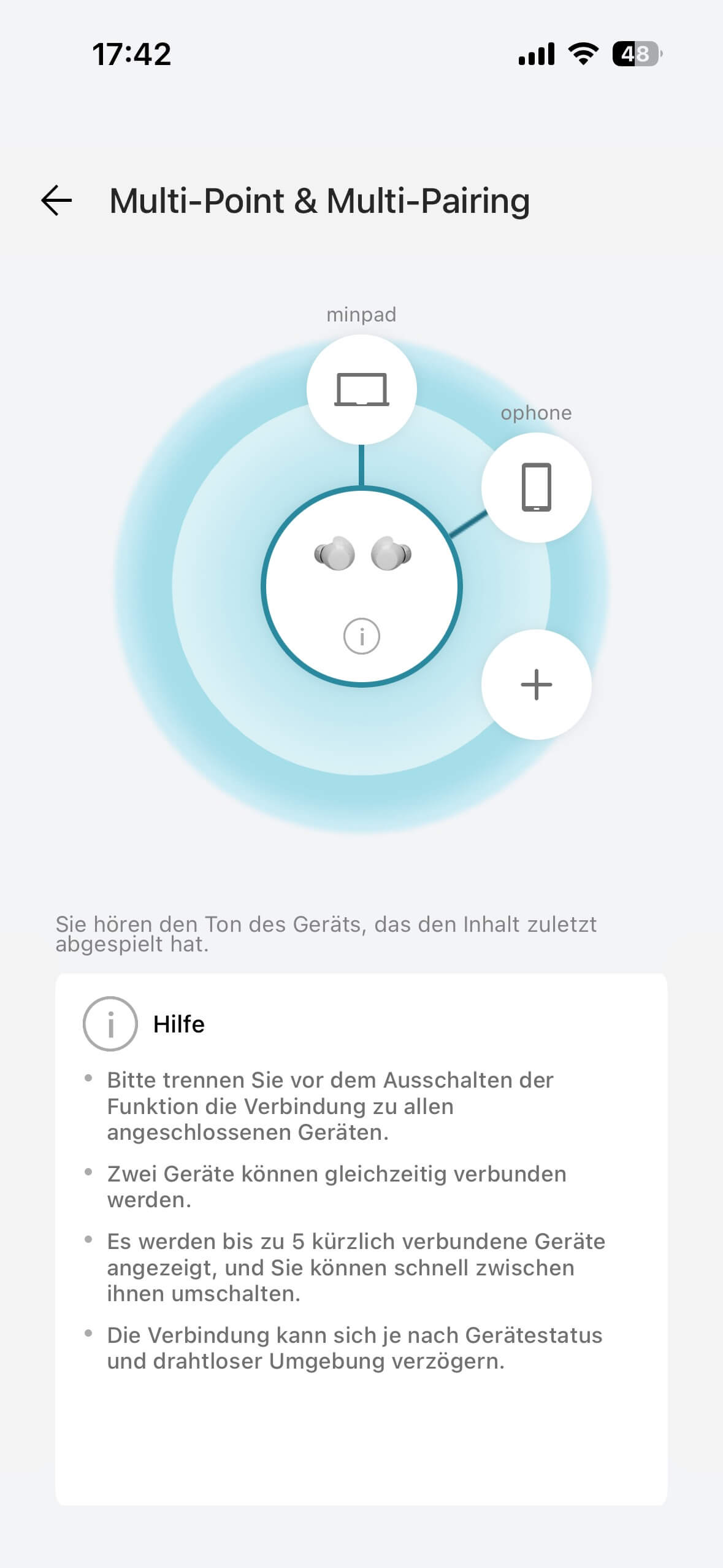 Die übersichtliche Multipoint-Verwaltung informiert darüber, mit welchen Tools die xboom Buds Lite bereits verbunden waren und welche zwei Verbindungen derzeit noch aktiv sind.