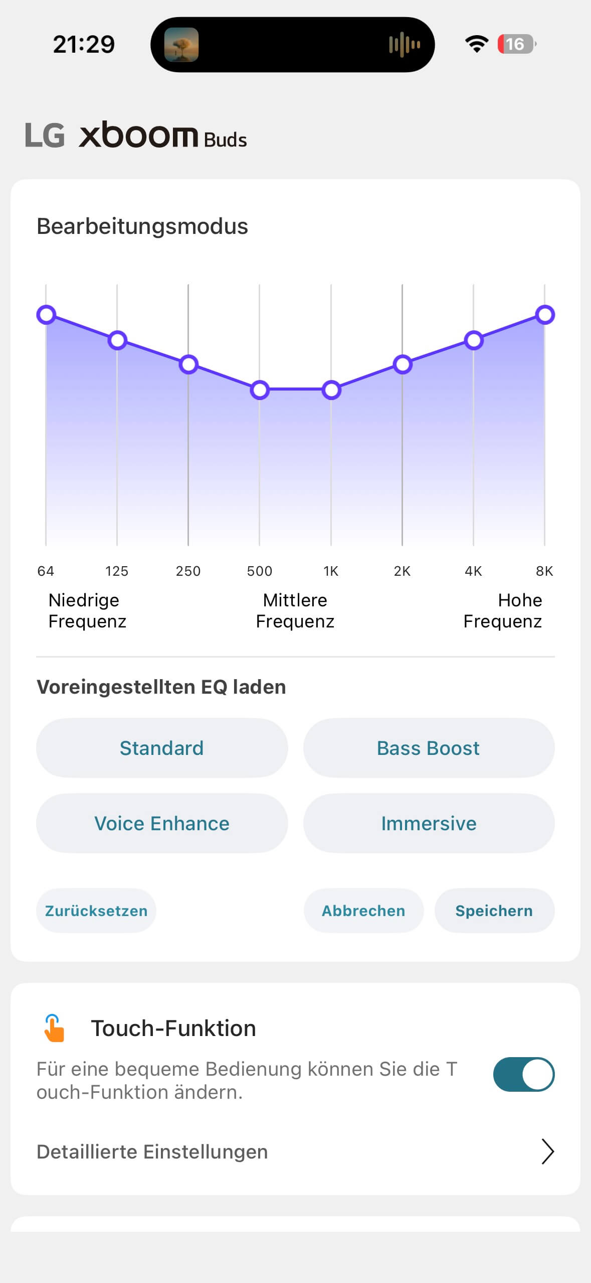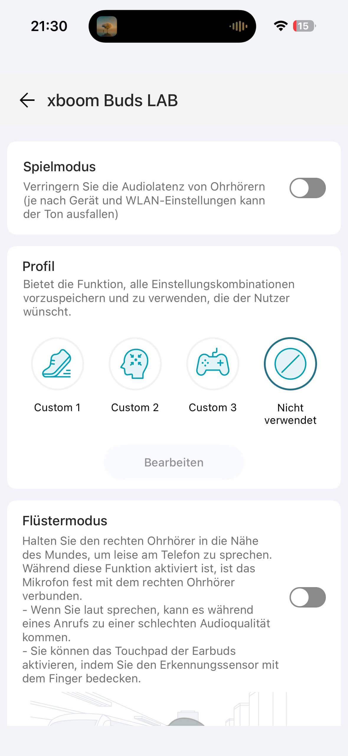 Es gibt einen Gaming-Modus, mit verringerter Latenz und Profile, bei denen gewisse Einstellungskombinationen aus dem Bereich ANC, Latenz, Touch und Equalizer zusammengeführt und mit einem Aufruf aus der App heraus aktiviert werden können.