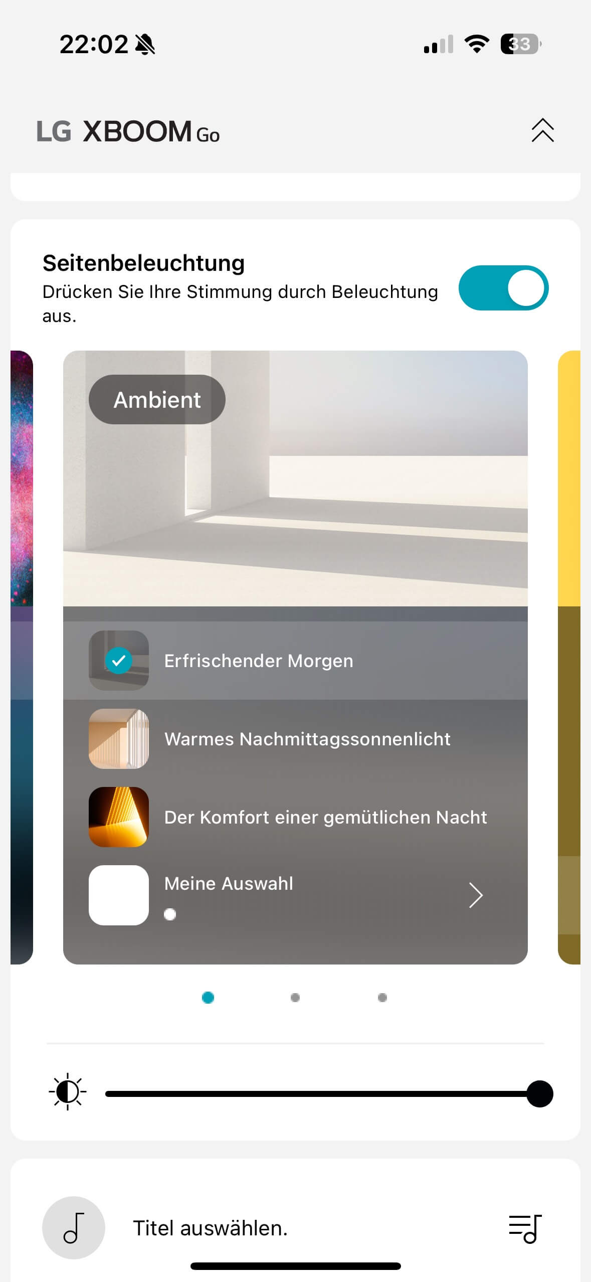 Um alles aus der Box zu holen, ist die LG XBOOM-App die zentrale Anlaufstelle. Hier werden Updates gefahren, die Sprachansagen und Signaltöne deaktiviert und ein Sleep-Timer eingestellt. Darüber hinaus gibt es einen Klangregelbereich, in welchem zwischen Standard, Soundboost und einem 6-Band-Equalizer gewählt werden kann. Im Bereich Seitenbeleuchtung kann man zwischen drei Lichtshow-Temperamenten (Party, Ambient, Nature) mit jeweils drei Varianten wählen. Die haben dann so klangvolle Namen wie »Fröhliches Feiern«, »Der Komfort einer gemütlichen Nacht« oder »Sanftes Flattern«. Darüber hinaus lassen sich dann noch in einer Farbpalette eigene Farben festlegen, in denen die Leuchtmittel flackern, pulsieren oder wabern sollen. Viel Spaß beim Spielen.
