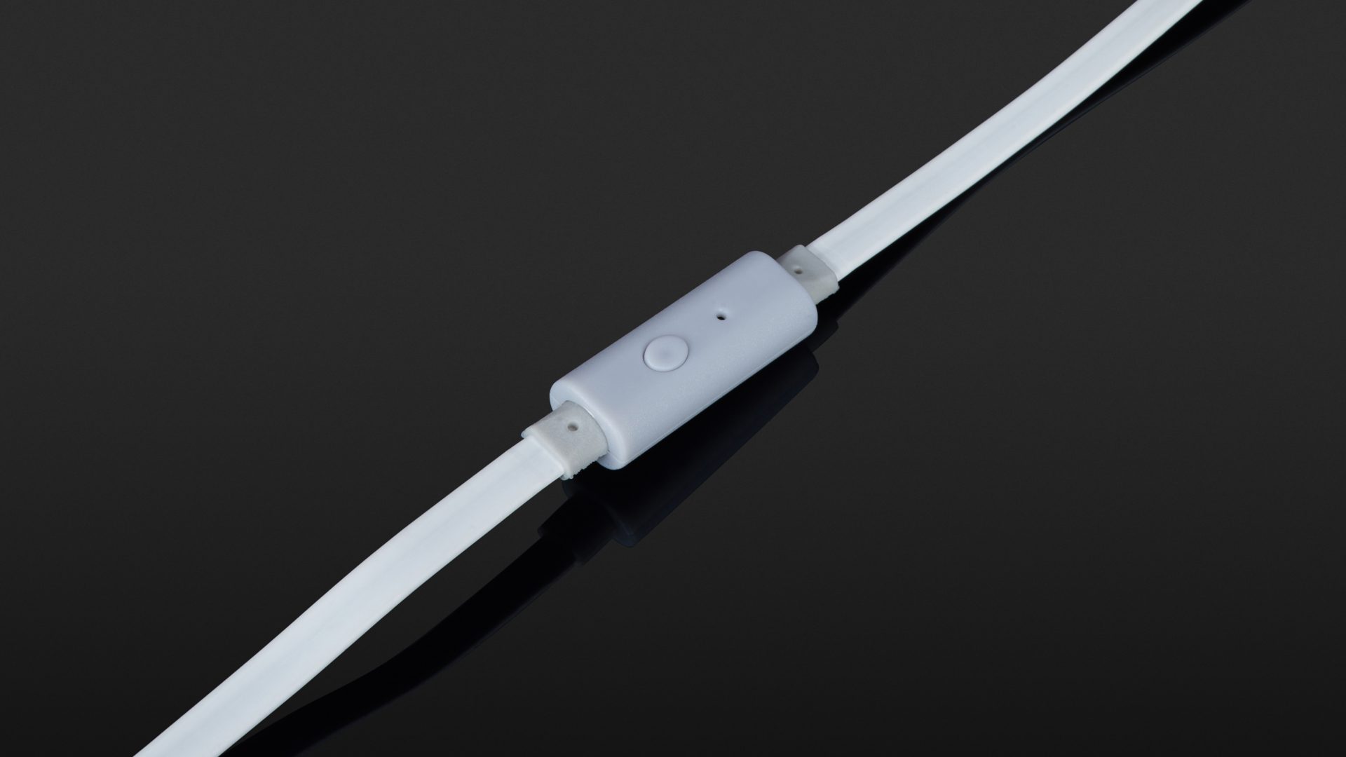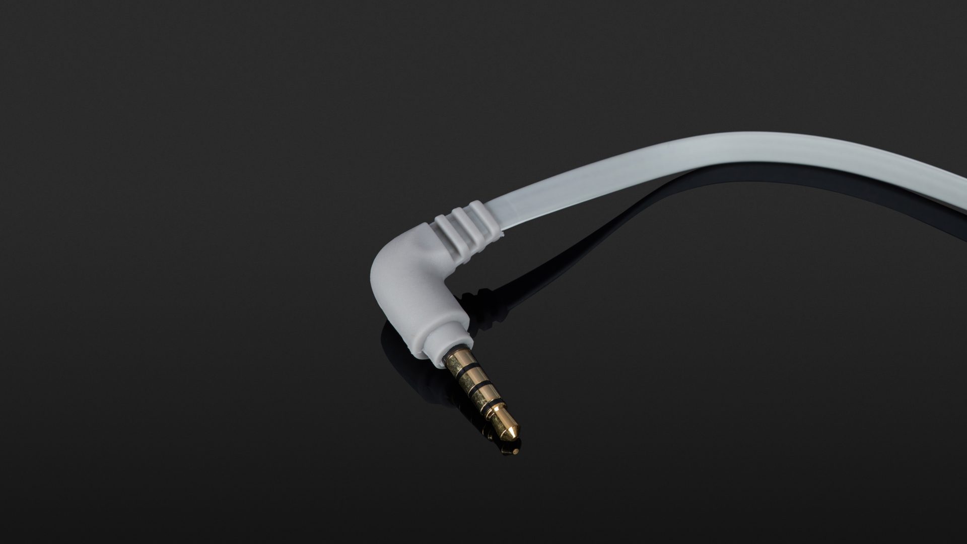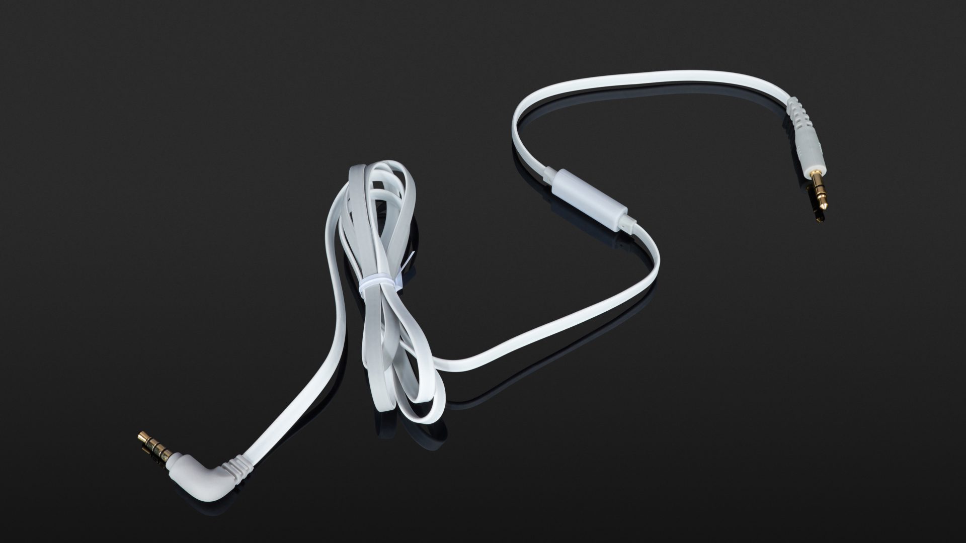 Mitgeliefert wird ein hellgraues, 125 cm langes Flachband-Klinkenkabel mit Freisprecheinrichtung und Ein-Knopf-Fernbedienung, das leider bei kleinsten Bewegungen raschelt und gerne hochwertiger wirken dürfte. Positiv ist, dass dieses flache Kabel keinen Kabelsalat mehr serviert. Dank der Anleitung findet man schnell die Funktionen der 1-Button-Fernbedienung heraus. Außerdem im Lieferumfang enthalten ist eine weiße Tasche, die genügend Stauraum für den gefalteten Kopfhörer und das Kabel bietet.