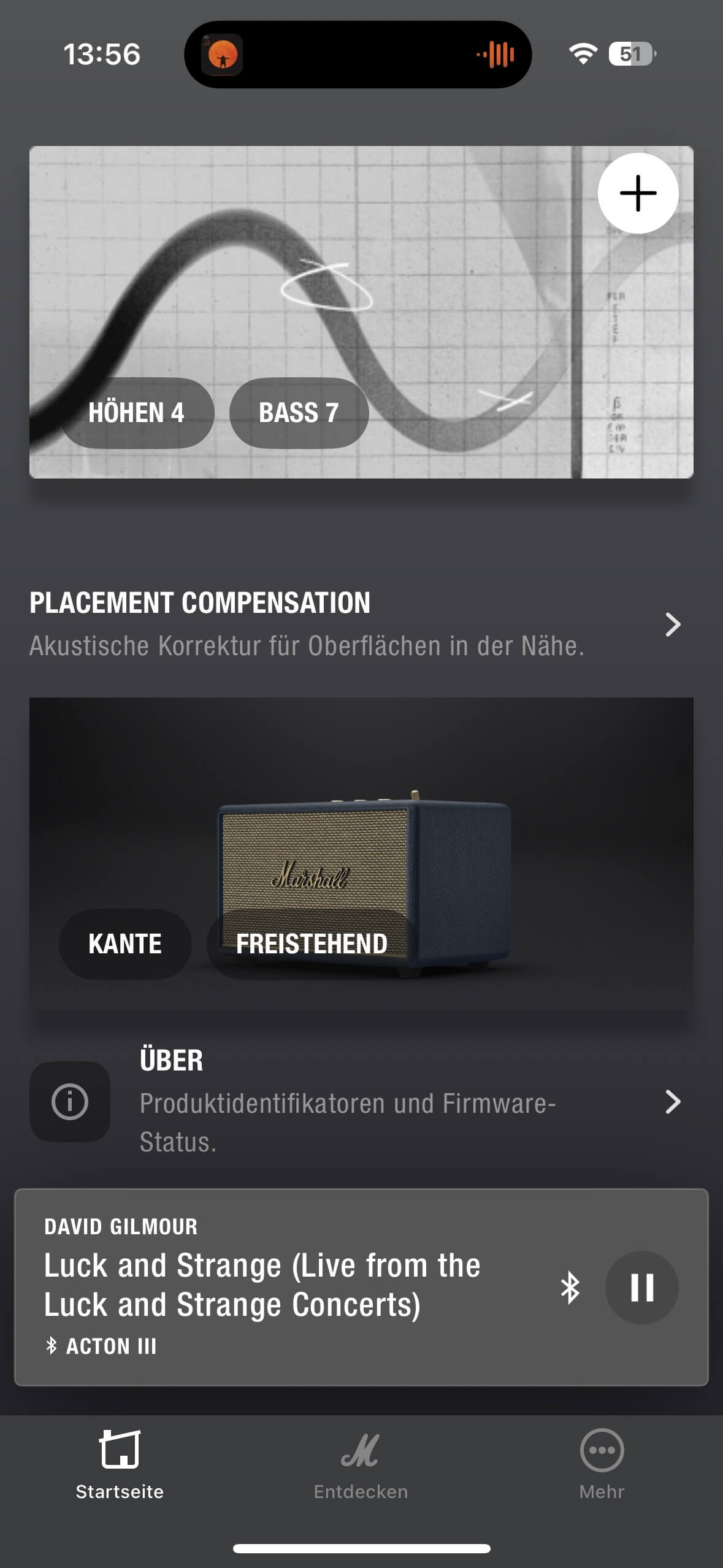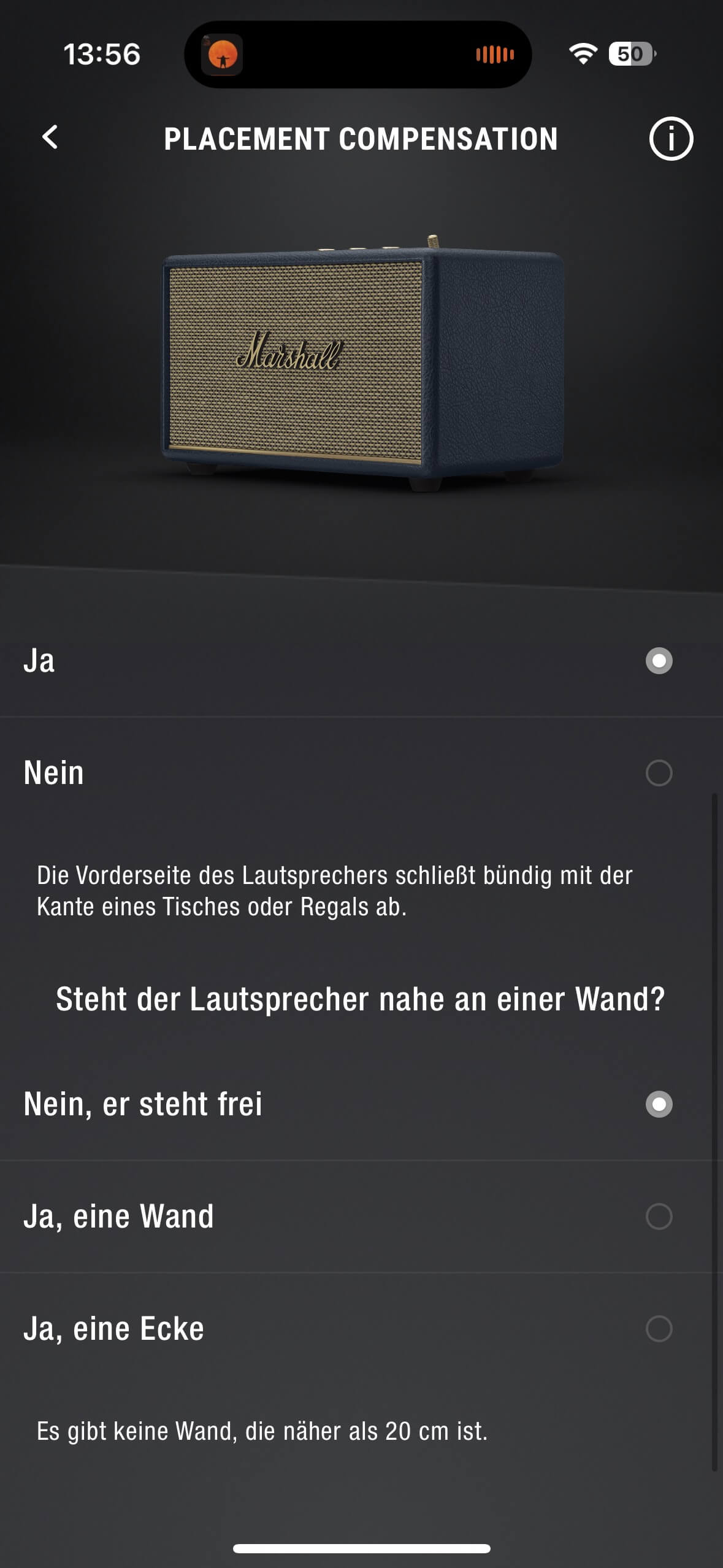 Installiert ihr die App, bekommt ihr – neben Bass- und Höhen-Remote-Regelung – eine Update-Funktion und die Placement Compensation, bei der ihr festlegt, wo die Box steht. Das führt zu feinen Klanganpassungen. Mehr ist für den Betrieb der Marshall Acton III nicht vorgesehen – und auch nicht erforderlich.