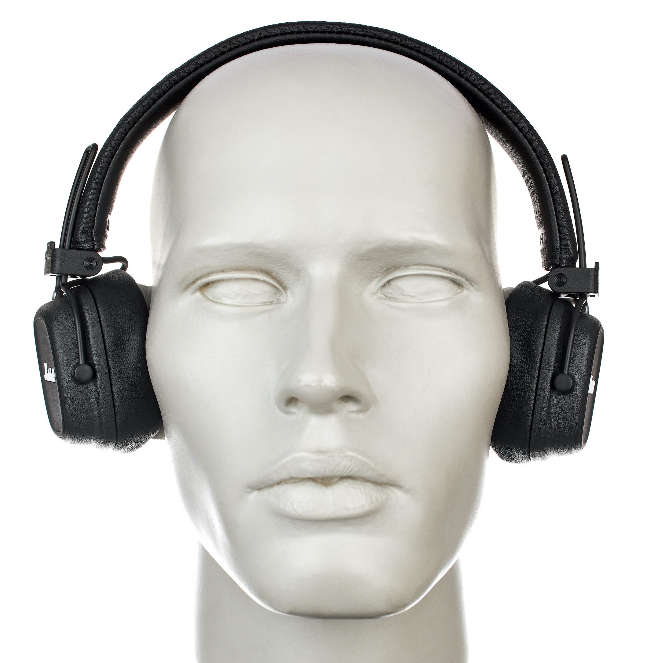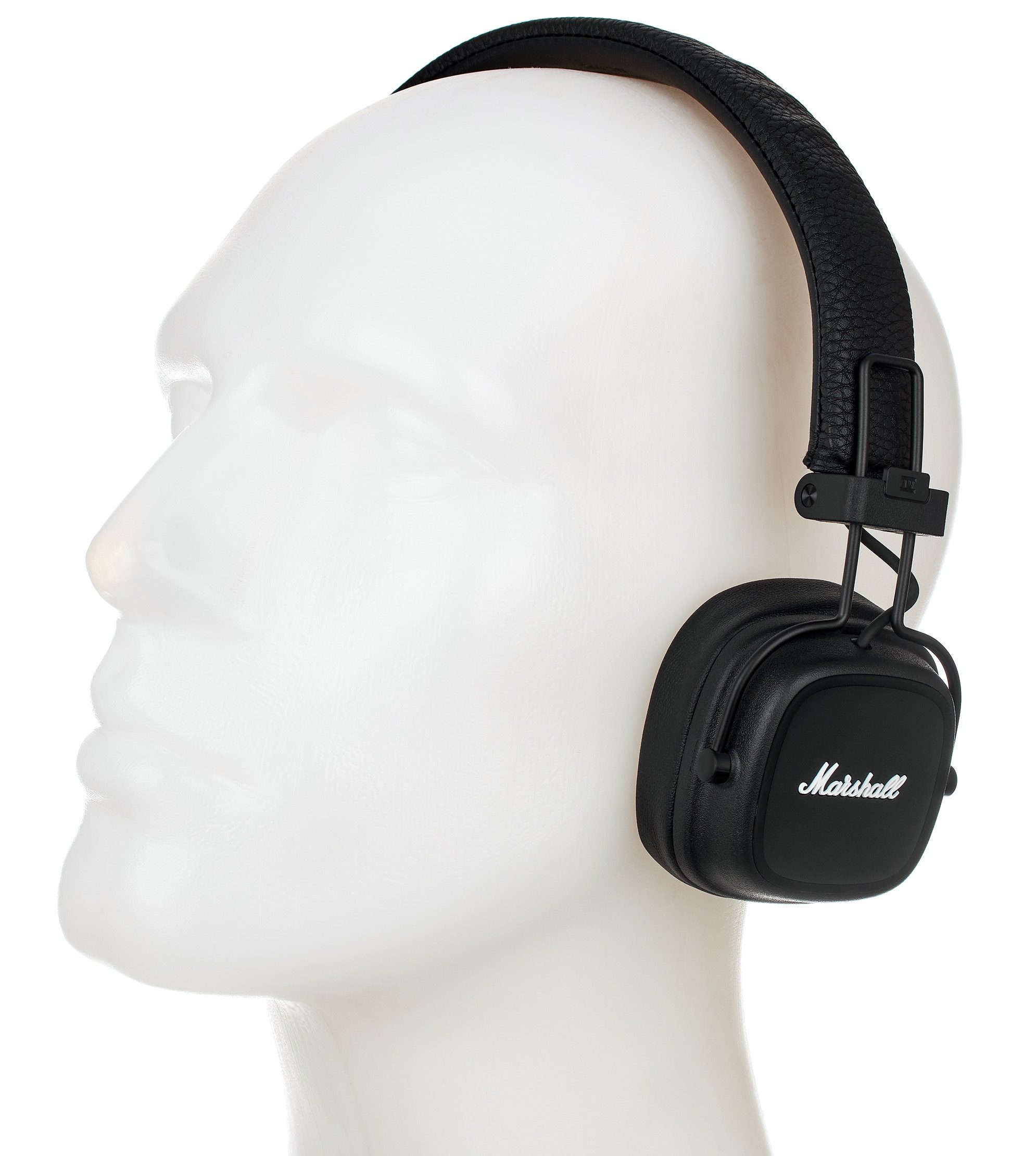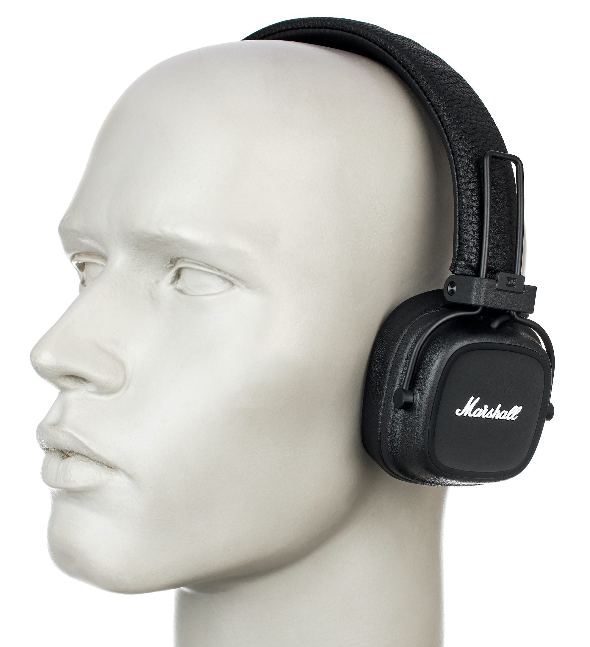 Einst stand der Modellname Major für Marshalls legendären Gitarren-Verstärker aus dem Jahre 1967. Sein Kopfhörer-Pendant tritt seit der Markteinführung 2011 erfolgreich in seine Fußstapfen, um jüngst in vierter Generation in den Genuss einer technische Frischzellenkur zu kommen. Dagegen bleibt sich der Kopfhörer beim schwarzen Design mit geschlossenen Kapseln aus strukturiertem Vinyl, deren rechteckige Form samt typischen Schriftzug an einen Marshall-Amp erinnert, treu. Die sehr weich gepolsterten Kapseln hängen in Metall-Spangen gelenkig um die x-Achse gelagert und klemmen als stufenlose und nicht einrastende Verlängerung herausziehbar in einem einklappbaren Faltclip. Der äußerst flexible Bügel besteht fühlbar aus zwei Schichten, die komplett über die Länge von gepolstertem Kunstleder ummantelt sind.