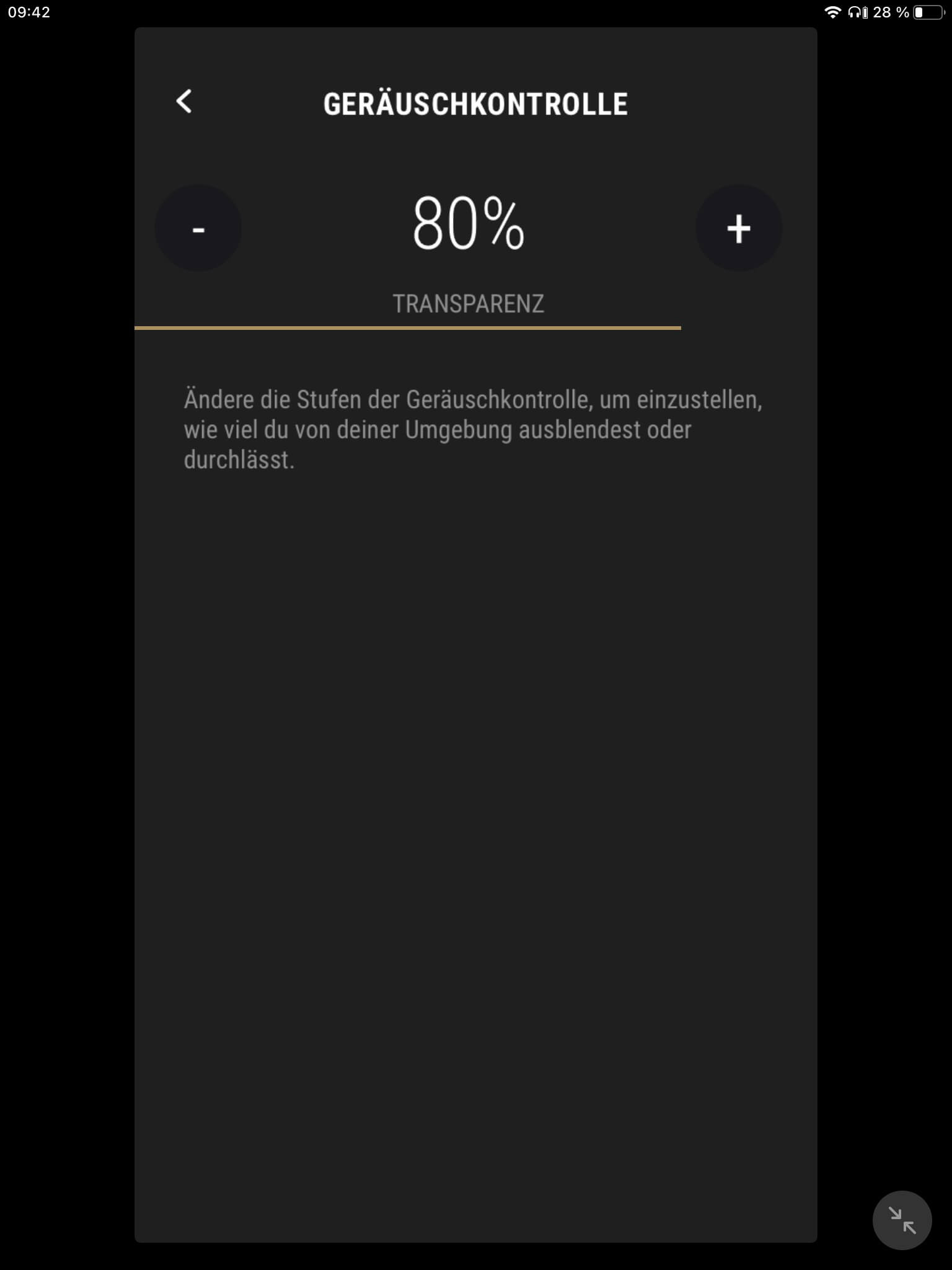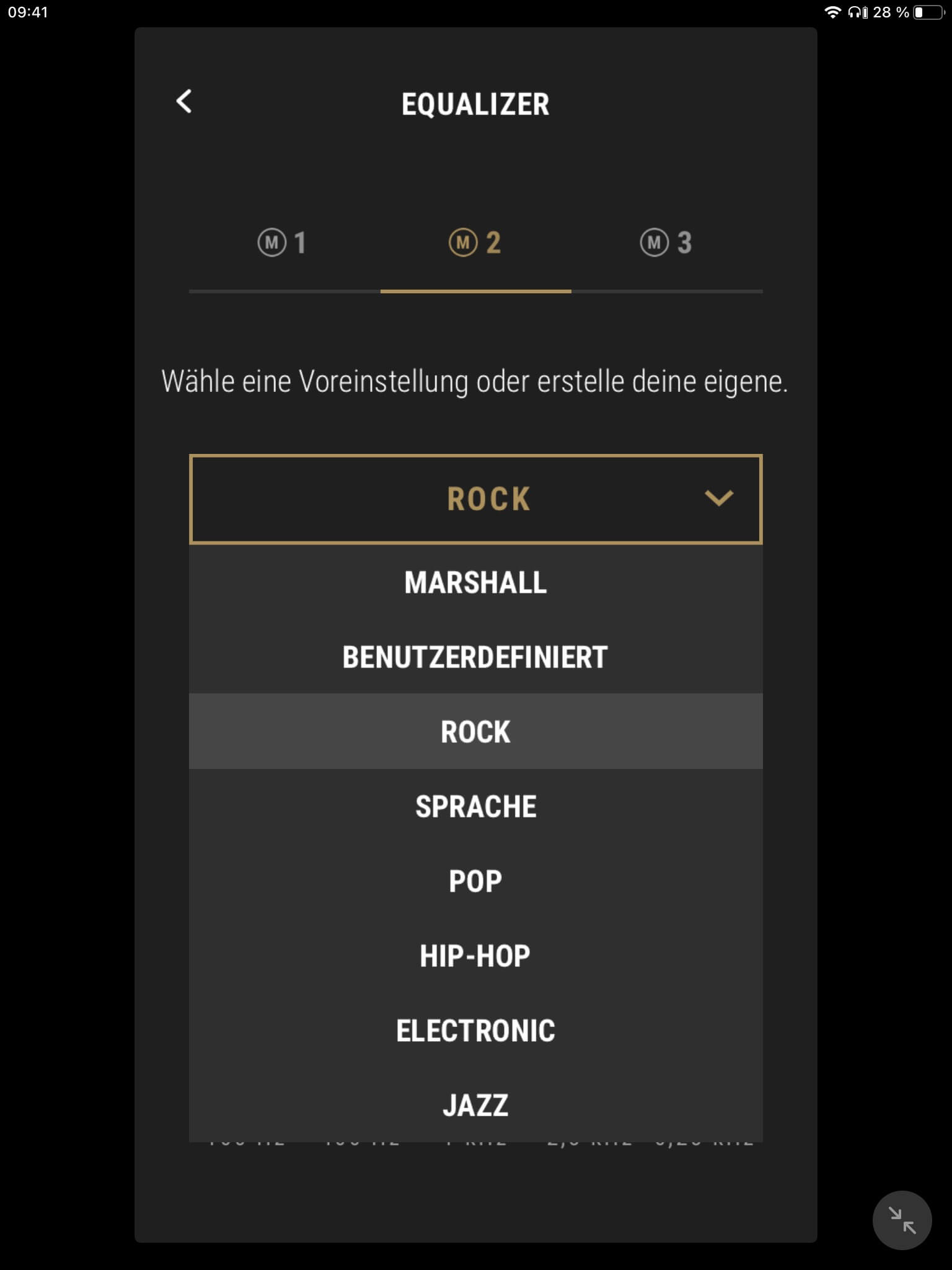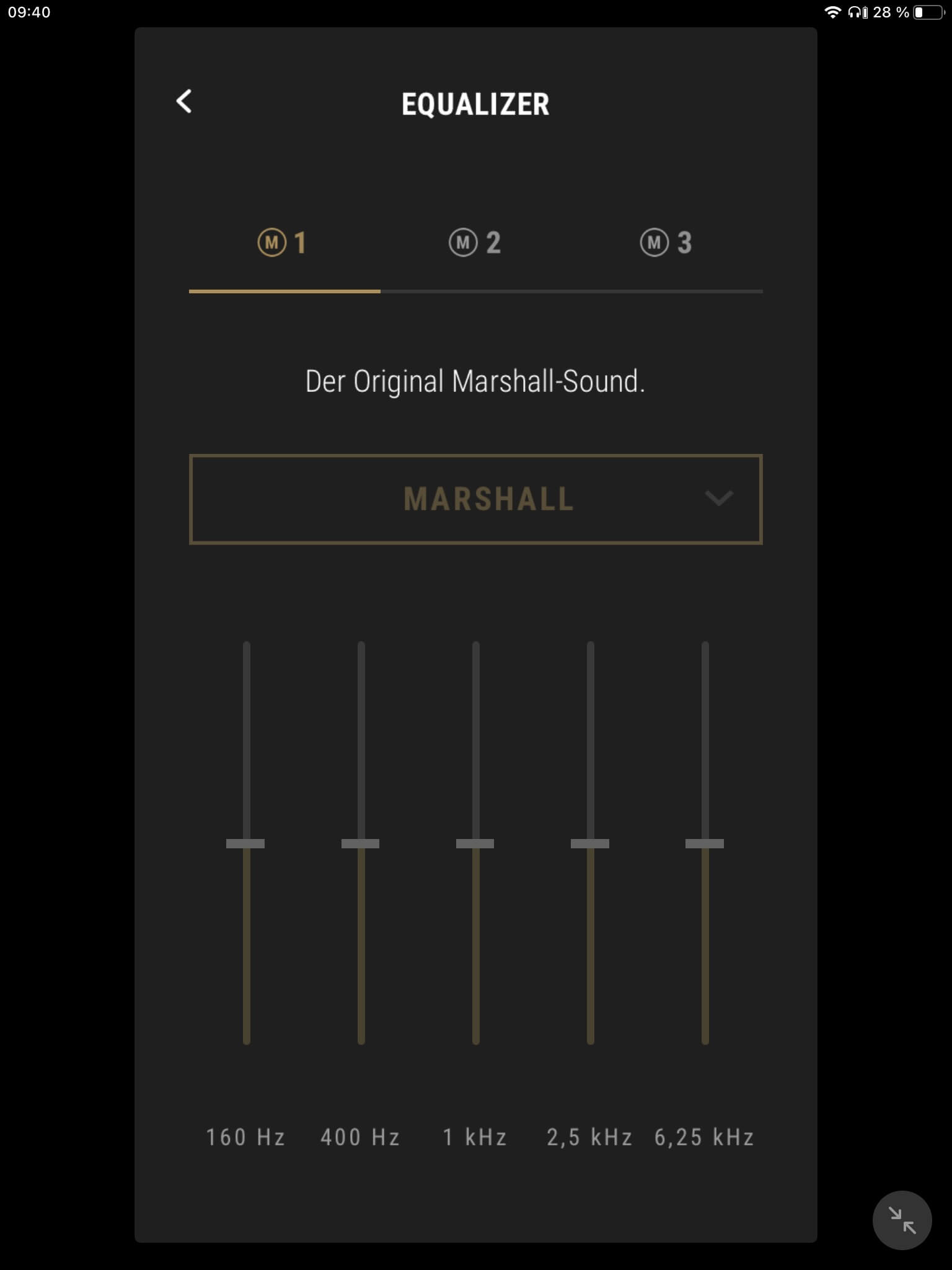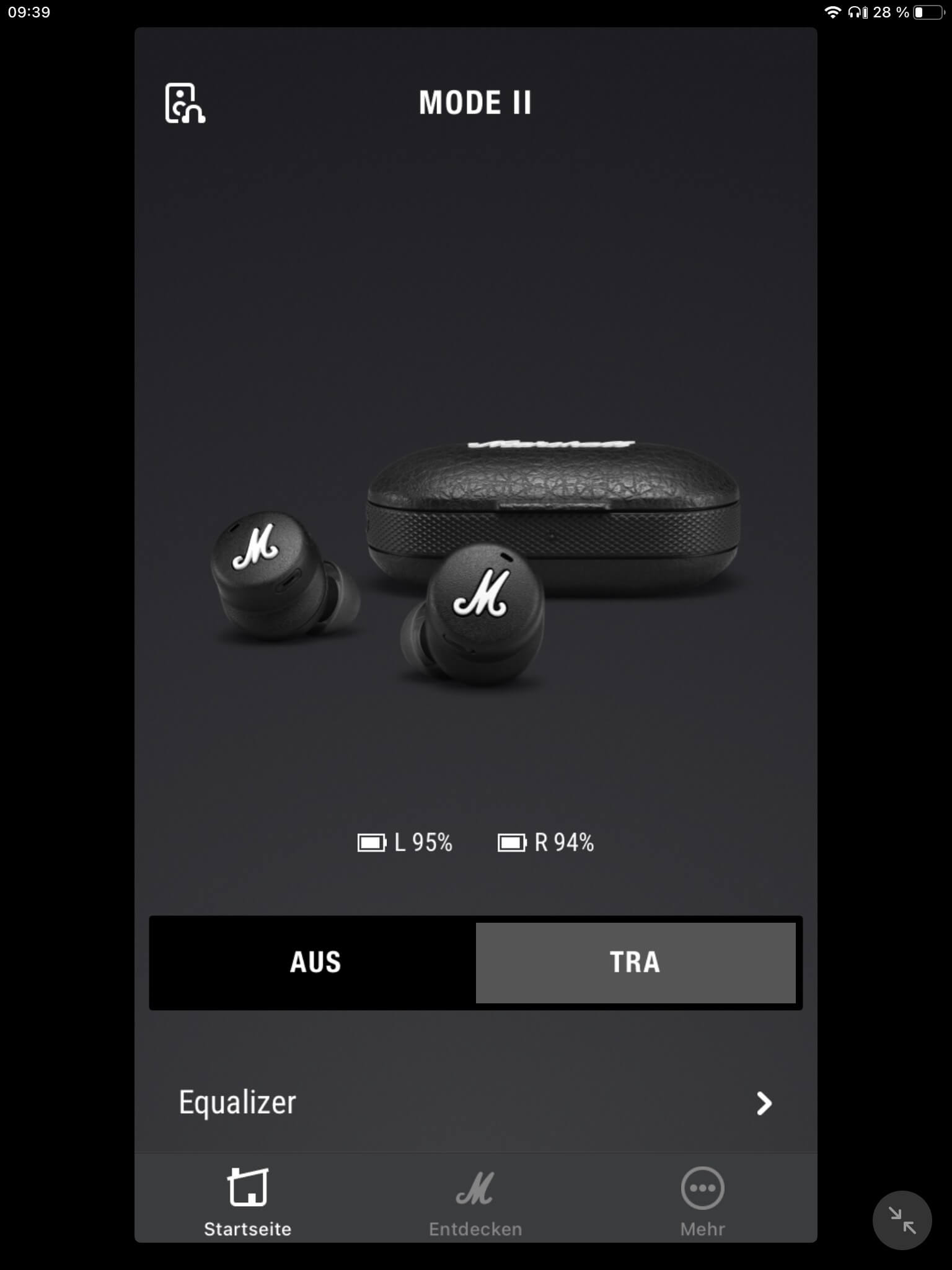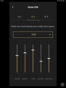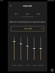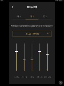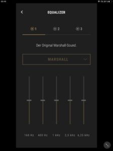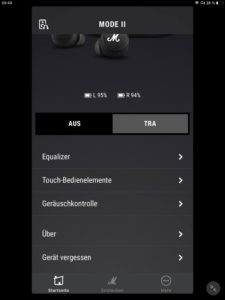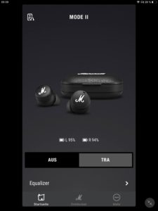 Die App-Anbindung (Android und iOS) der Marshall Mode II ist mit einem EQ zur Klangregelung ausgestattet, wobei mit „Rock“, „Sprache“, „Pop“, „Hip-Hop“, „Electronic“ und „Jazz“ neben dem Grundklang sechs vorkonfigurierte Presets zur Auswahl stehen. Ein weiterer Speicherplatz ist zudem für eigene Einstellungen vorgesehen. Darüber hinaus kann der Transparenzmodus anhand von zehn Stufen justiert und (de-)aktiviert werden. Auch Firmware-Updates lassen sich per App vornehmen, die ebenfalls über eine separate Akkustandsanzeige für beide Hörer verfügt. Diese ist jedoch wenig aussagekräftig und erscheint verbesserungswürdig, da ab einem Wert von 50 Prozent lediglich 30 Minuten Hörzeit verbleiben.