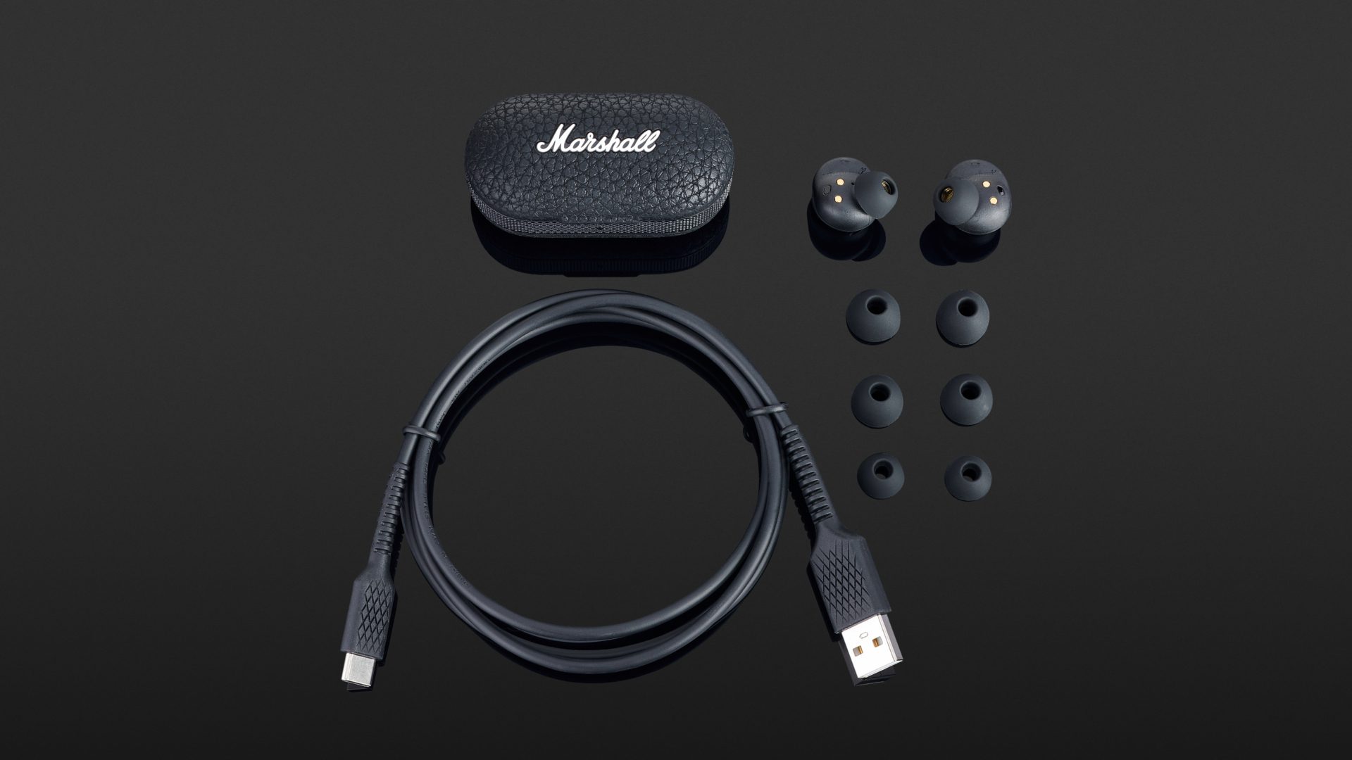 Im Standard-Betrieb erreichen die Marshall Mode II bei gehobener Lautstärke eine Laufzeit von vier Stunden und 40 Minuten pro Ladung. Diese verkürzt sich auf vier Stunden, wenn der Umgebungsmodus genutzt wird. Dabei können die In-Ears im Case drei Mal vollständig und ein weiteres Mal zu 70 Prozent aufgeladen werden, so dass die Gesamtlaufzeit im Grundmodus 21 Stunden und 40 Minuten beträgt, während im Transparenzmodus 18 Stunden und 45 Minuten zur Verfügung stehen. Obwohl die Hörer eine eher geringe Akkulaufzeit bieten, was unter anderem auf das geringe Gewicht und die kleinen Gehäuse zurückzuführen sein dürfte, benötigt ein Ladezyklus fast zwei Stunden. Für längere Reisen erscheint das System daher nicht unbedingt geeignet. Die Akkureserve des Cases ist über den vorhandenen USB-C-Anschluss hingegen nach 60 Minuten wieder hergestellt, wozu sich ein USB-C auf USB-A-Ladekabel mit einer Länge von 100 Zentimetern im Lieferumfang befindet. Alternativ unterstützt das Case auch ein drahtloses Laden via Qi.