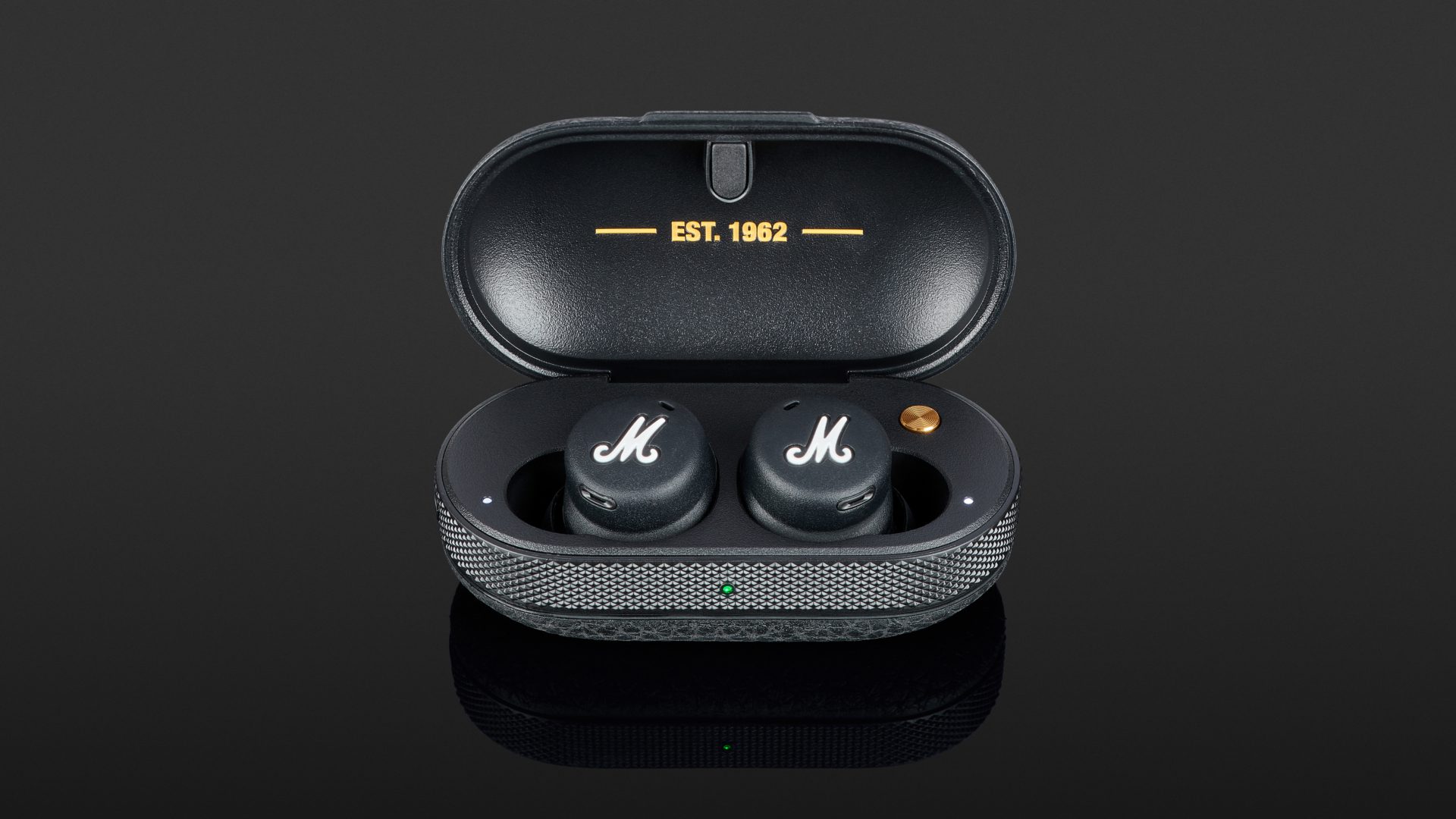 Trotz des Miniaturformats von Hörern und Lade-Case wurde nicht auf das firmentypische Design im Look der berühmten Gitarrenverstärker verzichtet, was die Marshall Mode II zu einem optischen Blickfang macht. Dabei kann das Case mühelos von einer Hand umschlossen werden und bringt gerade einmal 35 Gramm auf die Waage, während die In-Ears mit fünf Gramm pro Seite einen komfortablen Sitz begünstigen. Dieser ist auch recht stabil, da sich die runden, flach gehaltenen Gehäuse vollständig in die Ohrmuscheln einbetten und nicht hervorstehen, so dass die Hörer bedenkenlos unter einer Mütze Platz finden. Als weitere Besonderheit sind sowohl das Lade-Case als auch die In-Ears wasserbeständig verarbeitet, was das System bei Outdoor-Aktivität vor witterungsbedingter Nässe schützt. Während das Case über eine IPX4-Zertifizierung verfügt, erfüllen die Hörer die Voraussetzungen der IPX5-Schutzklasse.